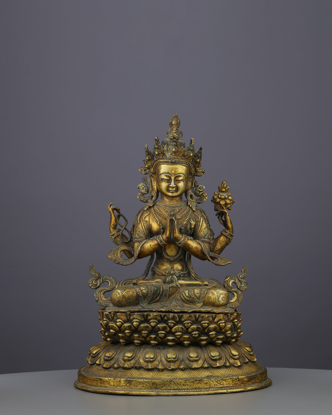 This magnificent four-armed Chengresi statue exemplifies centuries-old Nepalese craftsmanship, where divine artistry meets spiritual devotion....