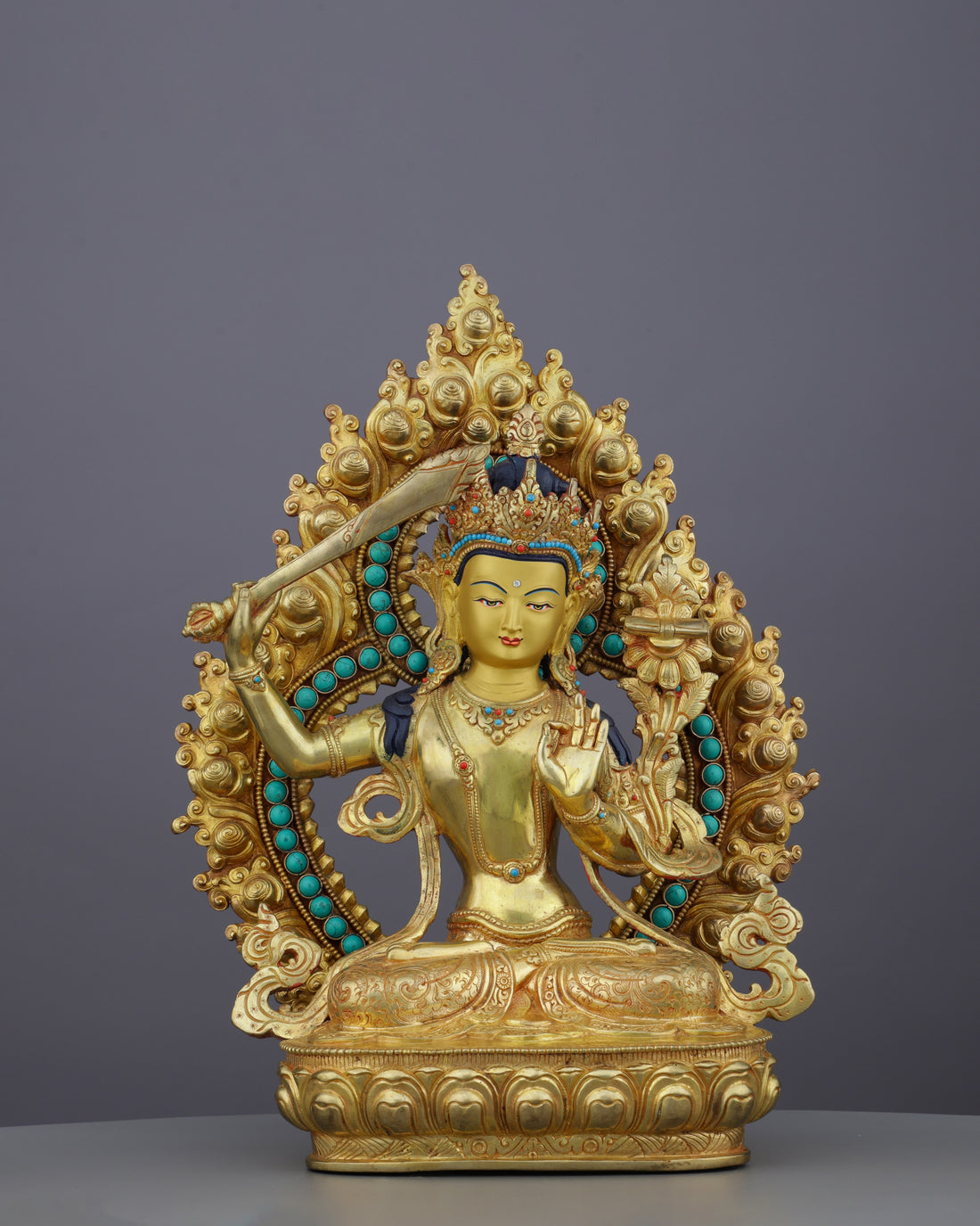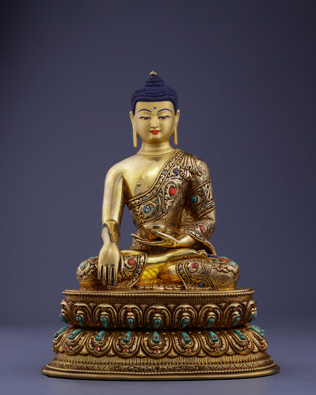A masterfully handcrafted copper sculpture adorned with shimmering gold, vibrant gemstones, and intricate traditional artistry...