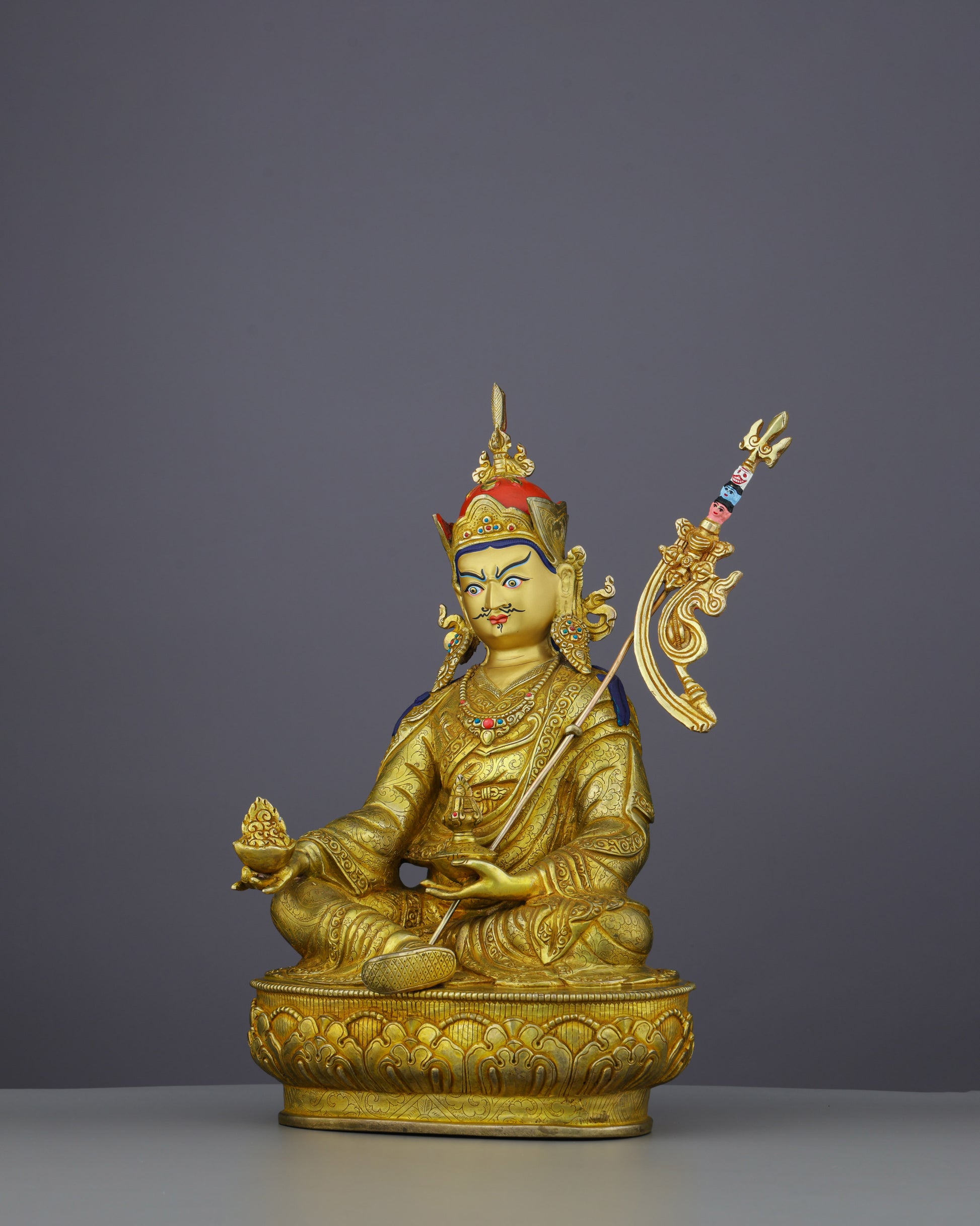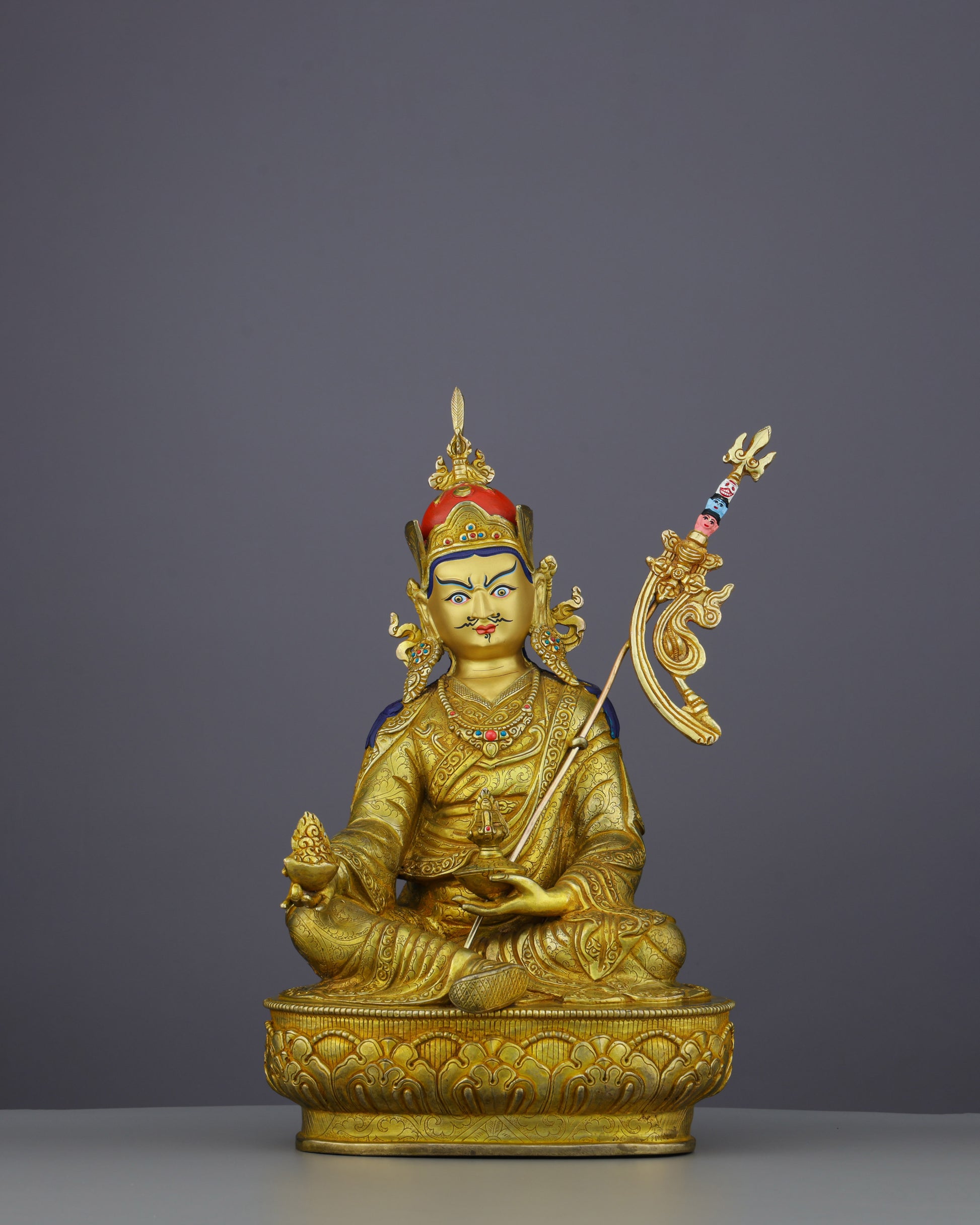 The statue depicts Guru Orgyen Norlha seated in royal ease upon an ornate lotus throne, embodying enlightened sovereignty. His penetrating gaze, framed by the distinctive curled mustache and piercing eyes, radiates wisdom and wrathful compassion. The left hand holds an ornate khatvanga (tantric staff) symbolizing spiritual mastery, while the right hand cradles a treasure vase overflowing with jewels, representing inexhaustible abundance. His elaborate crown and richly detailed robes demonstrate exceptional artistic mastery.