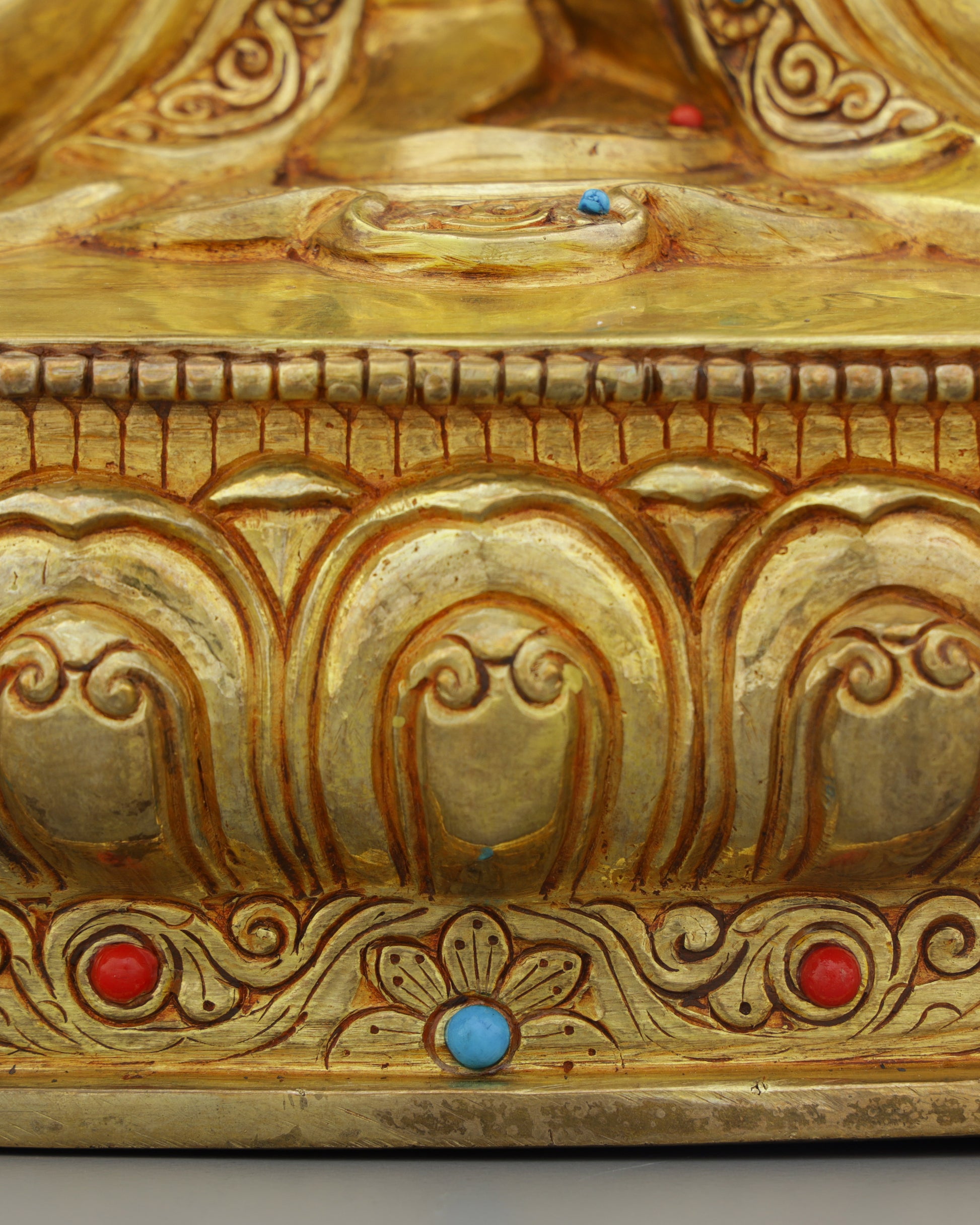 This exceptional Medicine Buddha statue represents the devotion of Himalayan artistry and spiritual craftsmanship. The robust copper body ensures lasting durability while serving as an excellent conductor of healing energy. The brilliant 24K gold gilding creates a luminous aura that symbolizes the Buddha's radiant healing light. Precious turquoise and coral inlays, meticulously set into the ornate base and robes, add authentic traditional beauty while representing the natural elements of healing. The hand-applied gold and acrylic paintings capture every delicate detail, from the serene facial features to the flowing meditation robes. Weighing nearly 9 pounds and standing over 13 inches tall, this substantial piece commands reverence while emanating peaceful healing energy.
