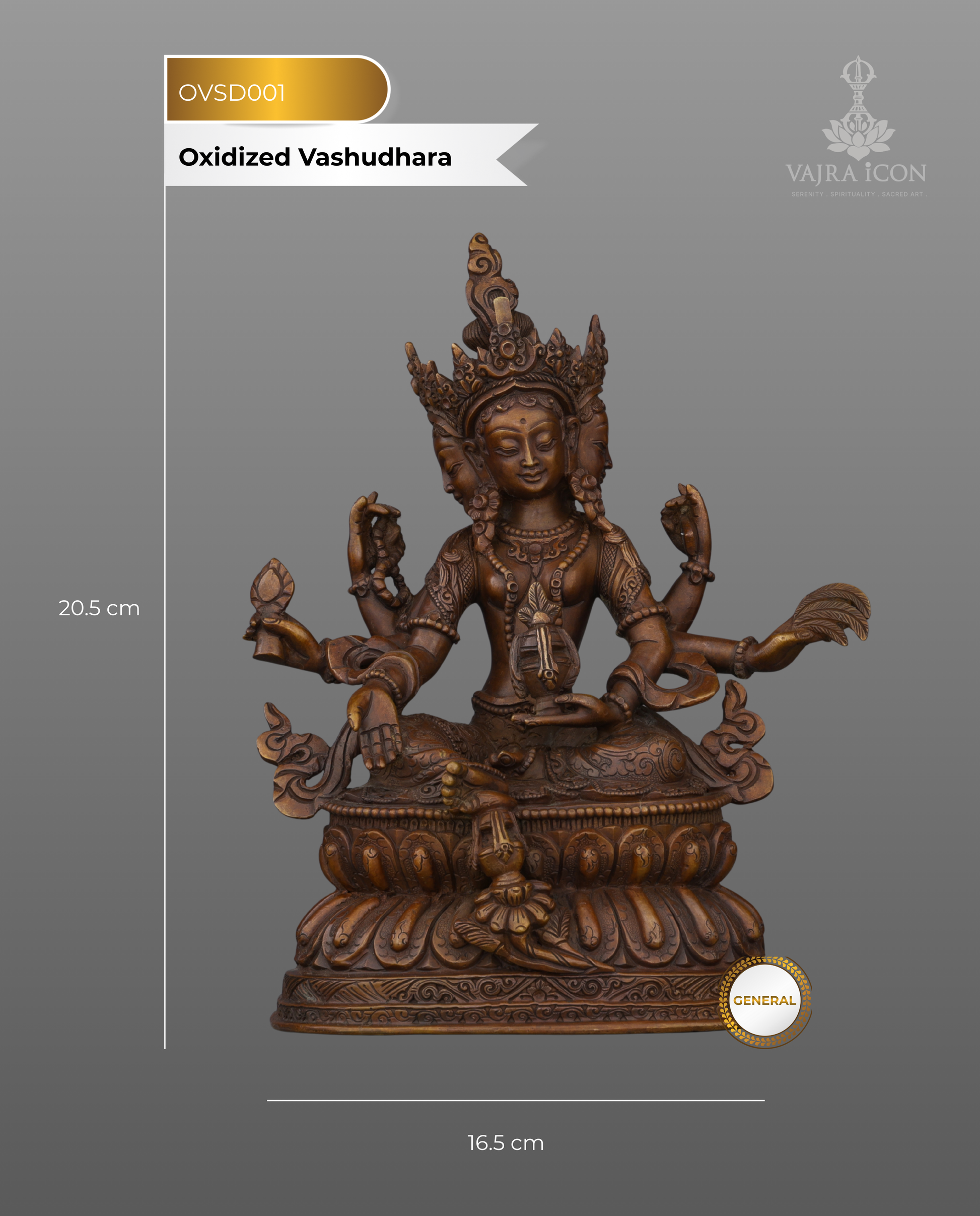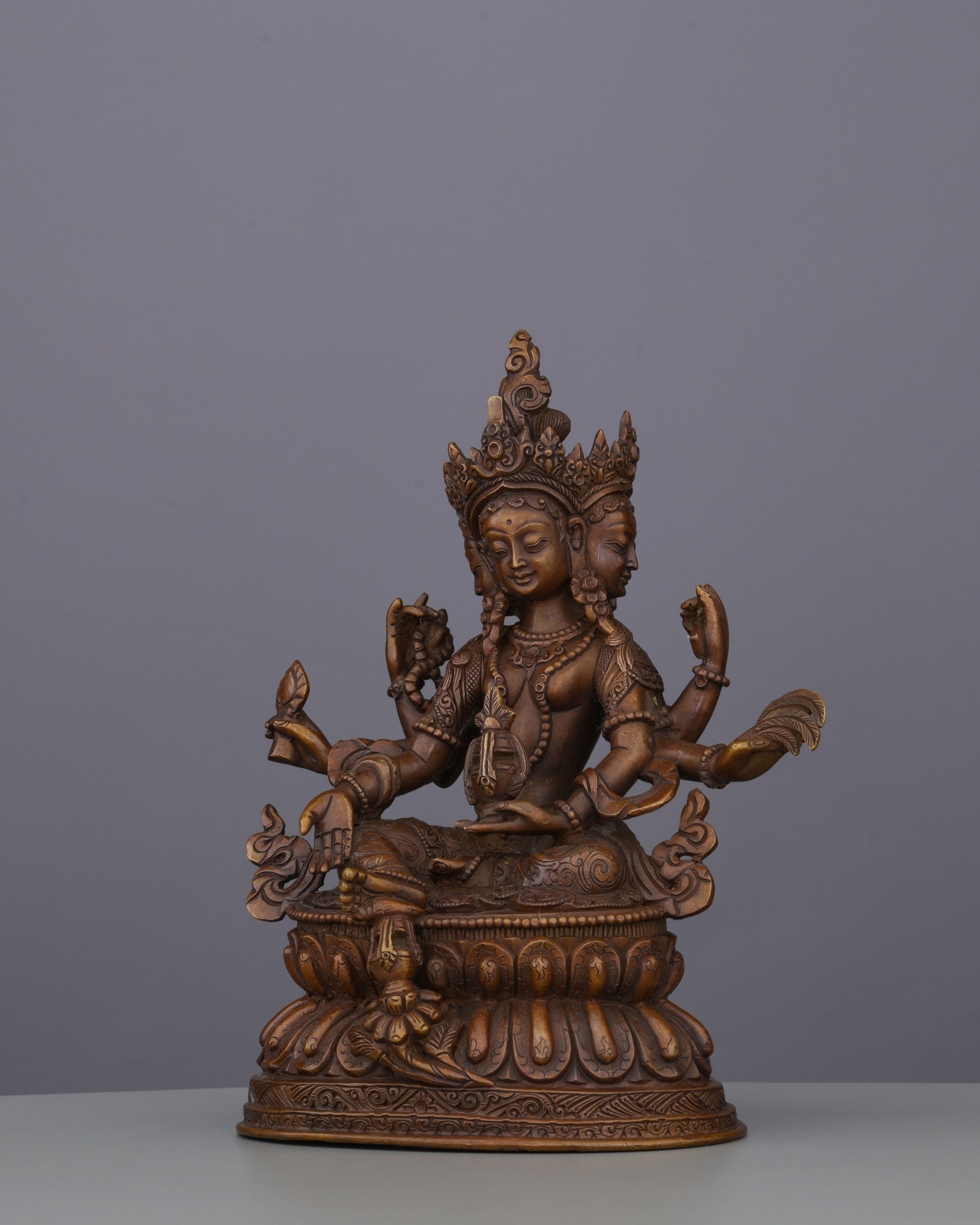 This exceptional Vasudhara statue showcases exquisite artistry through its antique oxidized copper finish that creates depth and timeless elegance. The intricate hand-carved details bring every element to life—from the elaborate crown featuring multiple Buddha heads to the ornate jewelry, flowing garments, and meticulously rendered facial features. Each of the six arms displays distinct hand gestures and attributes with remarkable precision. The double lotus throne features detailed carvings that demonstrate extraordinary skill. This substantial 1.48 kg masterpiece combines authentic iconography with museum-quality finishing, creating both a powerful meditation focus and stunning decorative treasure.