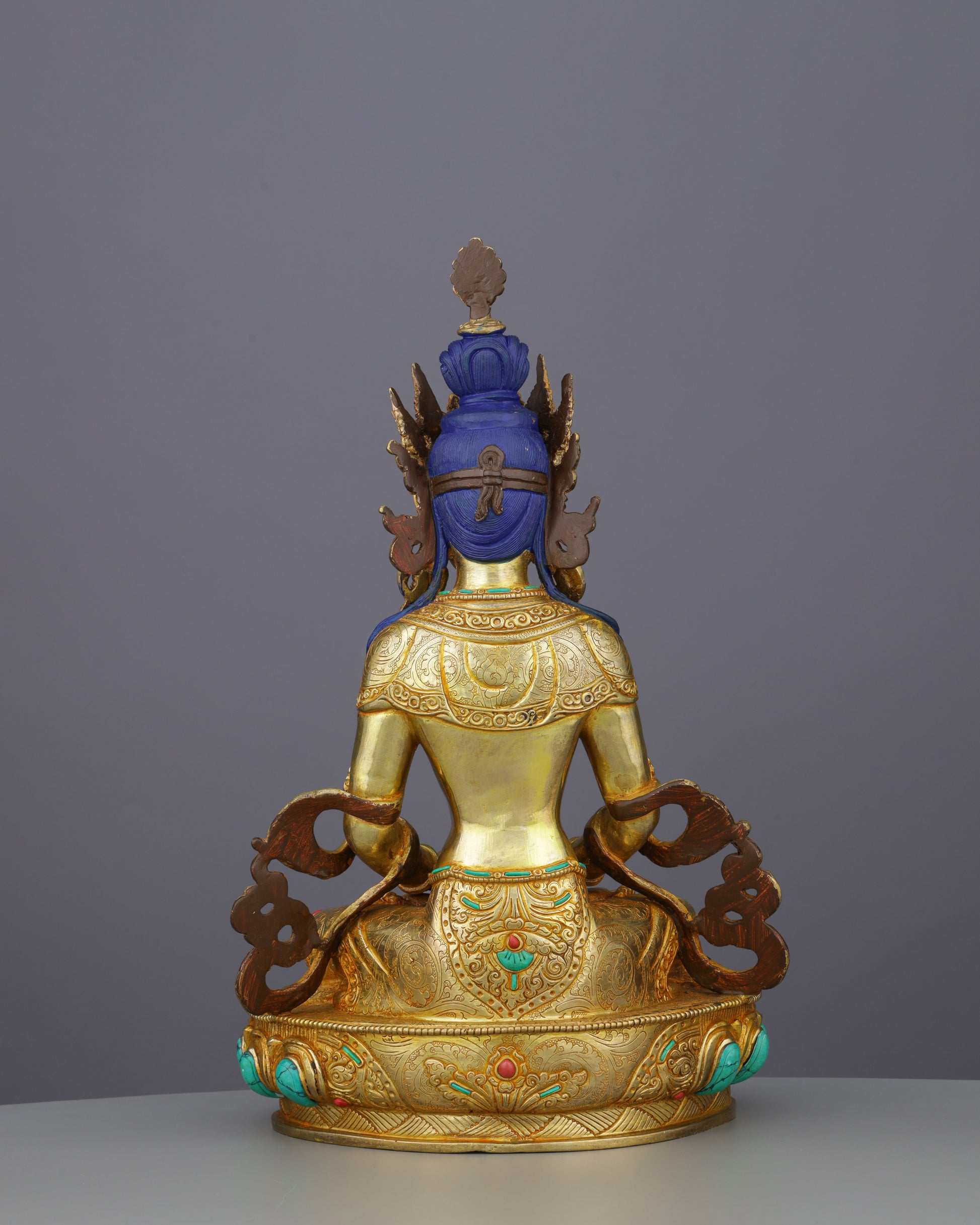The statue captures Amitayus in serene meditation posture, seated in lotus position upon a lotus throne. His peaceful countenance features half-closed eyes representing inner contemplation and enlightened awareness. The hands rest gracefully in dhyana mudra, cradling the kalasha (longevity vase) filled with the nectar of immortality. His golden body adorned with turquoise-inlaid jewelry and flowing robes demonstrates princely refinement, while the ornate five-pointed crown symbolizes transcendent wisdom.