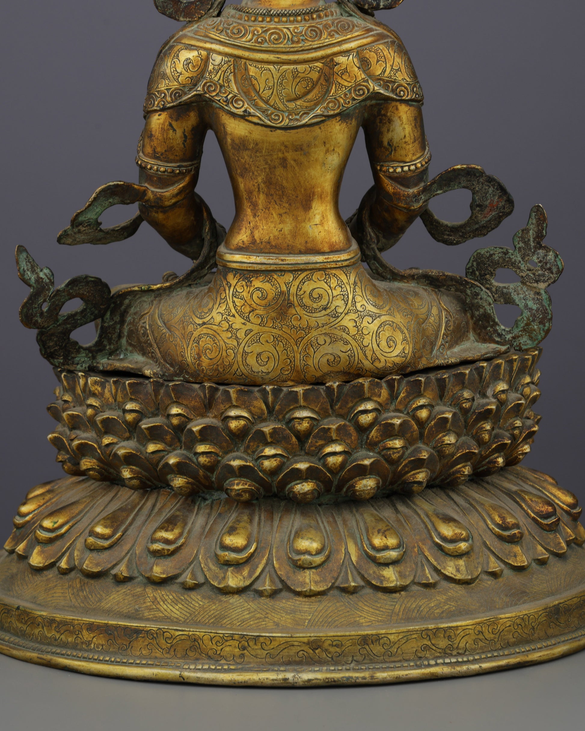 This exceptional Amitayus statue represents the devotion of traditional Nepalese Buddhist artistry. The generous 37.4 cm height creates a commanding presence while maintaining perfect proportions that follow ancient iconographic guidelines. The 24K gold gilding showcases remarkable luster, catching light beautifully to create an ethereal glow that enhances any sacred space. The substantial 4.52 kg weight reflects solid copper construction beneath the gold, ensuring lasting durability and museum-quality heft. Every surface reveals meticulous hand-carved details—from the elaborate five-pointed crown to the ornate jewelry cascading across the chest and the intricate floral patterns embellishing the robes and lotus throne. The double-lotus base, with its layered petals rendered in stunning relief, demonstrates centuries-old techniques passed through generations of Kathmandu Valley artisans. The antique finish adds distinguished character, making each piece unique.