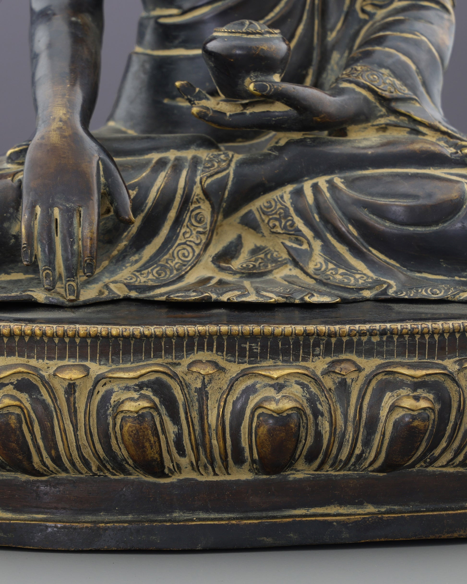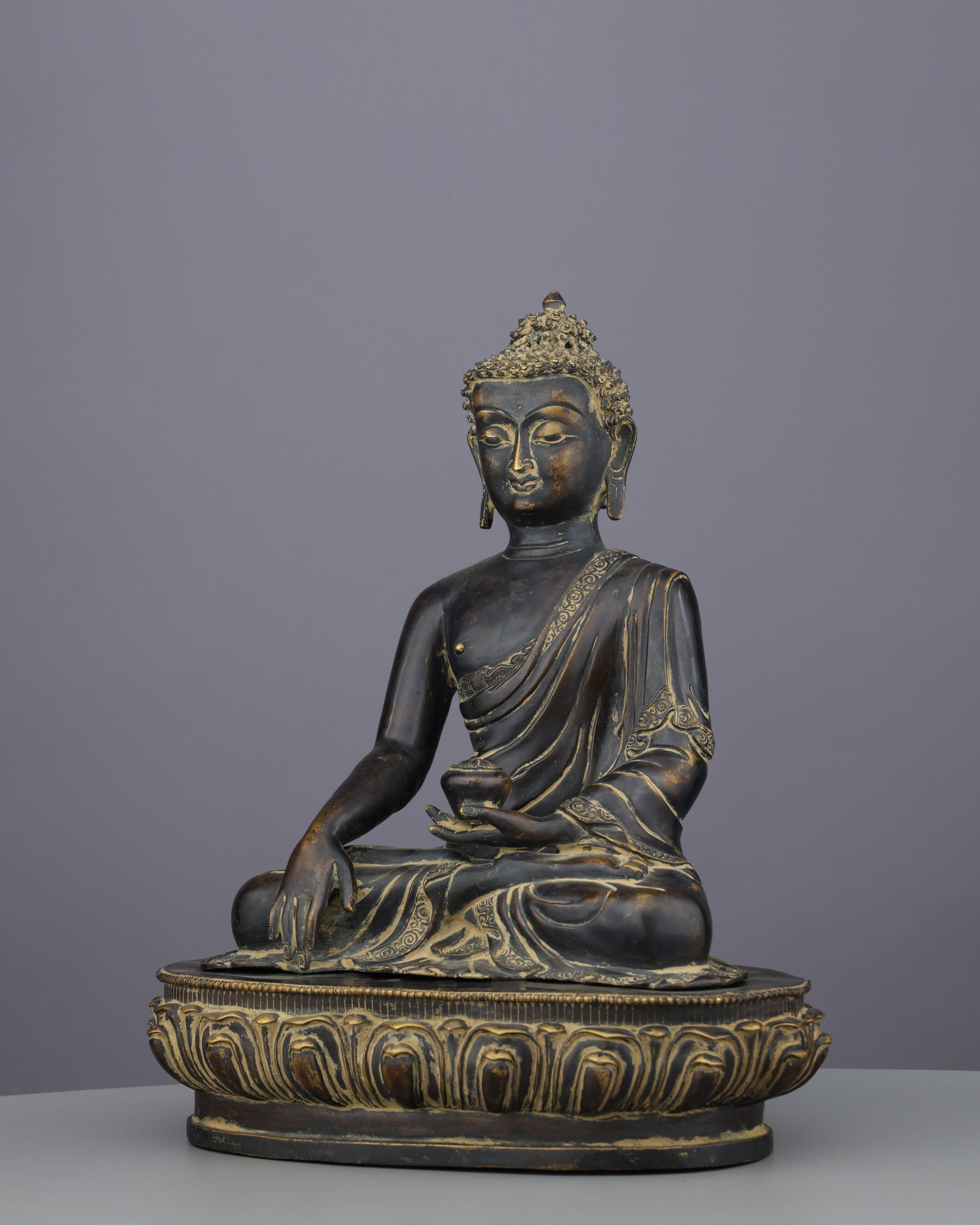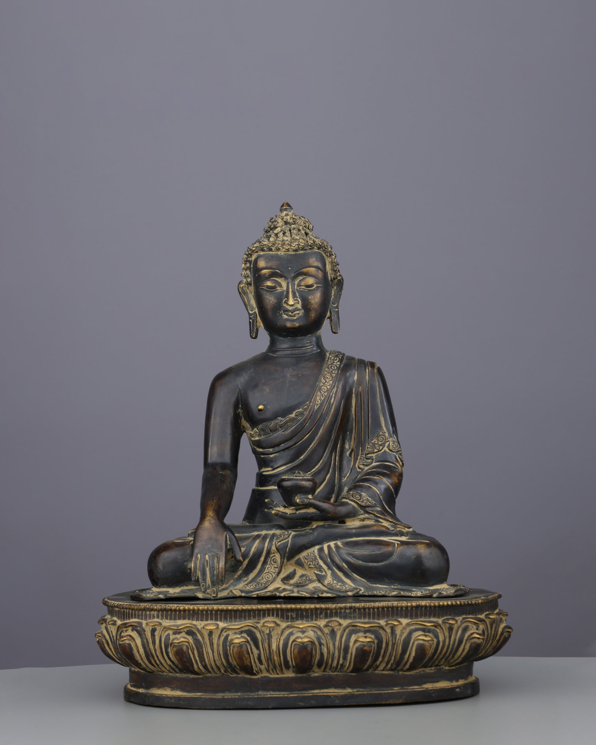 The Buddha sits in padmasana (lotus posture), symbolizing determination. His time-darkened, serene face reflects peace over suffering. Elongated earlobes recall his princely past and renunciation. The right hand performs the bhumisparsha mudra, touching earth to witness his enlightenment against Mara. The left hand, in dhyana mudra, holds an alms bowl, signifying meditation. Gracefully flowing, aged-gold-accented robes highlight the sculptor's mastery of fabric.