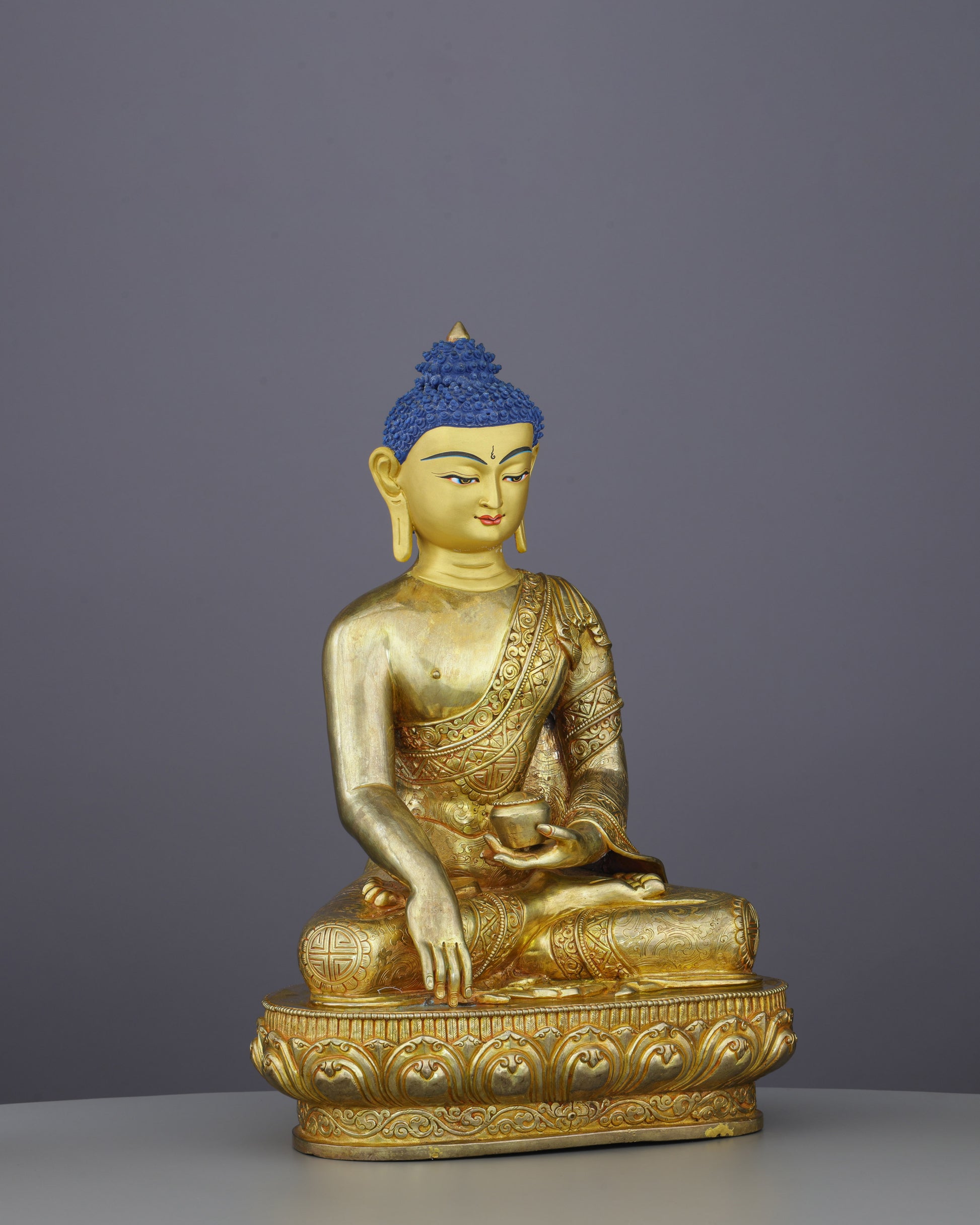 Sakyamuni's serene countenance displays half-closed eyes radiating profound wisdom and boundless compassion. His right hand extends in bhumisparsha mudra—the earth-touching gesture—calling the earth to witness his enlightenment, while his left hand rests in dhyana mudra holding an alms bowl, symbolizing meditation and renunciation. The blue painted ushnisha represents supreme wisdom, while the urna signifies spiritual vision. Seated in lotus posture upon an elaborate lotus throne, his form embodies the moment of perfect awakening.
