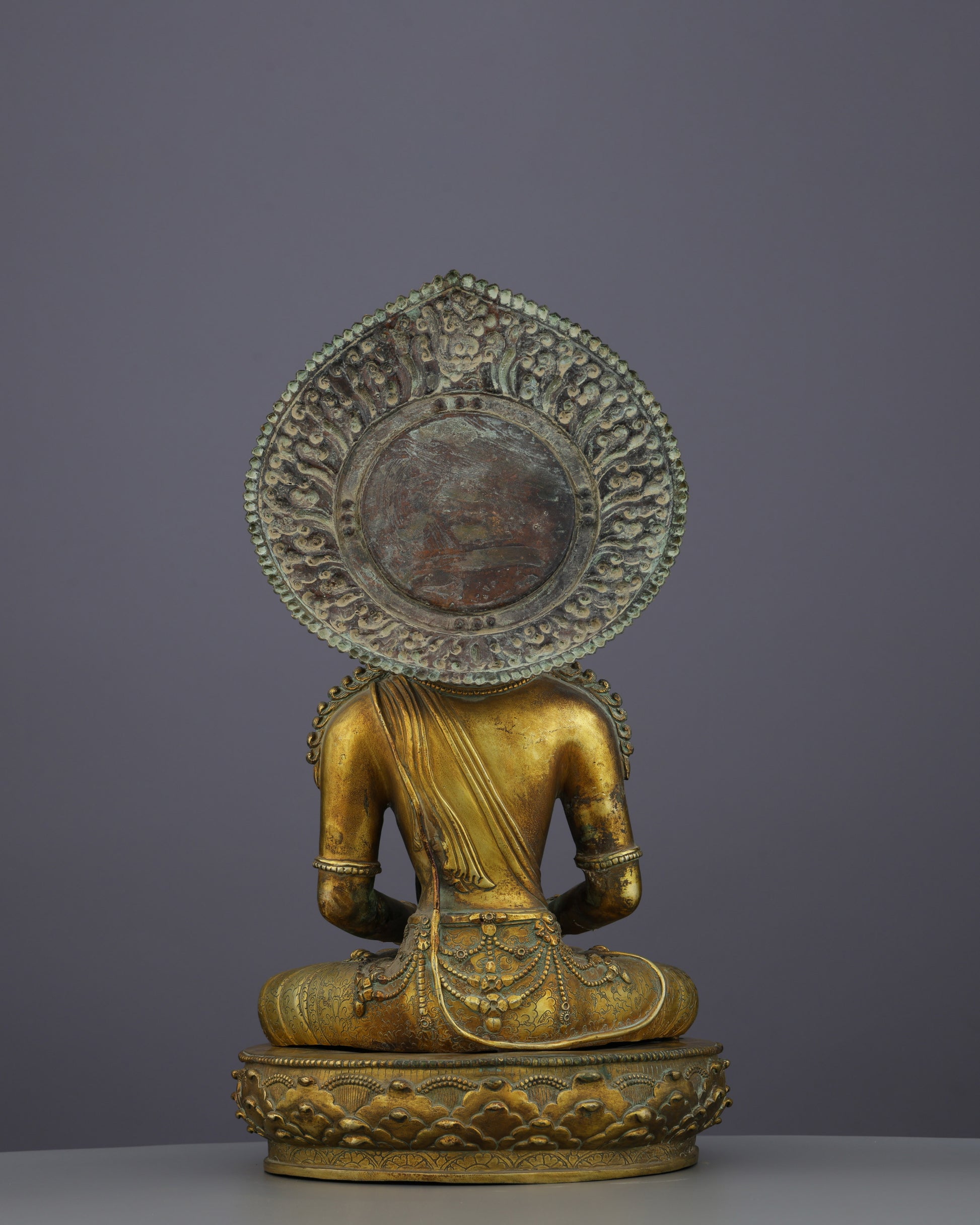 This exceptional antique Amitabha Buddha statue represents the pinnacle of traditional Himalayan artistry. The aged copper body, enriched with 24K gold gilding, creates a warm, luminous patina that only genuine antique pieces possess. Standing at over 15 inches tall, this substantial statue commands reverence with its impressive presence. The elaborate hand-carved details showcase extraordinary craftsmanship – from the ornate crown and flowing robes to the intricate lotus throne base. The magnificent aureole halo, creates a breathtaking backdrop symbolizing infinite wisdom. This museum-quality piece offers collectors an authentic connection to Nepal's sacred artistic heritage.