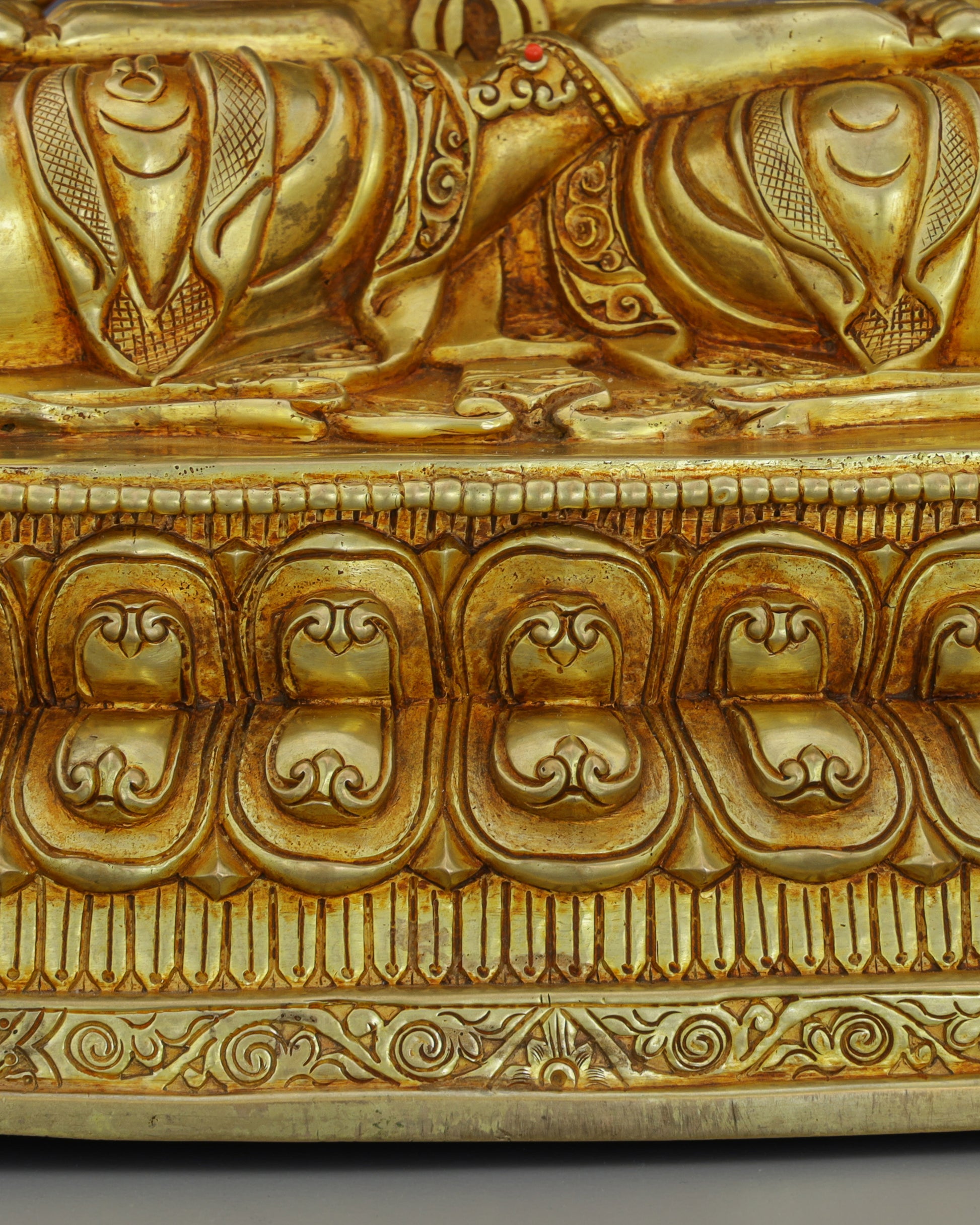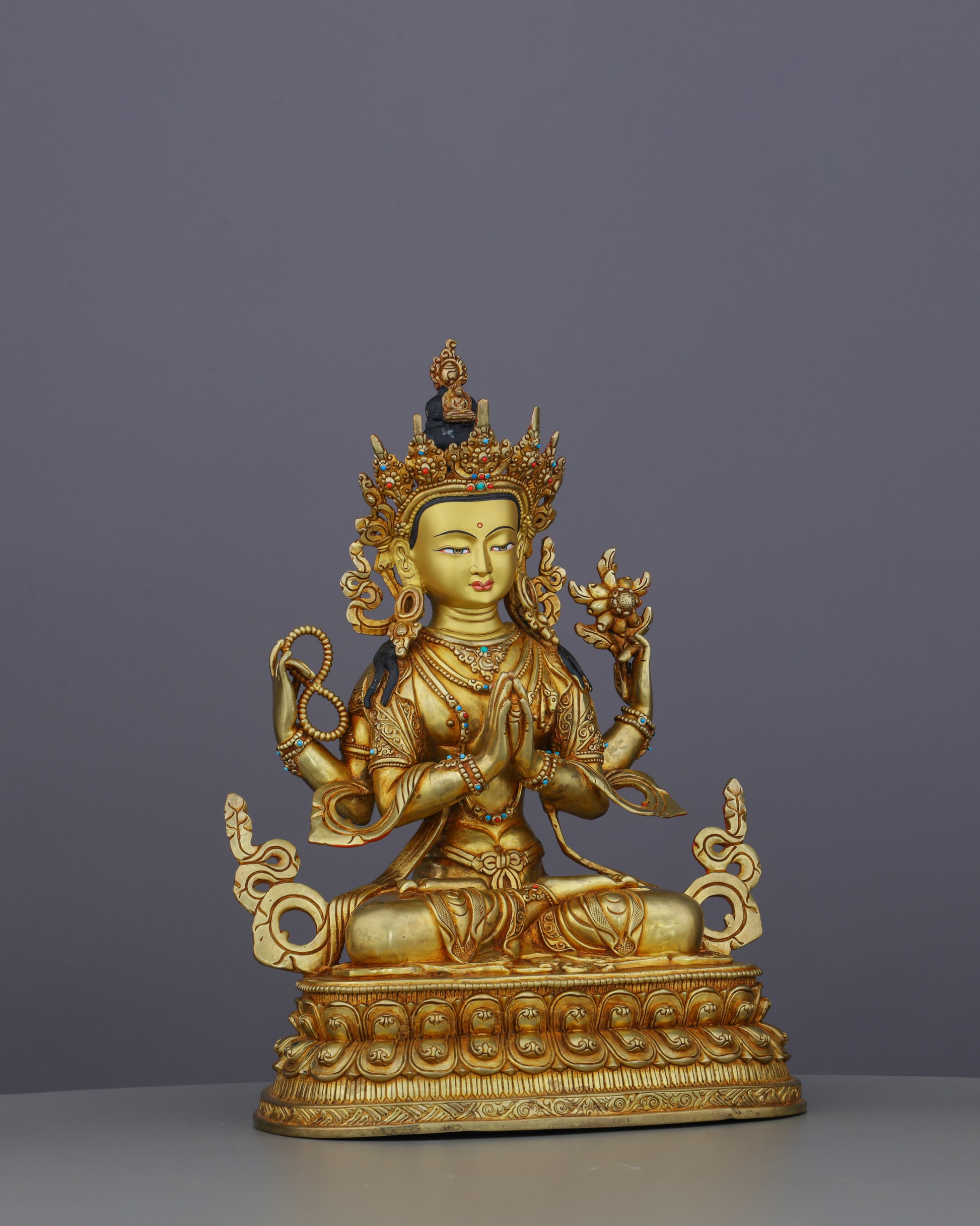 This magnificent handcrafted Chengresi statue represents the pinnacle of Nepalese artistry, featuring four arms in perfect meditation posture atop an ornate lotus throne. With its luminous 24K gold gilding and precious gemstone inlays, this masterpiece brings sacred beauty and spiritual presence to any devotional space.