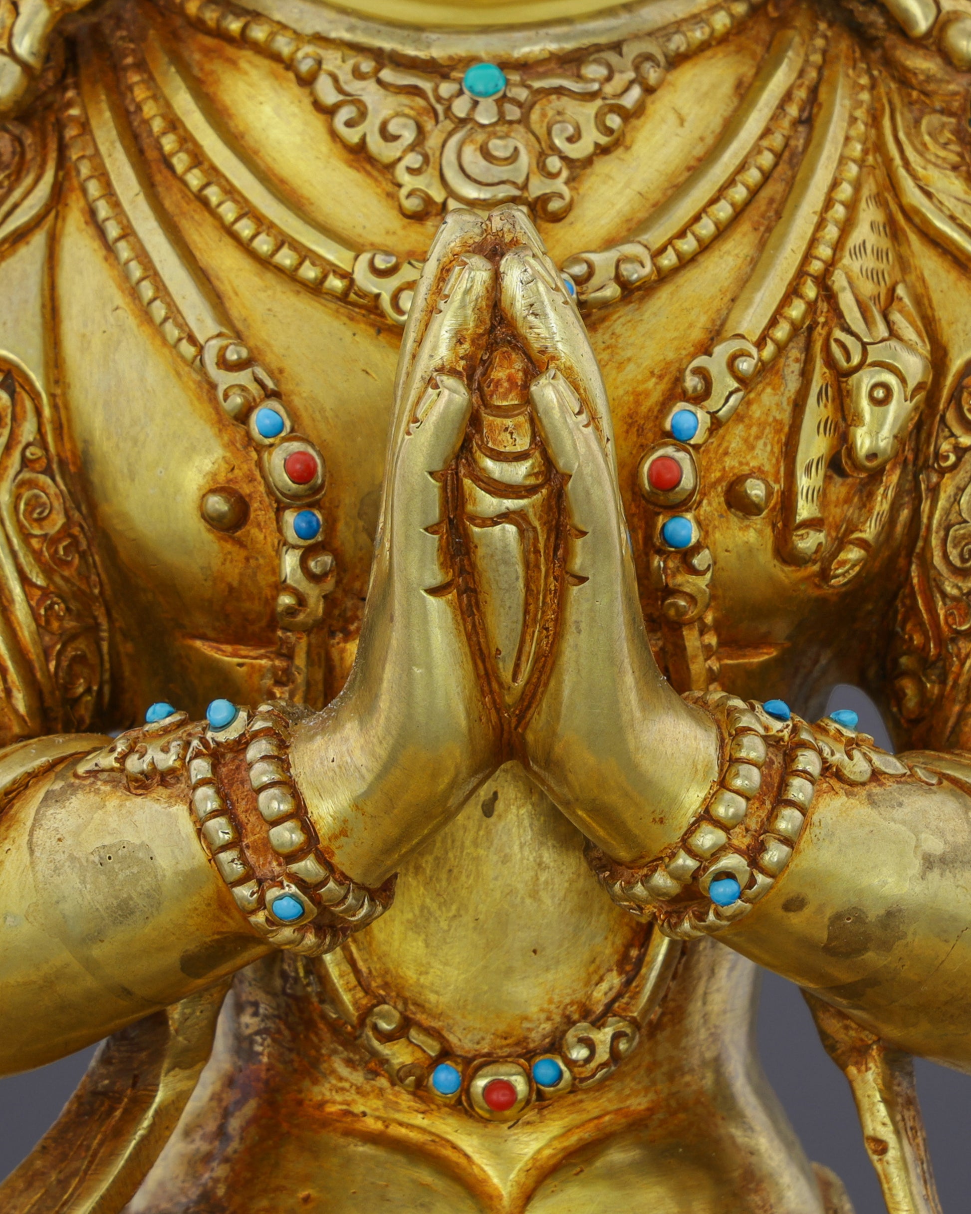 This extraordinary Chengresi statue showcases master craftsmanship through its intricate detailing and premium materials. The 24K gold gilding creates a radiant aura that captures light beautifully, while the turquoise and red coral inlays add vibrant spiritual energy. The substantial copper body ensures durability and longevity, making this not just a devotional object but a treasured heirloom. The ornate five-pointed crown, delicate jewelry work, and perfectly proportioned features demonstrate the exceptional skill of Nepalese artisans who have preserved these sacred traditions for generations.