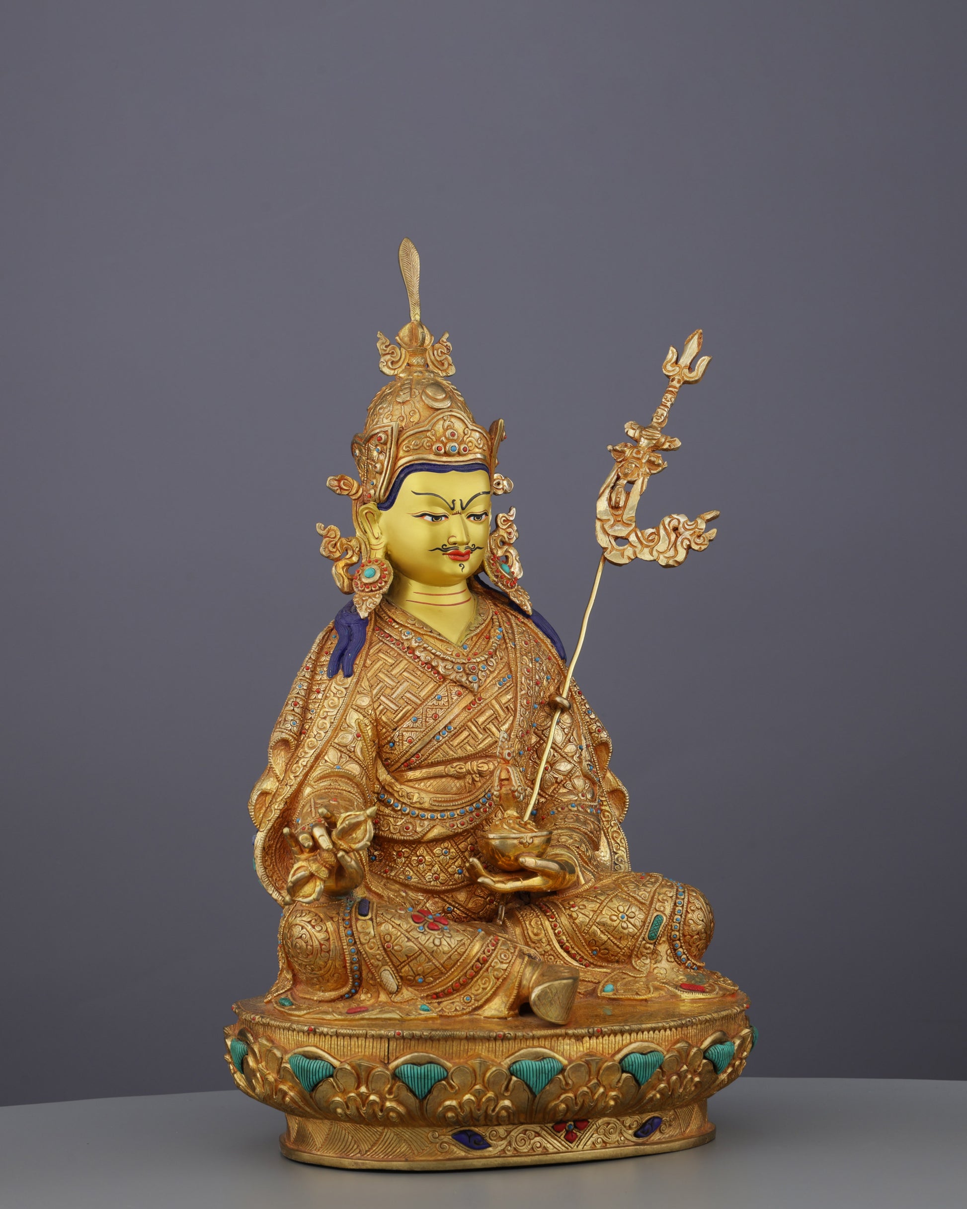 Every element of this statue carries profound meaning. The turquoise and coral inlays represent the union of wisdom and compassion, while the lotus throne signifies purity emerging from worldly existence. Guru Rinpoche's attire combines the robes of a monk, the accoutrements of a tantric master, and the regalia of a king—representing his perfection of all spiritual paths.