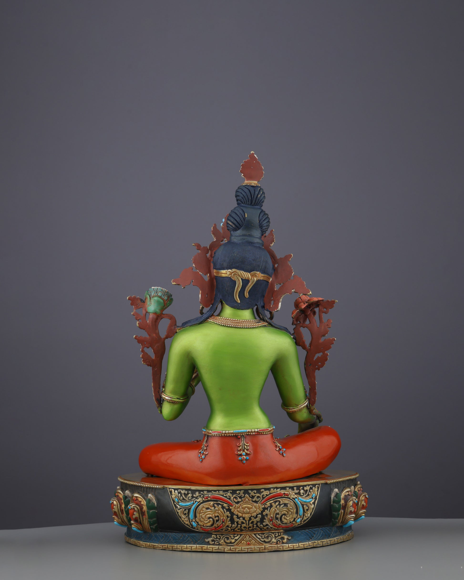 This statue embodies active compassion in feminine form. Green Tara's color represents enlightened activity and life-giving energy, while her posture signifies constant availability to assist practitioners. The lotus flowers represent the transcendence of worldly suffering.