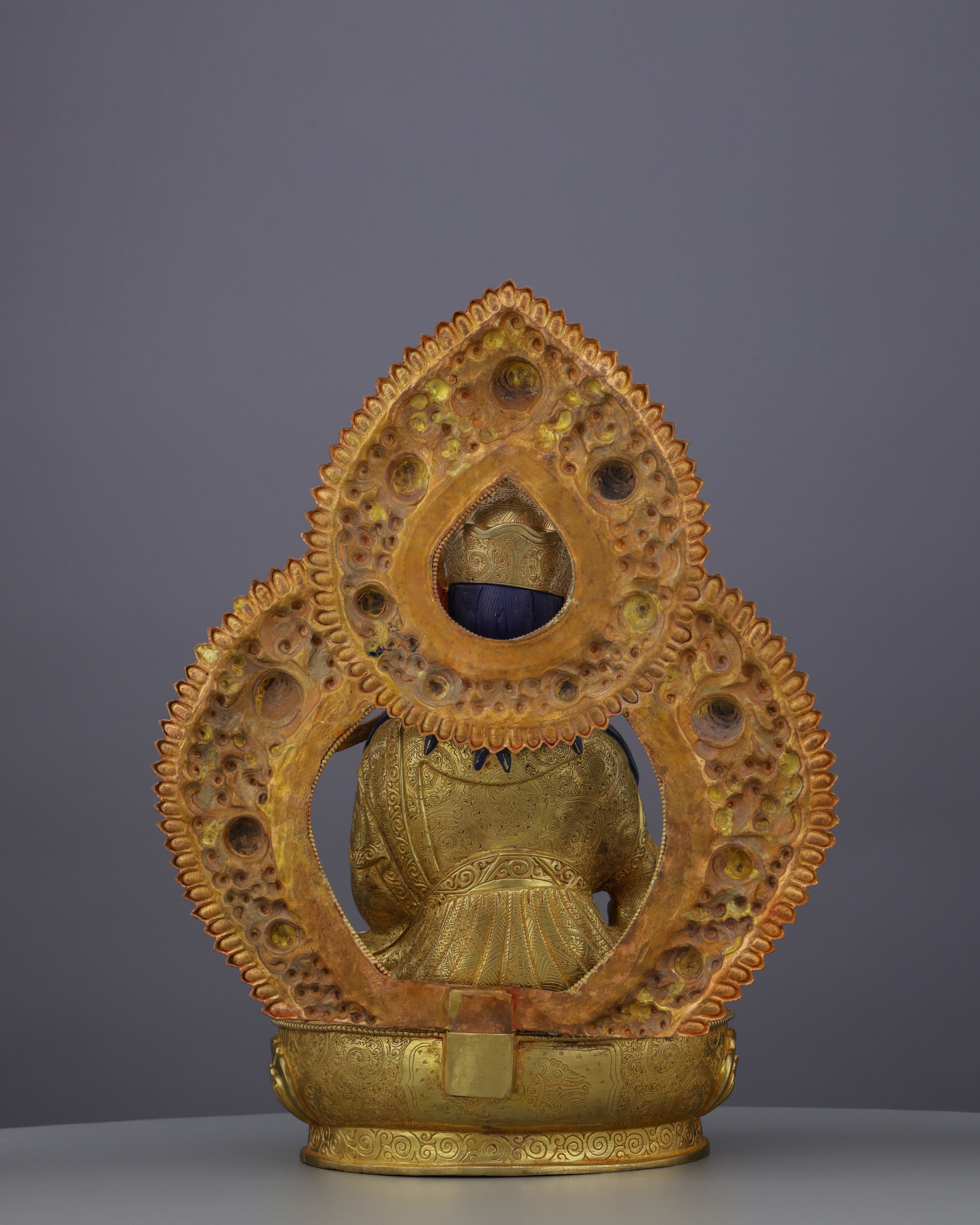 This exceptional masterpiece represents the pinnacle of Nepalese artistry with meticulous 24k gold gilding and extraordinary detail work. The elaborate flame halo, hand-carved gemstones, and intricate traditional iconography create an authentic sacred presence perfect for meditation spaces, dharma centers, and discerning collectors seeking genuine Himalayan Buddhist art.
