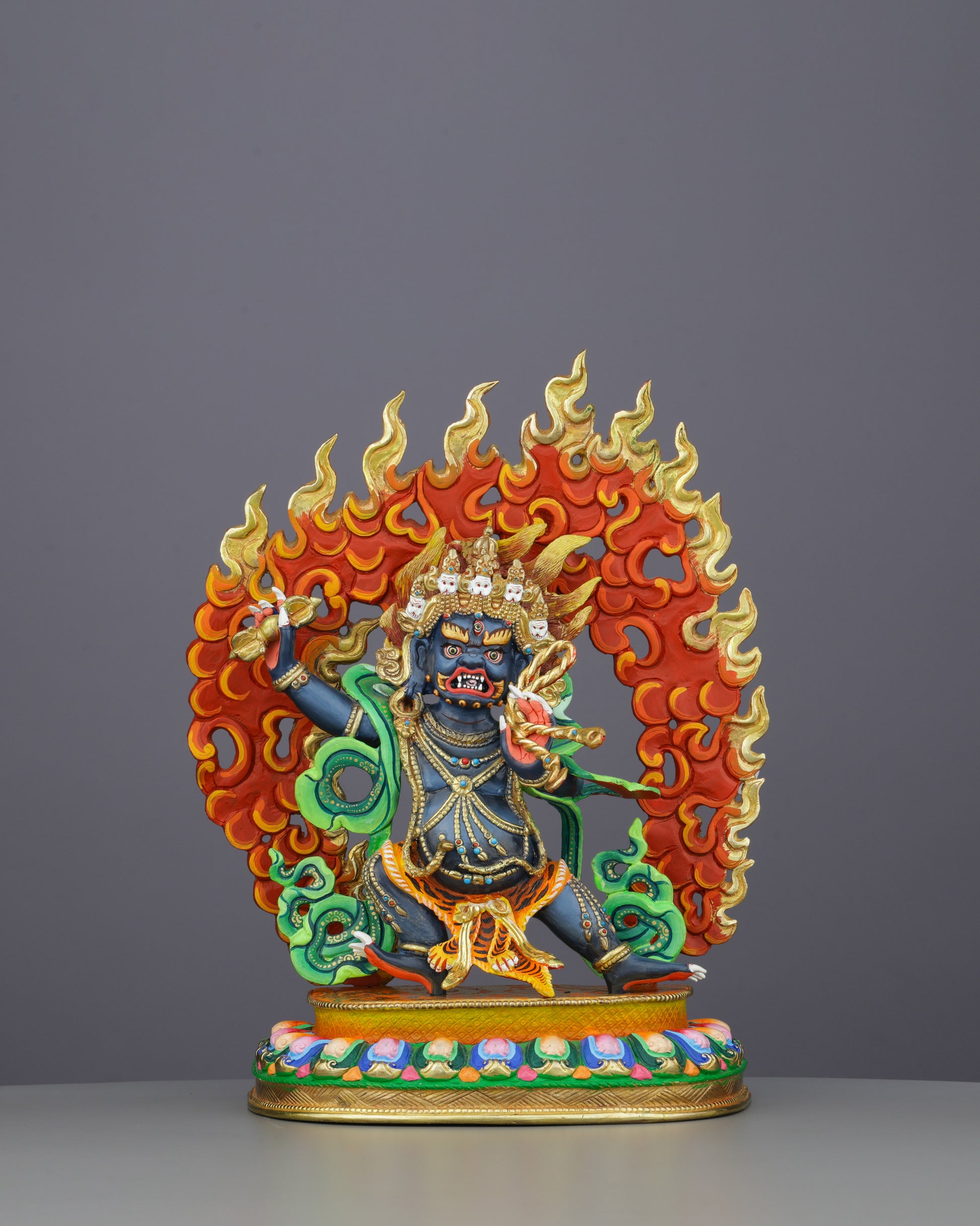 The blazing fire aureole represents transformative wisdom that incinerates all obstacles and negativities. Vajrapani's wrathful appearance isn't anger but compassionate force that swiftly cuts through spiritual hindrances, protecting dharma practitioners and sacred teachings.