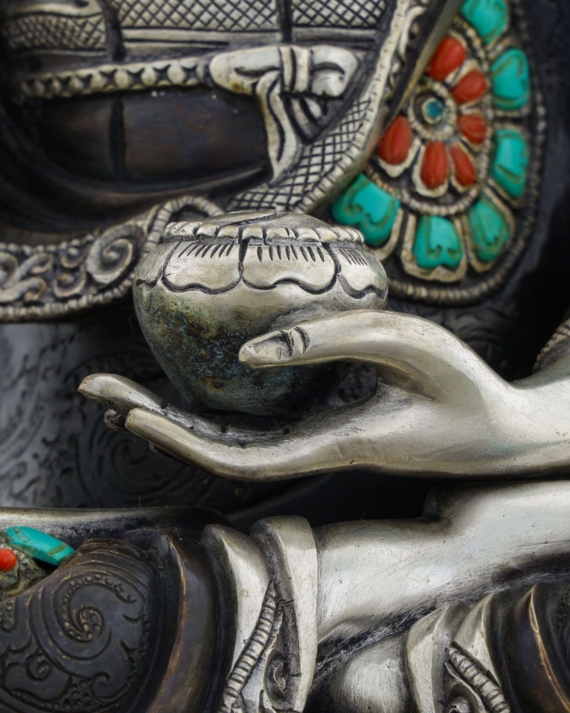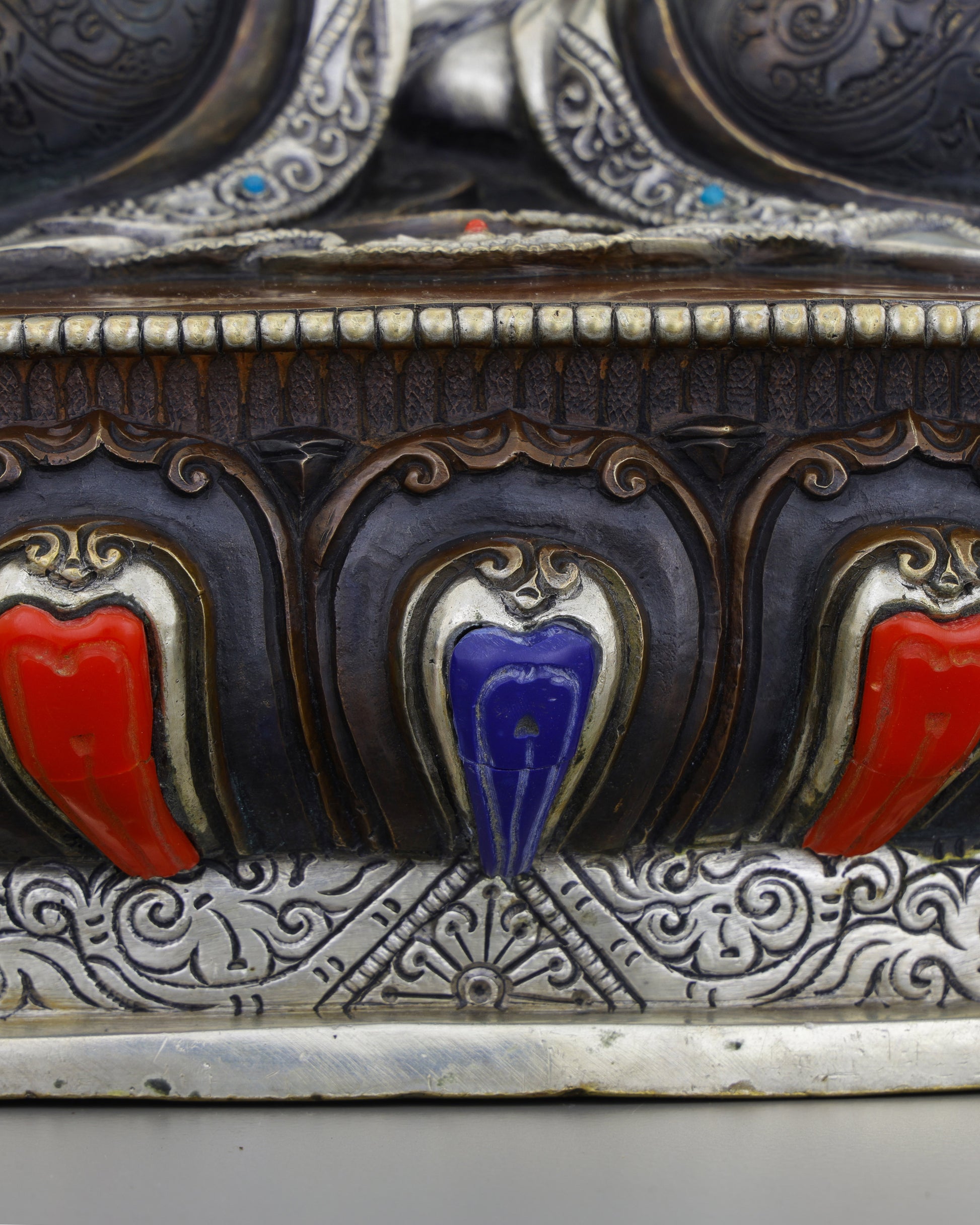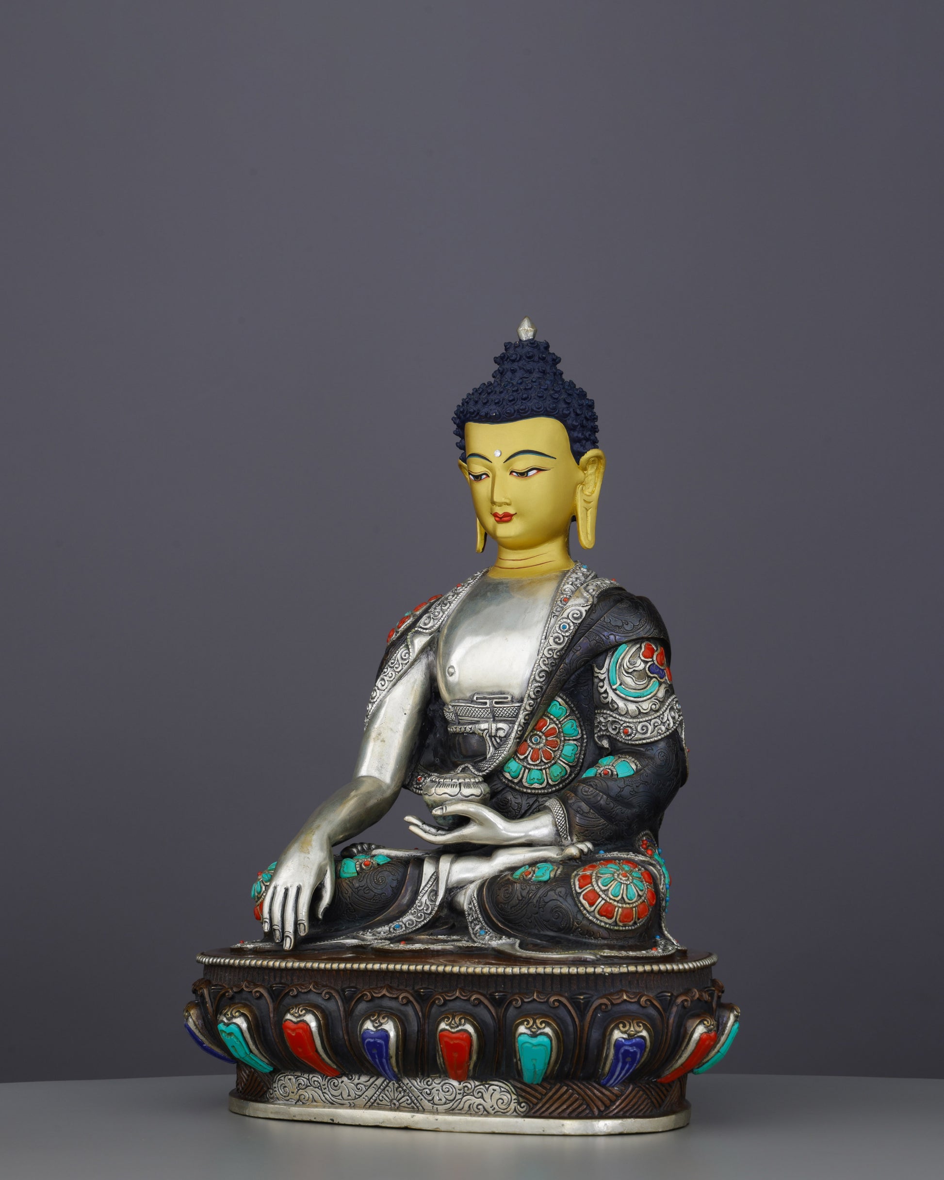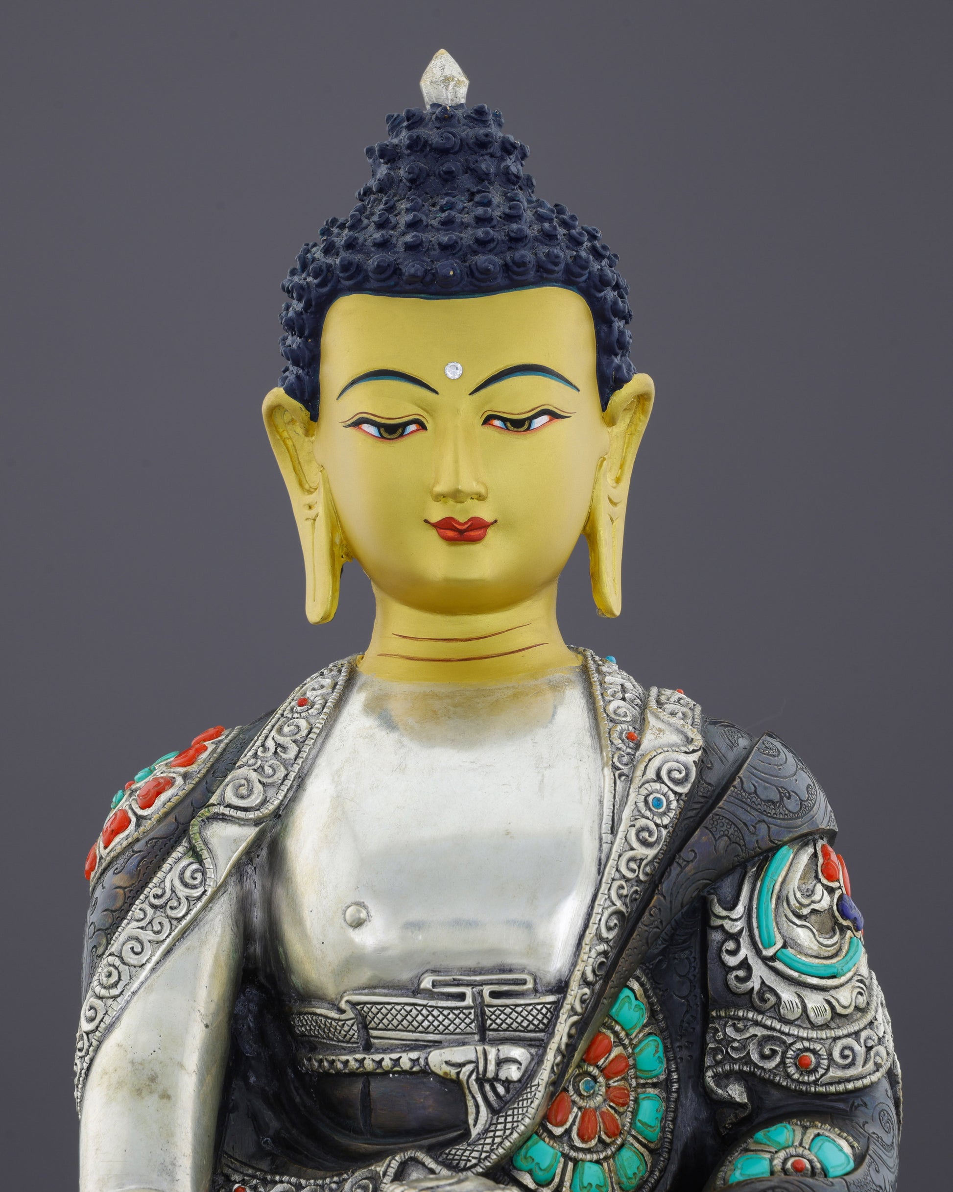This stunning handmade oxidized Shakyamuni Buddha statue embodies centuries of Nepalese artistic heritage, featuring a lustrous 24K gold-gilded face contrasted with darkened silver-plated robes adorned with vibrant gemstones. An exceptional meditation focal point and collector's piece that radiates the Buddha's timeless wisdom and serenity.