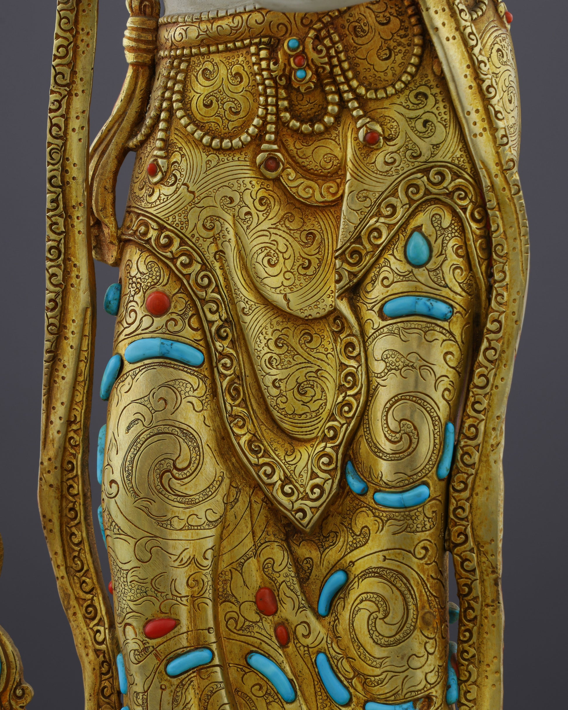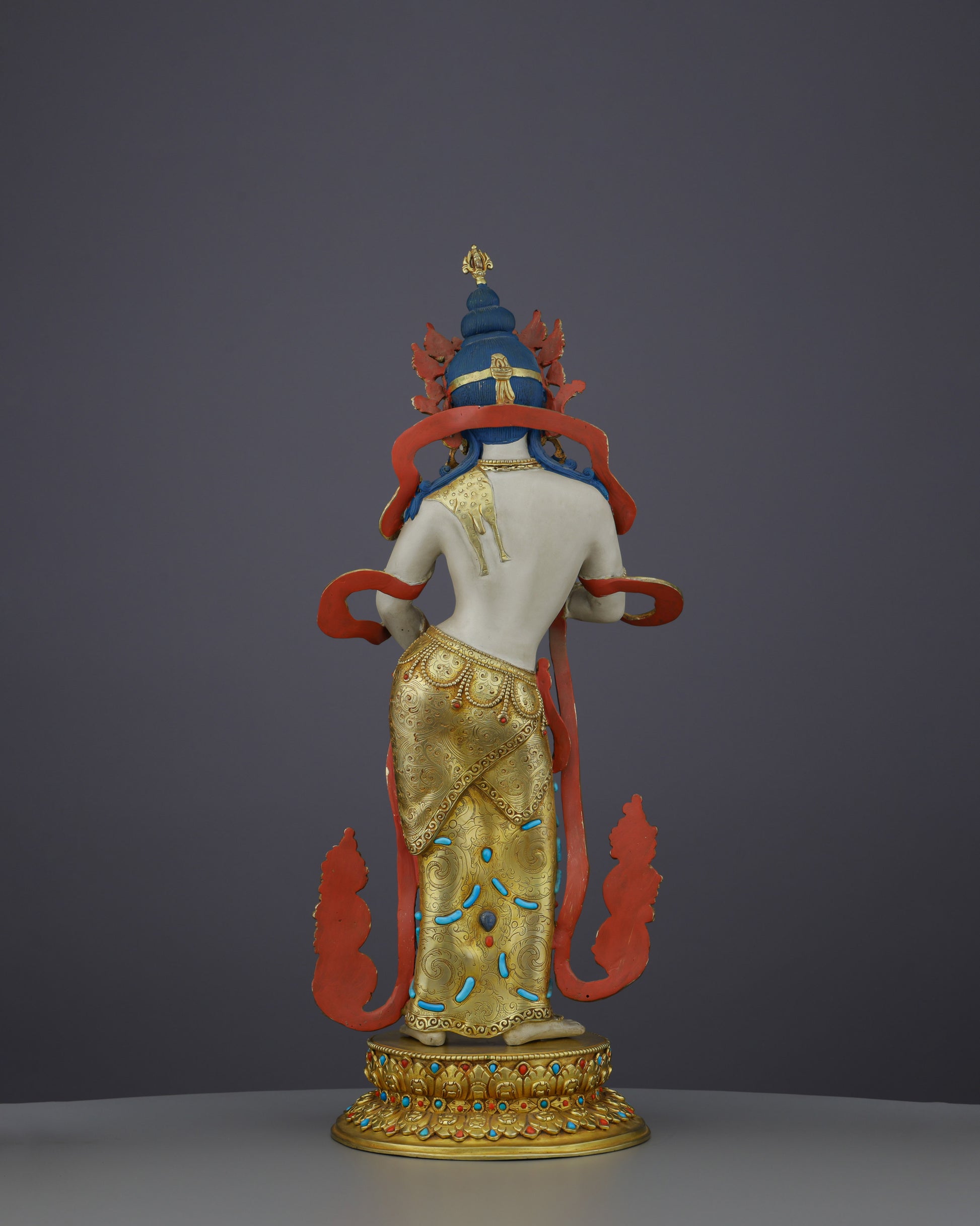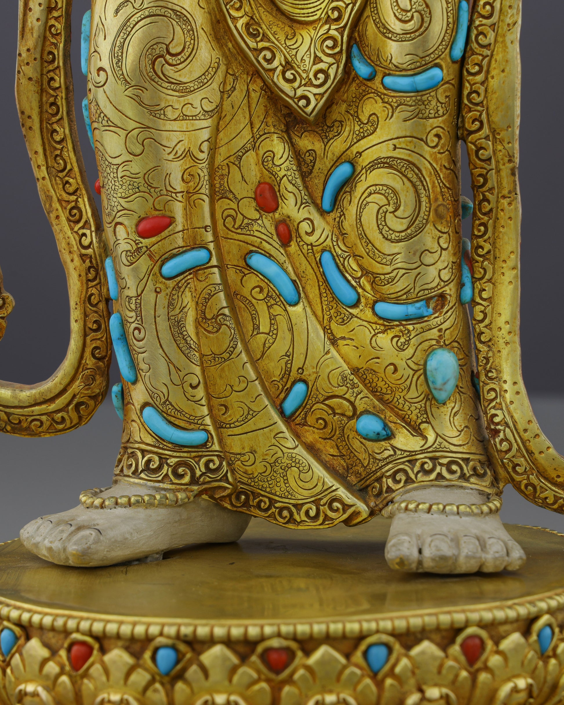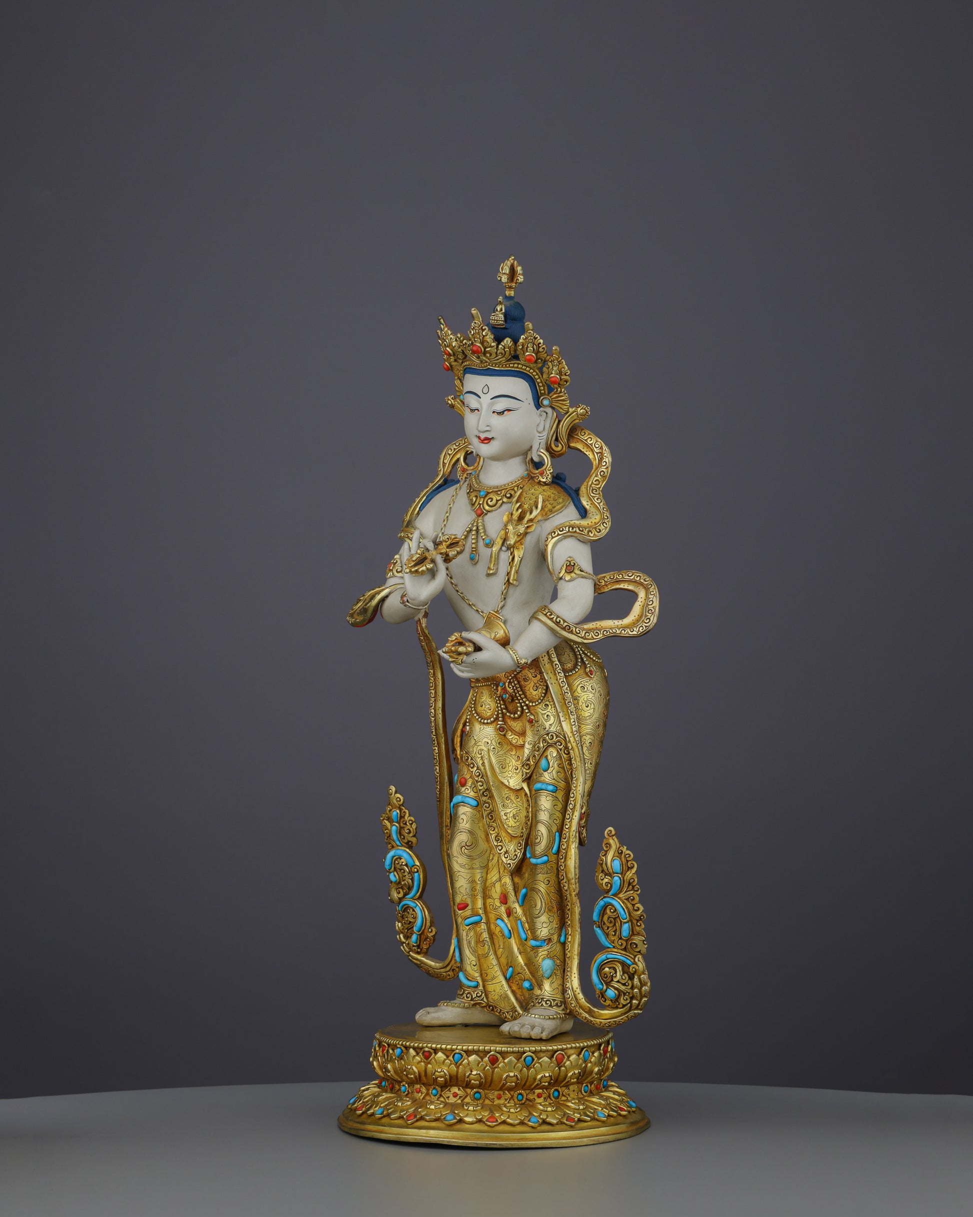 This exceptional Vajrasattva statue represents the zenith of traditional Nepalese Buddhist metalwork. The substantial copper body provides a solid foundation, while the lustrous 24-karat gold gilding creates an ethereal radiance that illuminates any environment. Master artisans have meticulously hand-carved and embedded turquoise stones throughout the flowing robes and ornate crown, symbolizing healing wisdom, while coral inlays add vibrant accents representing vitality and protection. The elaborate gold and acrylic painting work brings depth to every detail—from the delicate facial features to the intricate patterns on the dhoti and jewelry. The impressive height commands attention. Every element, from the jeweled lotus throne to the perfectly balanced proportions, demonstrates generations of inherited craftsmanship.