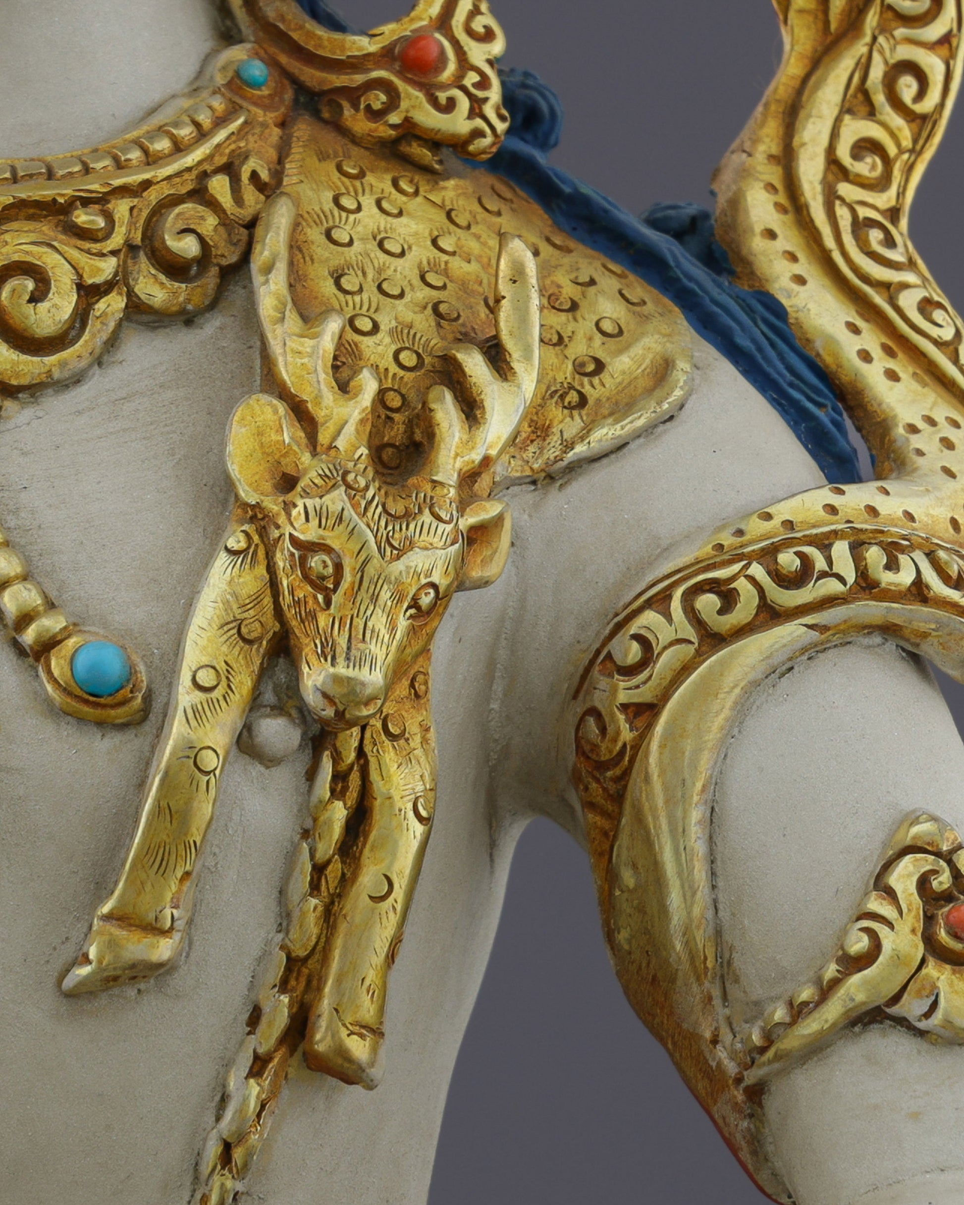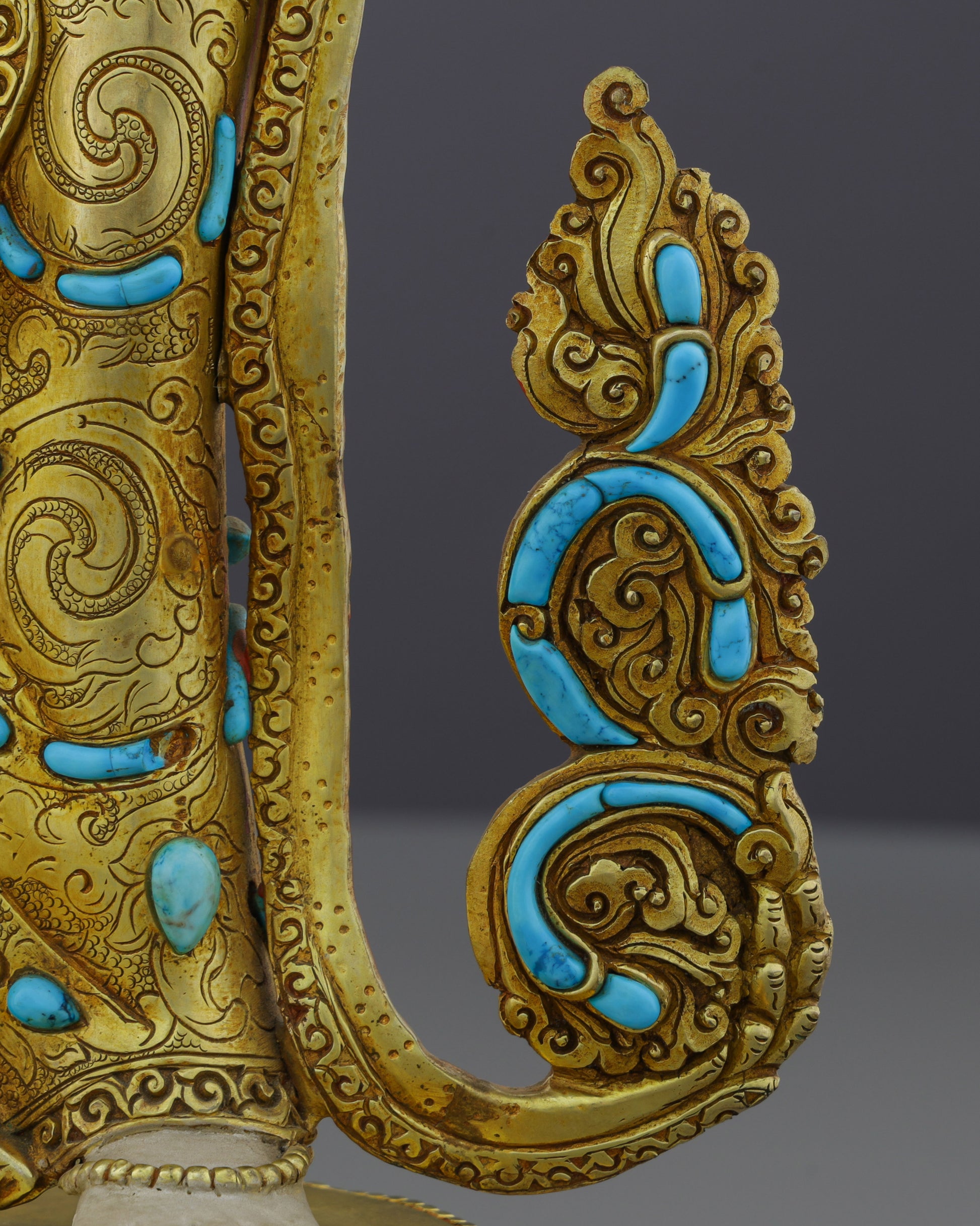Materials: 24K gold gilded, copper body, gold and acrylic paintings, handcarved turquoise and coral inlays