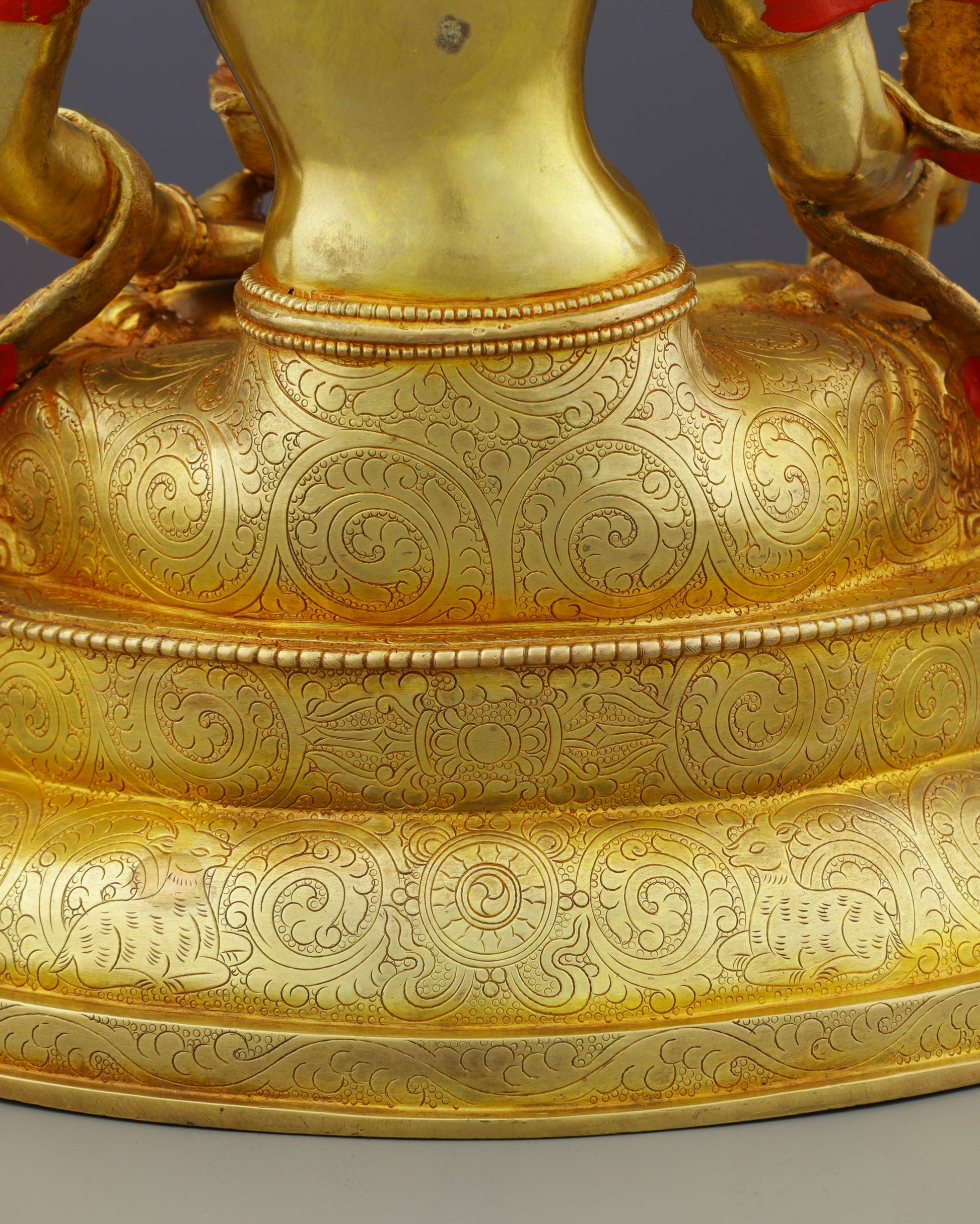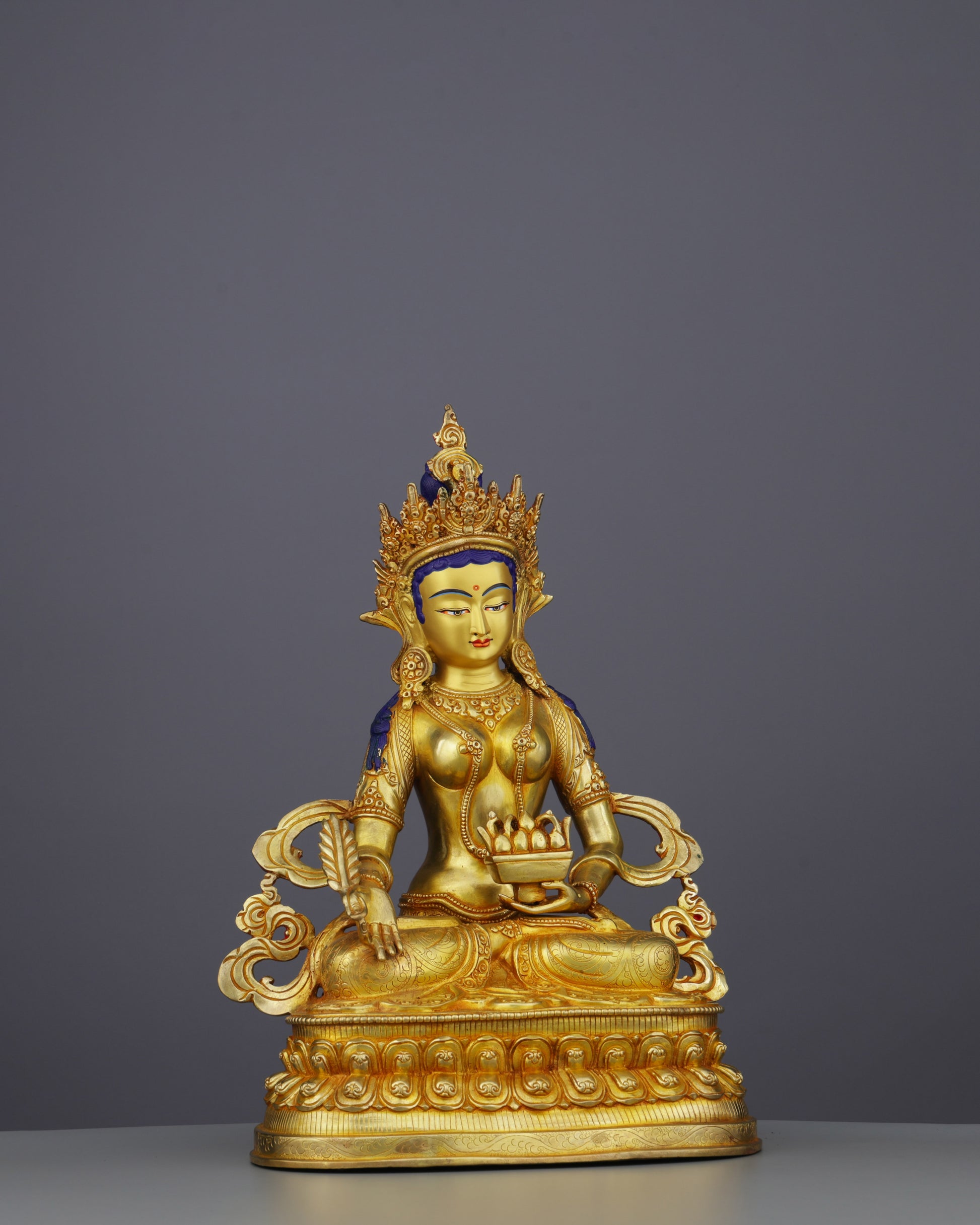 This statue embodies the flow of universal abundance and spiritual fulfillment. The lotus base represents purity emerging from worldly existence, while the treasure vase signifies inexhaustible wealth. Each gesture and ornament carries profound meaning, reminding practitioners that true prosperity encompasses wisdom, compassion, and generosity.