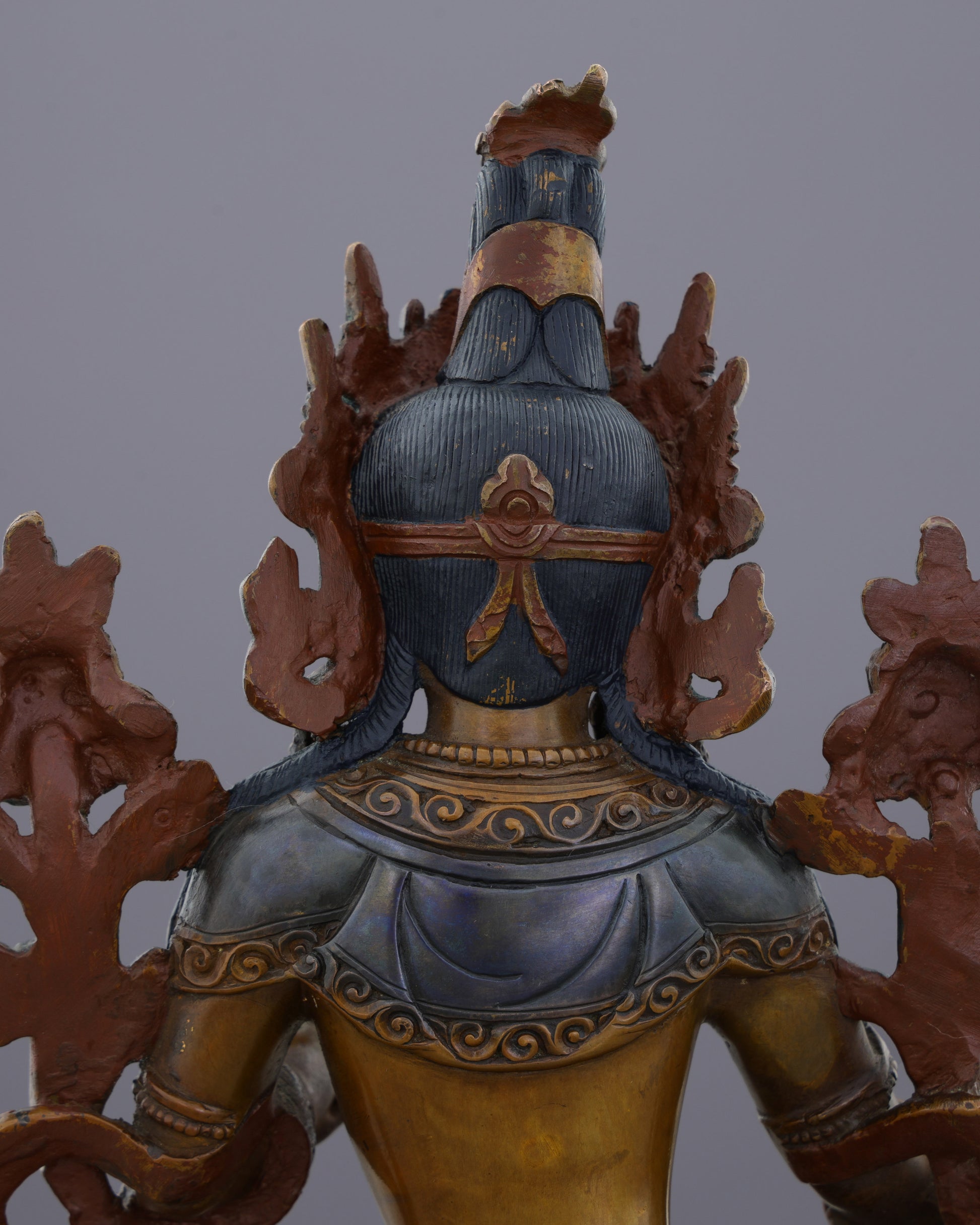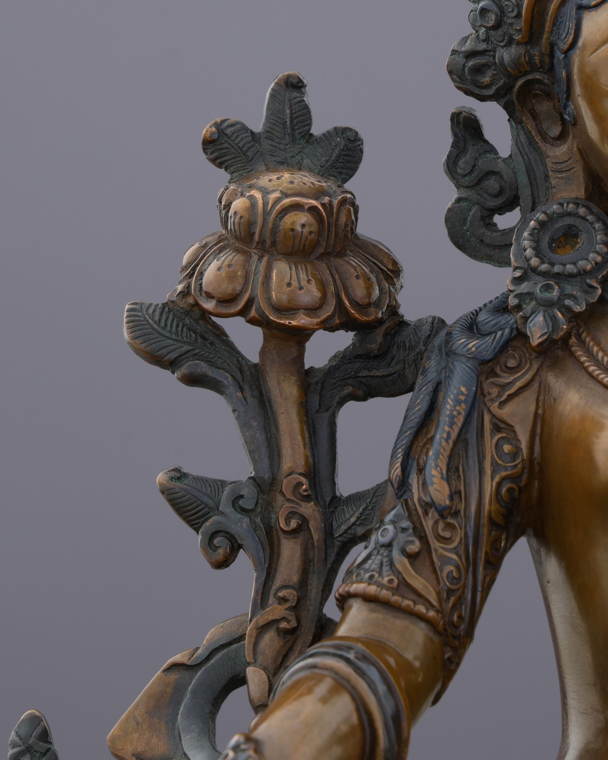 This statue embodies protection, swift compassionate action, and the removal of obstacles. The extended right leg symbolizes Tara's readiness to step into the world to assist practitioners, while the tucked left leg represents meditative wisdom. The turquoise inlays connect to healing energies and spiritual protection, while coral represents life force and vitality. The blooming lotuses signify enlightenment transcending worldly attachment. Together, these elements create a powerful representation of feminine divine energy that combines nurturing compassion with courageous action.