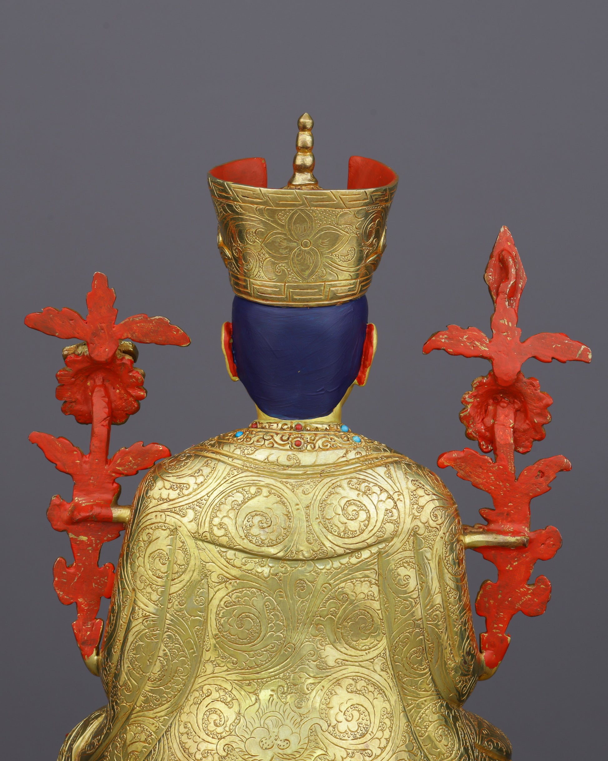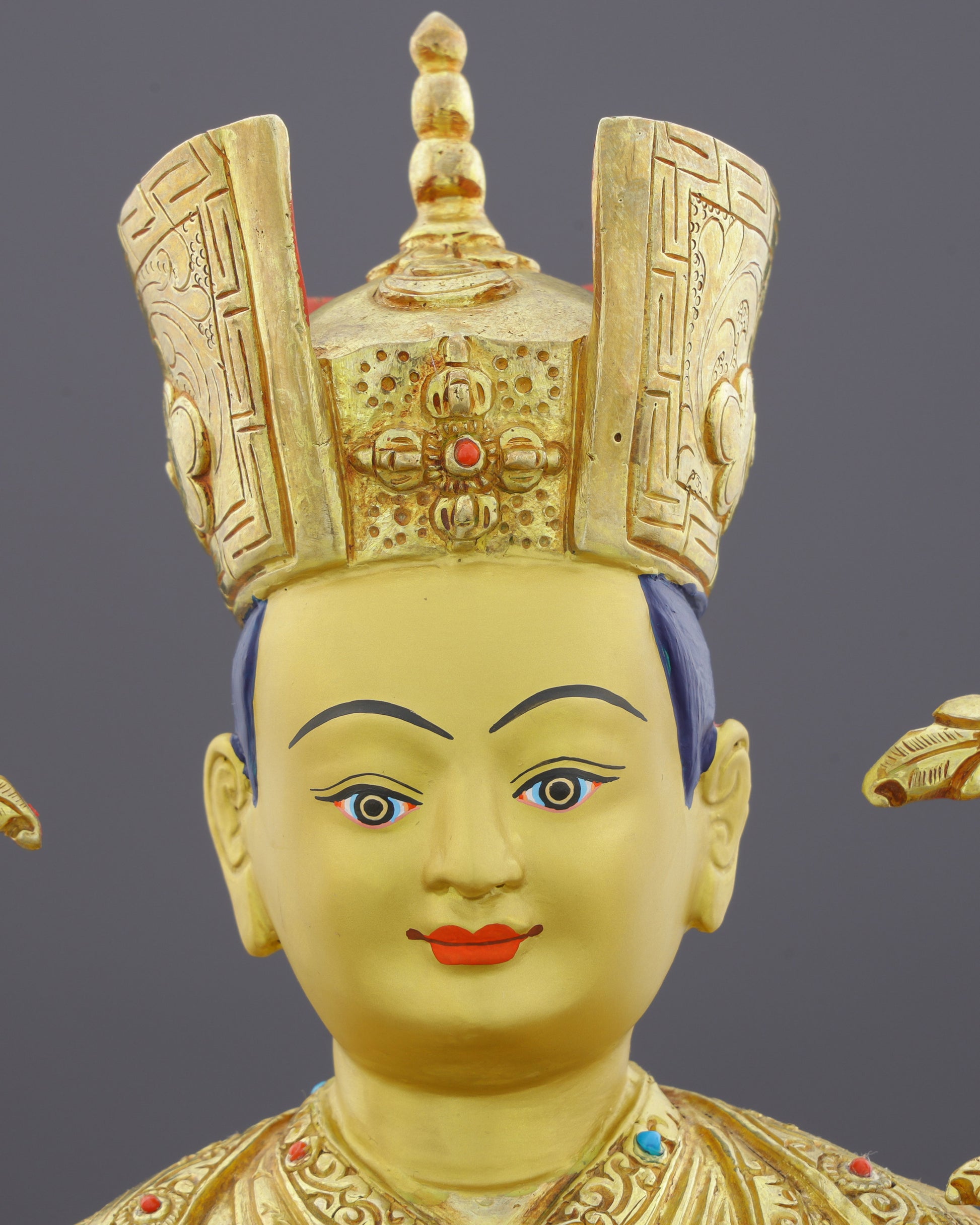 This exceptional statue showcases the pinnacle of lost wax casting artistry, preserving every intricate detail of the Karmapa's ceremonial robes and sacred Black Crown. The lavish 24K gold gilding radiates spiritual luminosity, while meticulously applied gold and acrylic paintings bring depth to the ornate garments. Hand-set turquoise and red coral inlays embellish the crown and throne, creating a stunning visual representation worthy of this enlightened master's legacy.