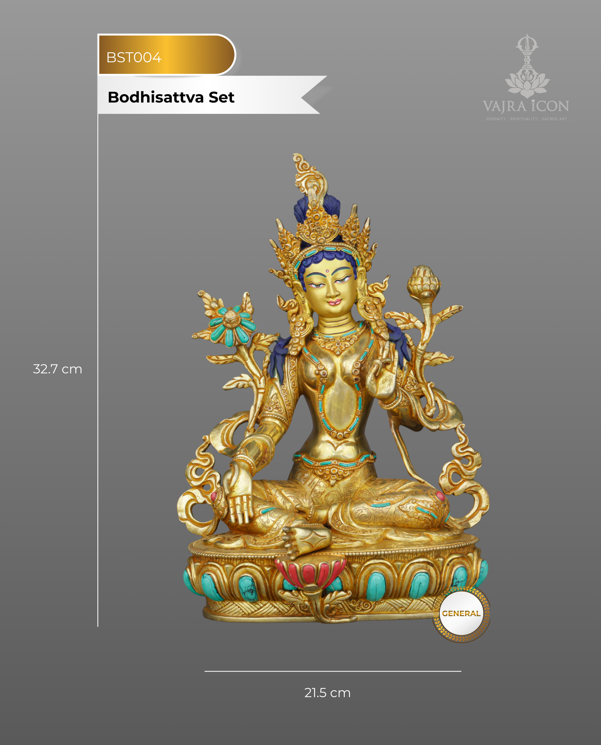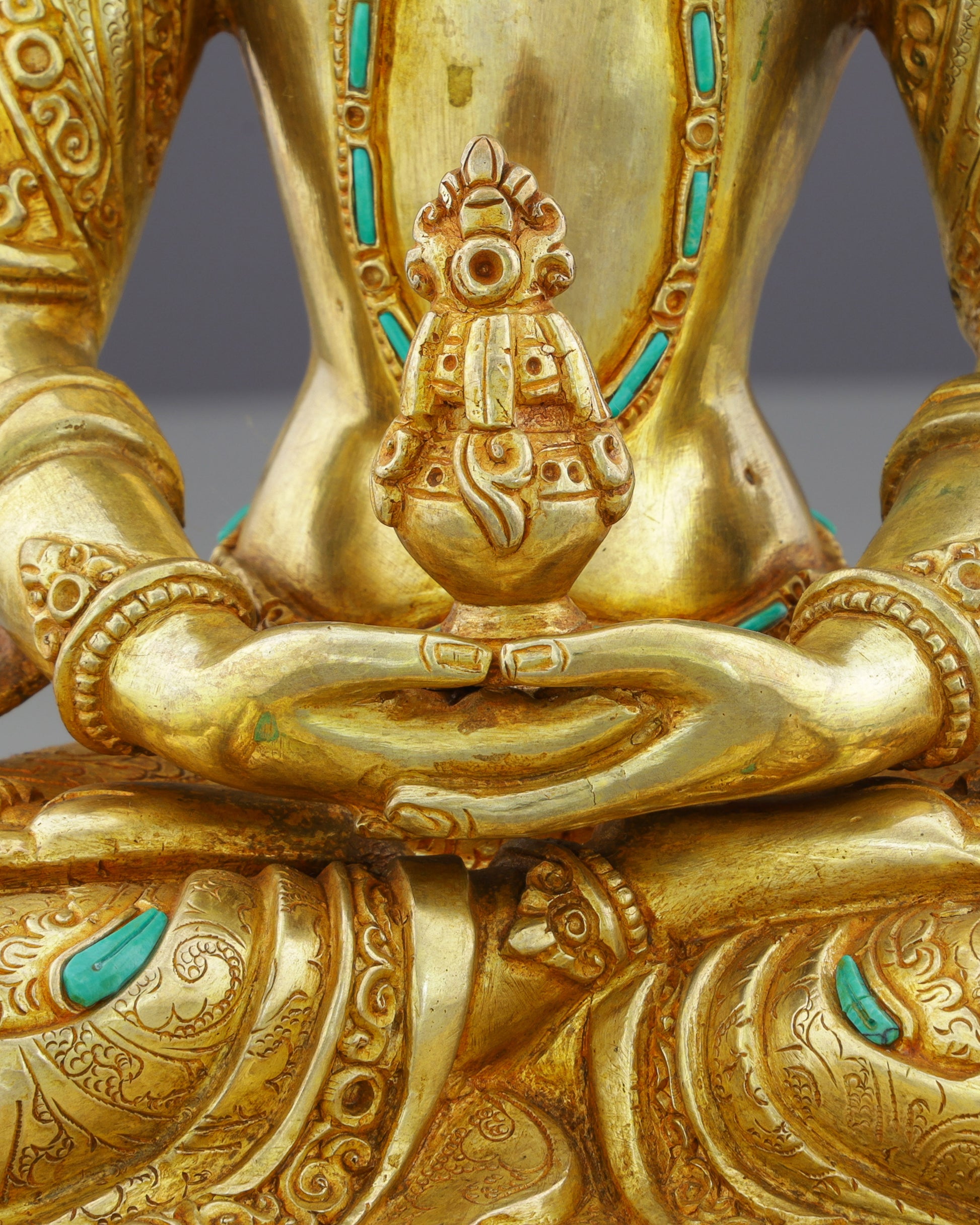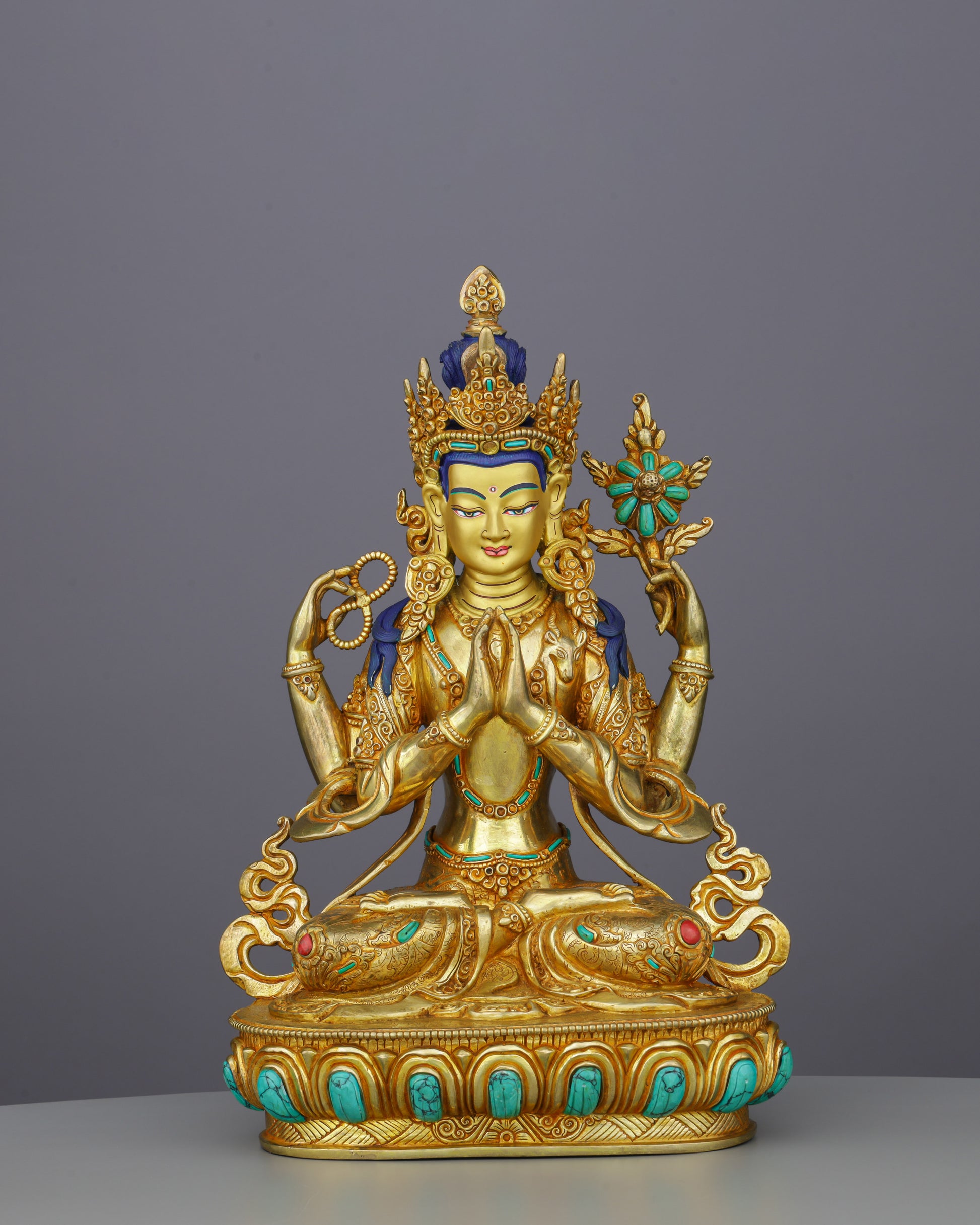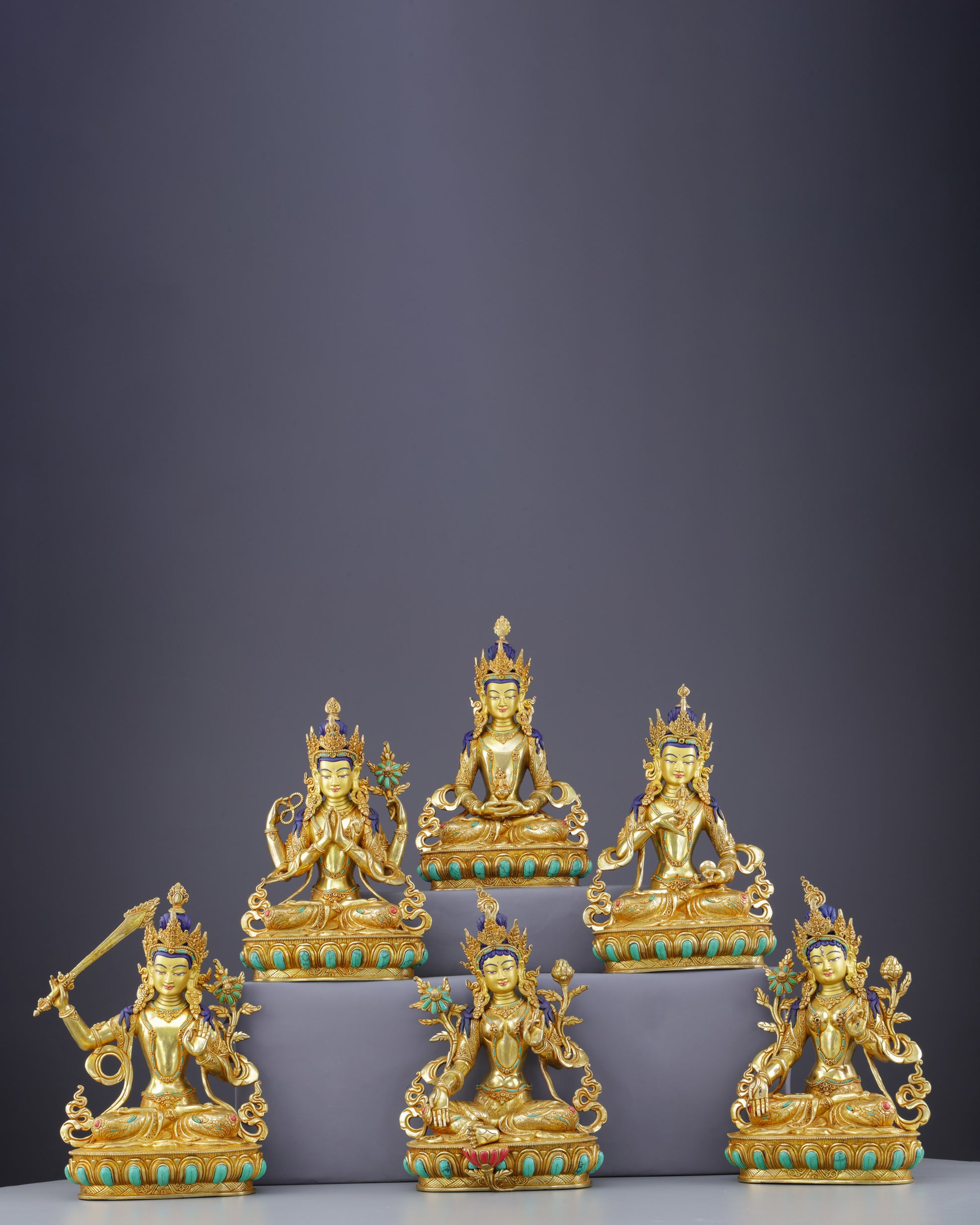 This extraordinary collection portrays five Bodhisattvas in perfect meditative posture, each seated in lotus position upon ornate turquoise-adorned lotus thrones. Their radiant golden faces glow with serene compassion, while gentle eyes express deep wisdom and mindful awareness. Amitayus holds the longevity vase in dhyana mudra, Chengresi displays four arms with wish-fulfilling jewel and lotus, Vajrasattva wields vajra and bell symbolizing method and wisdom, Manjushri raises the flaming wisdom sword, while Green Tara sits in lalitasana with utpala lotus. The brilliant 24K gold gilding catches light magnificently, while handcarved turquoise and coral gemstones add celestial radiance. Their elaborate five-pointed crowns signify mastery over the five Buddha families.
