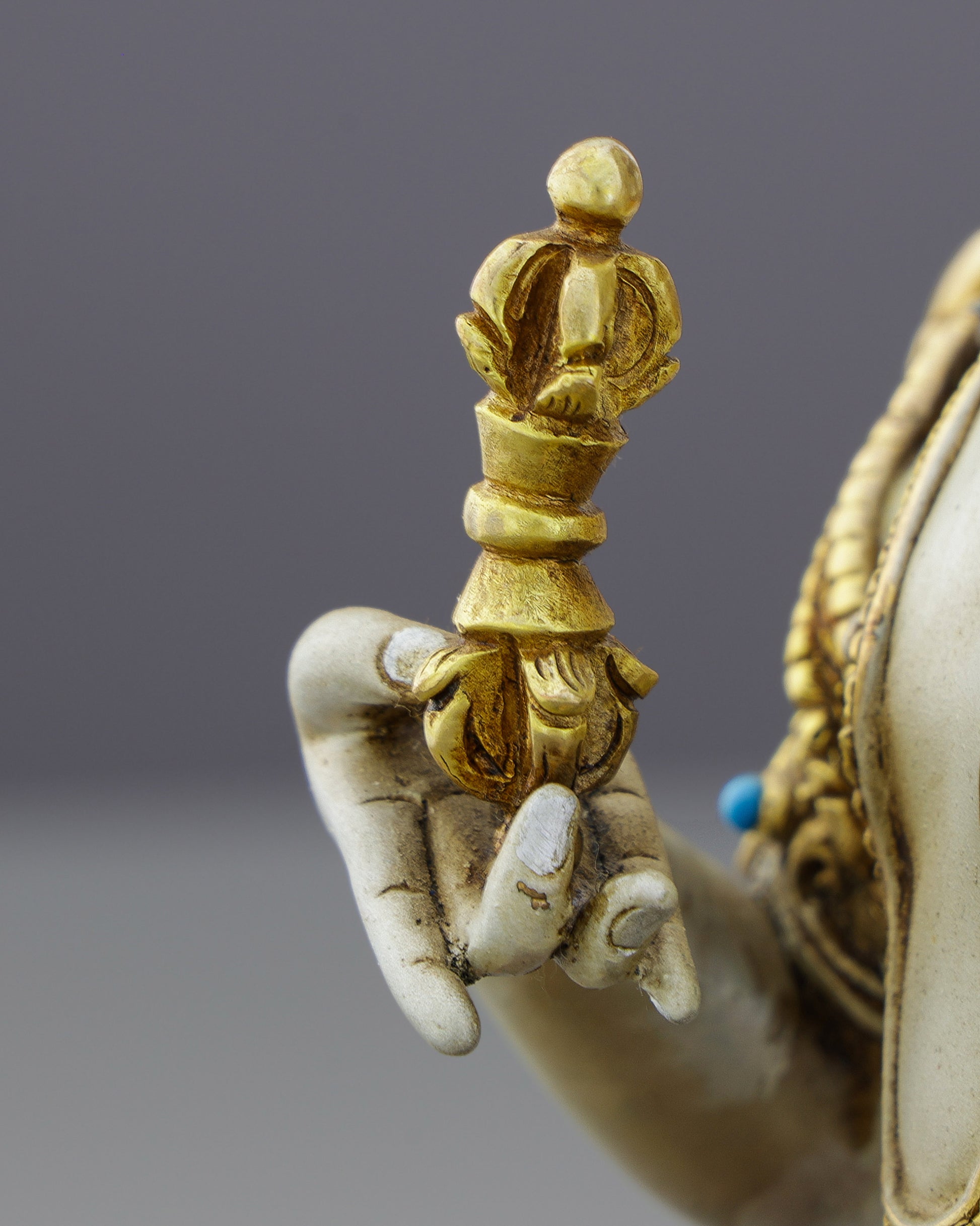 Experience the transformative power of purification through this exquisite Vajrasattva statue, where ancient Nepalese craftsmanship meets spiritual devotion. Seated in meditative repose with pristine white complexion and gleaming gold accents, this handcrafted masterpiece features rare lapis lazuli, turquoise, and coral inlays that create a harmonious celebration of sacred artistry.