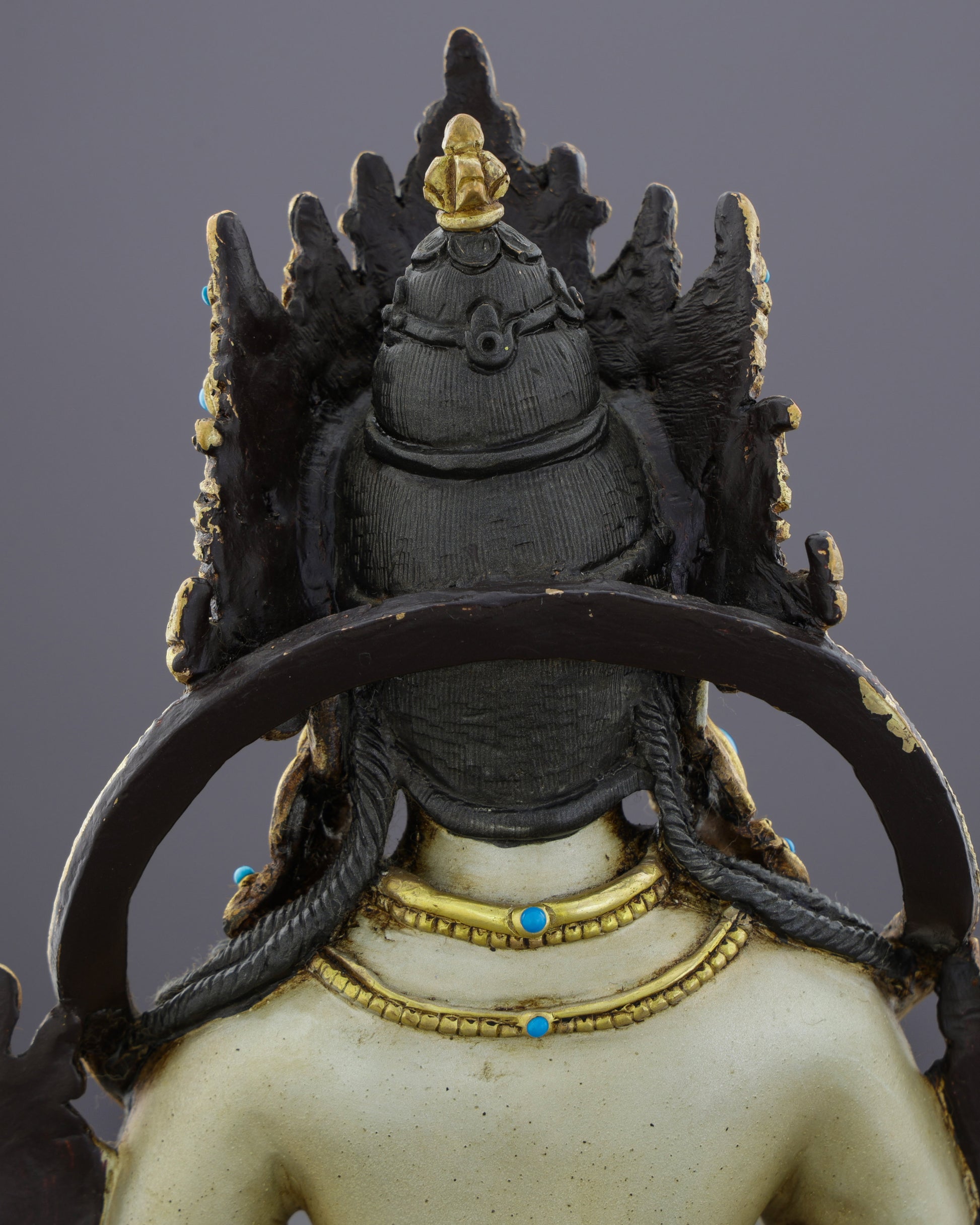 This distinguished Vajrasattva statue exemplifies superior Nepalese craftsmanship through its meticulous attention to detail and premium materials. The copper body foundation ensures structural integrity and spiritual authenticity, enhanced by lustrous gold plating that creates an ethereal glow. What sets this piece apart is the exceptional use of three sacred gemstones: turquoise inlays symbolizing healing and protection adorn the crown and jewelry, while coral accents representing life force energy bring warmth to the composition, and rare lapis lazuli stones add deep celestial blue tones throughout. The hand-applied acrylic painting achieves museum-quality facial features with delicate expression and perfectly defined eyes. The elaborate double-lotus throne showcases contrasting colors and precise petal formations, while the ornate backdrop frame adds dimensional depth. The harmonious color palette of coral red, turquoise blue, and radiant gold creates visual splendor that captivates collectors and practitioners alike.