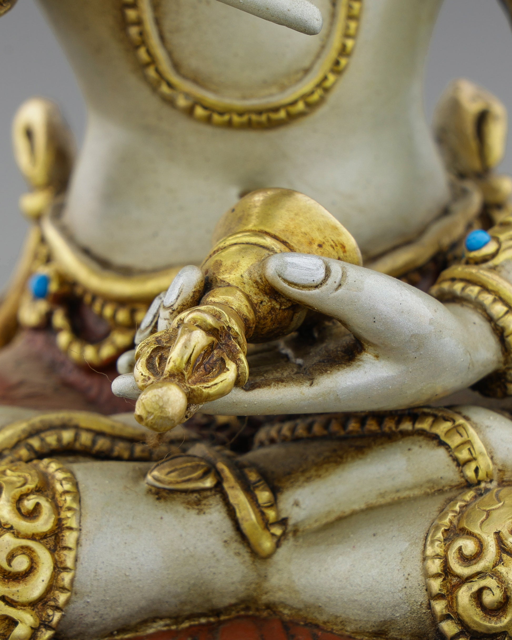 Vajrasattva sits in padmasana, the lotus posture of unshakable meditation. His right hand holds the vajra (diamond scepter) at his heart, symbolizing skillful means and indestructible wisdom. His left hand gracefully rests in his lap, holding the ghanta (ritual bell) representing the wisdom of emptiness. Together, these implements signify the union of compassion and wisdom—the essence of enlightenment. His serene face features downcast eyes in meditative absorption, conveying infinite compassion and peaceful contemplation. The five-jeweled crown represents mastery over the five Buddha families, while his pure white body radiates pristine awareness.