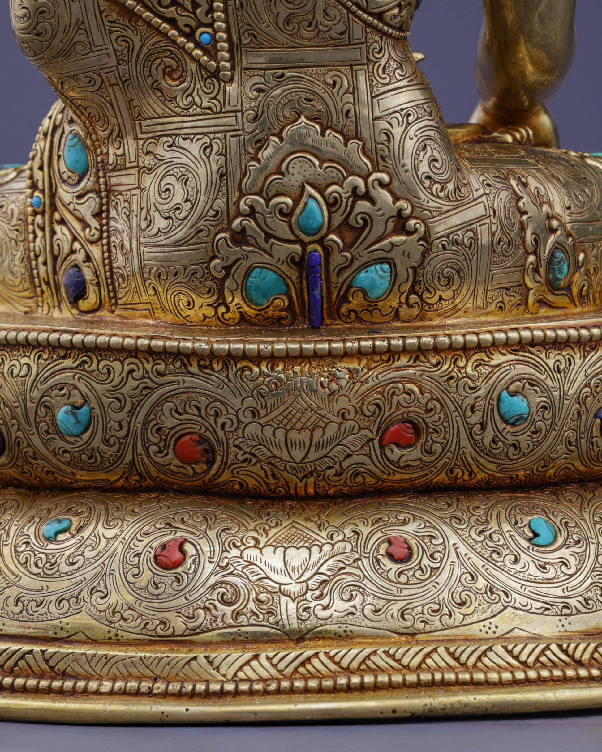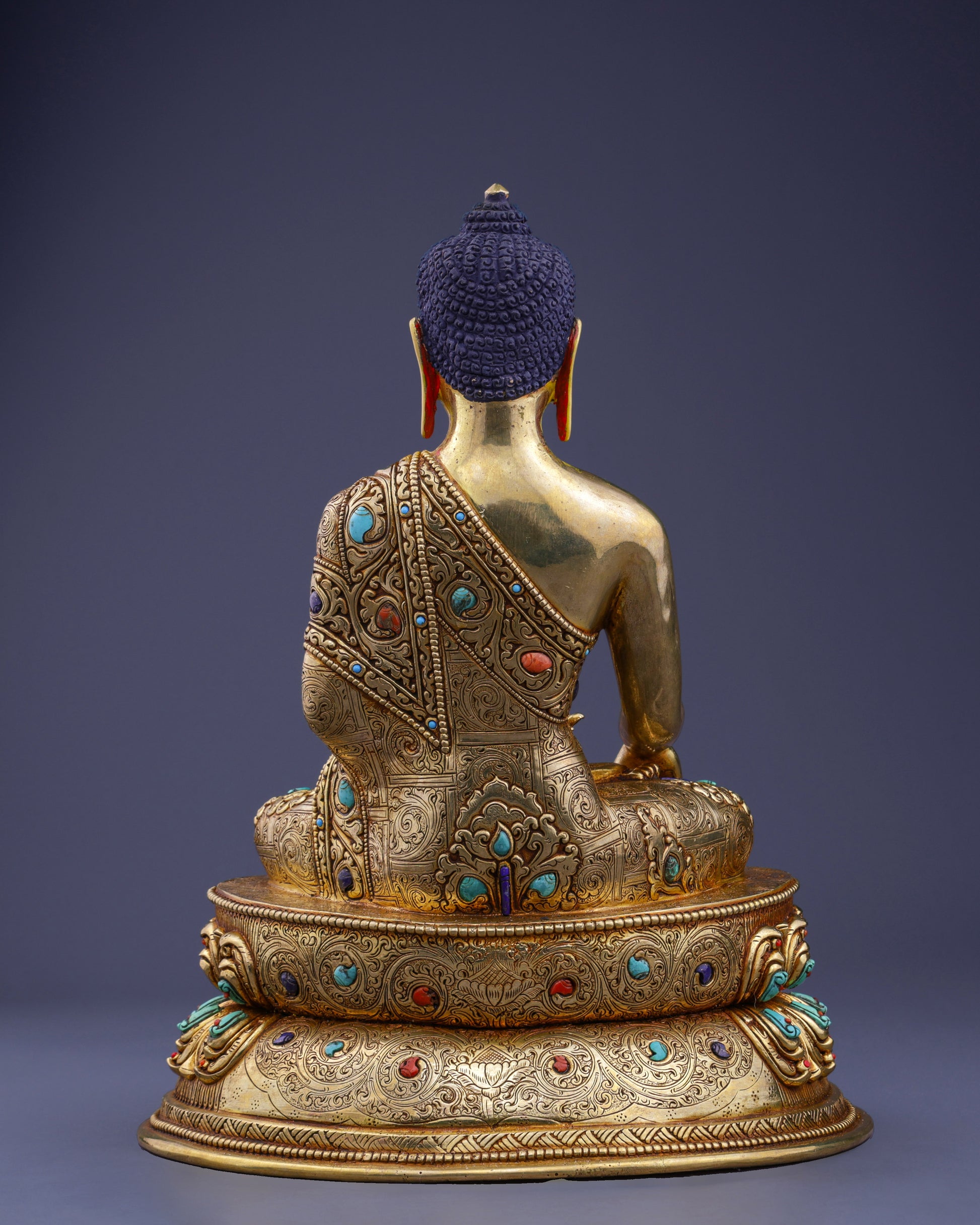 Meticulously crafted from premium copper with 24-karat gold gilding, this statue features hand-painted details in traditional mineral pigments. Semi-precious stones accent the crown and robes, while the double lotus base showcases intricate repoussé metalwork—a testament to Nepal's unparalleled Buddhist artistic heritage.