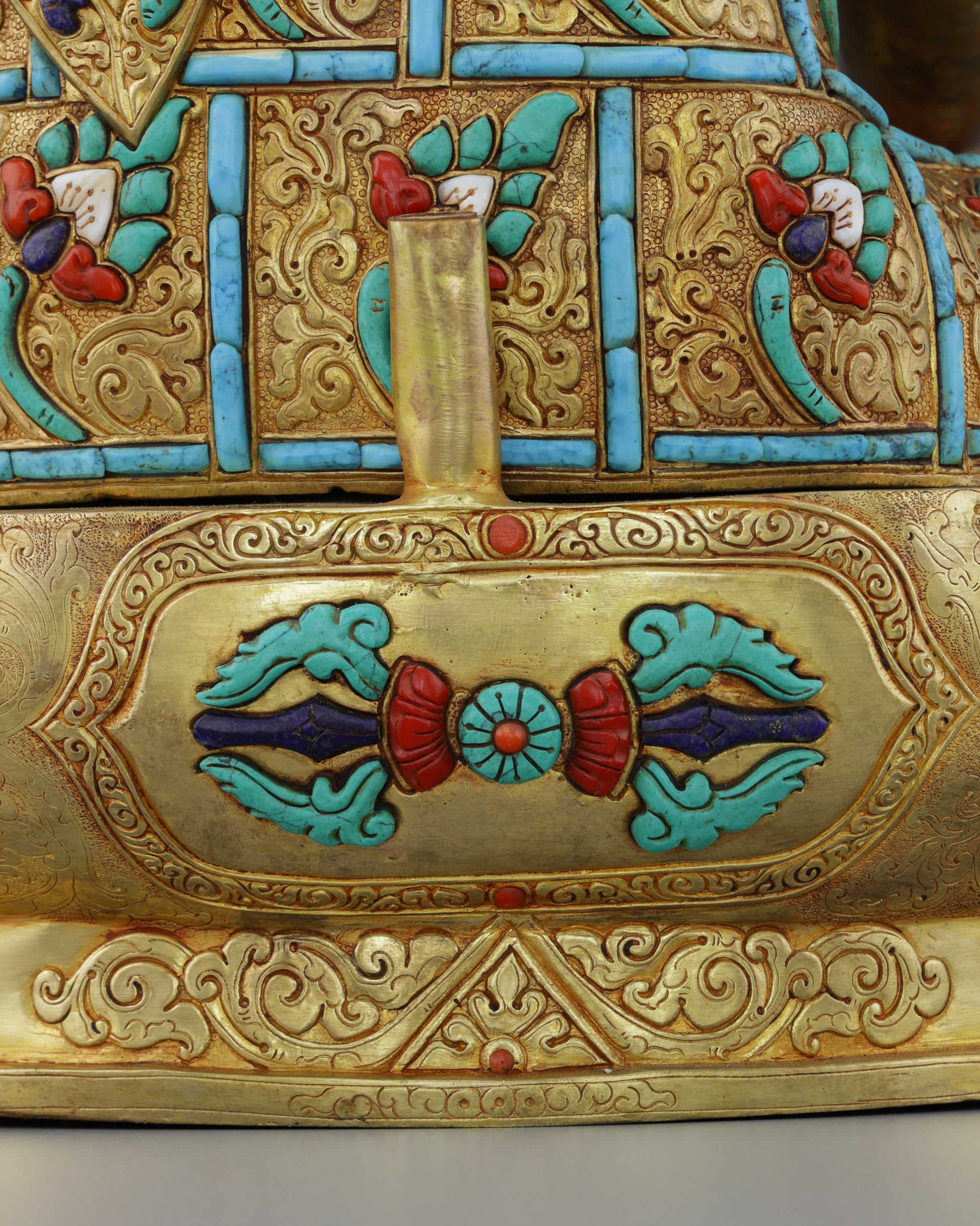 This breathtaking Sakyamuni Buddha statue represents the pinnacle of Nepalese Buddhist artistry, combining luminous 24k gold gilding with an extraordinary display of hand-carved turquoise, coral, and lapis lazuli gemstones. Standing majestically at over 22 inches tall, the historical Buddha sits in earth-touching mudra beneath an elaborate golden aureole topped with Garuda. His serene golden face contrasts beautifully with deep blue hair, while his robes and ornaments shimmer with turquoise inlays and intricate gold paintings, creating a masterpiece that radiates enlightened presence from every angle.
