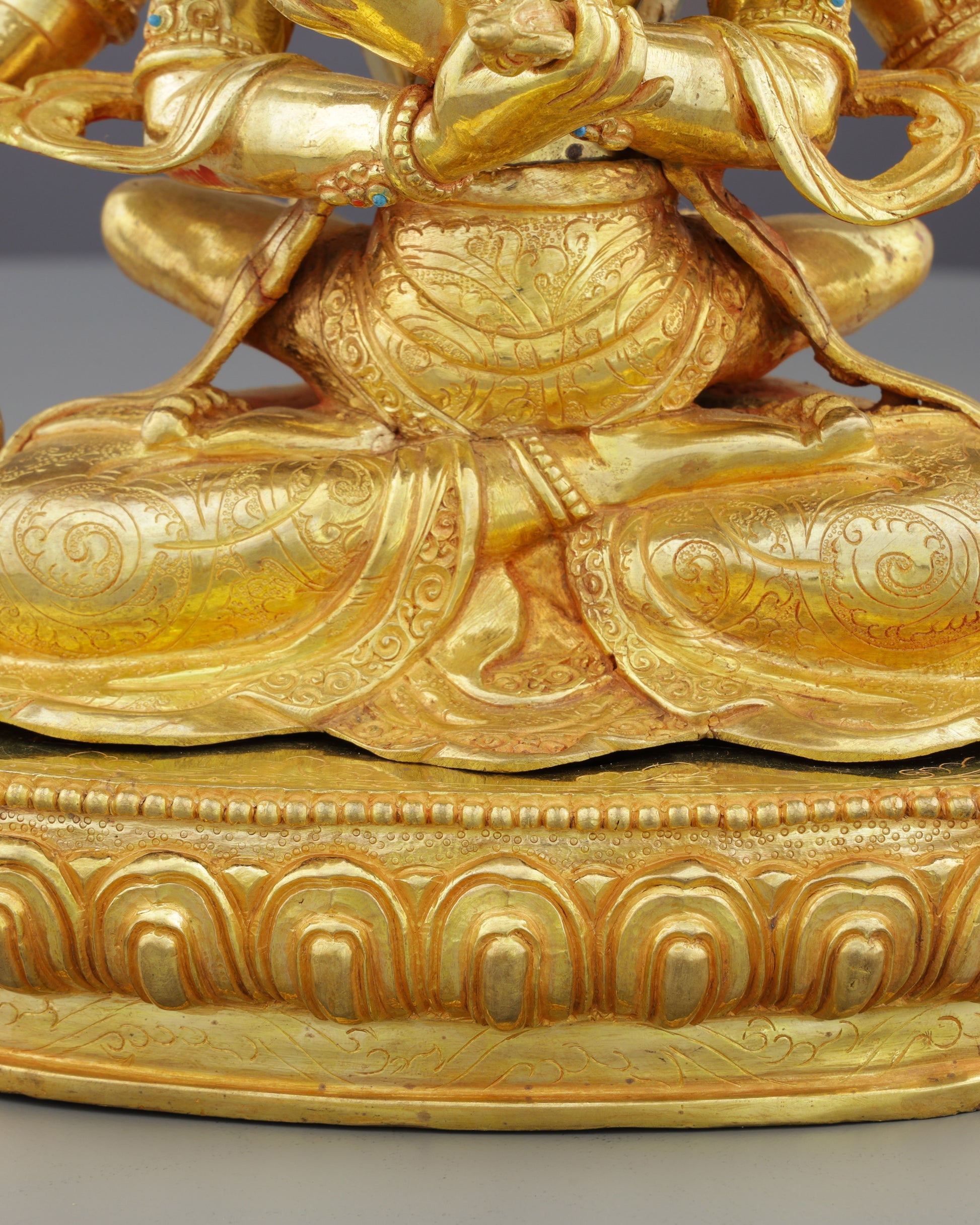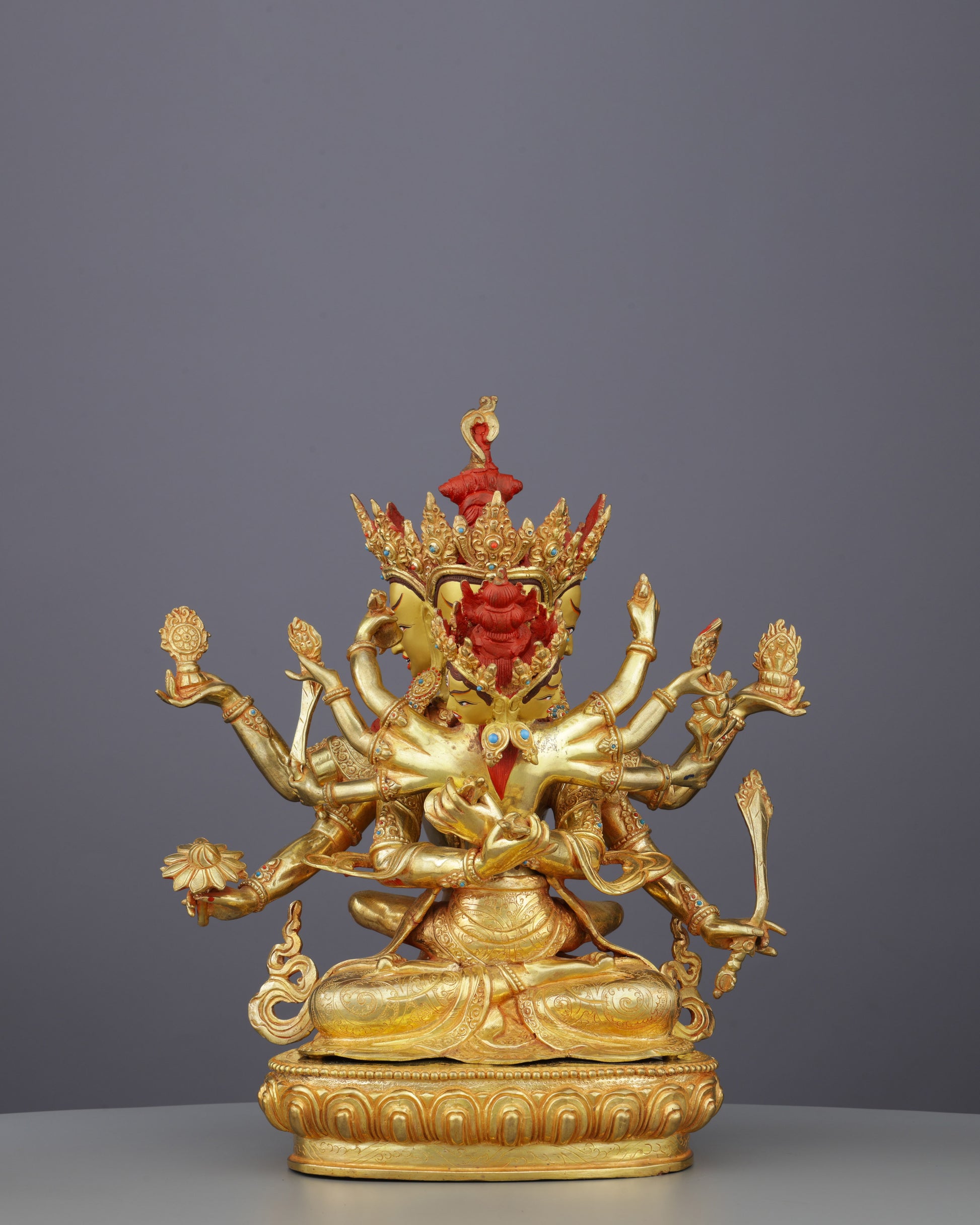 This extraordinary sculpture showcases masterful Nepalese craftsmanship at its finest. The substantial 6.40 kg copper construction ensures durability and commanding presence, while the 24K gold gilding radiates divine luminosity. Each of the twelve arms holds symbolic ritual implements rendered with exceptional detail—from vajras and bells to skulls and lotus flowers. The precious turquoise and red coral inlays add vibrant color contrasts, highlighting the deity's ornate jewelry and crown. The flaming mandorla backdrop features intricate filigree work, while the yab-yum (father-mother) union depicts the mystic embrace with remarkable artistic sensitivity. The ornate lotus throne foundation completes this masterpiece, making it an unparalleled centerpiece for serious practitioners and collectors of sacred Himalayan art.
