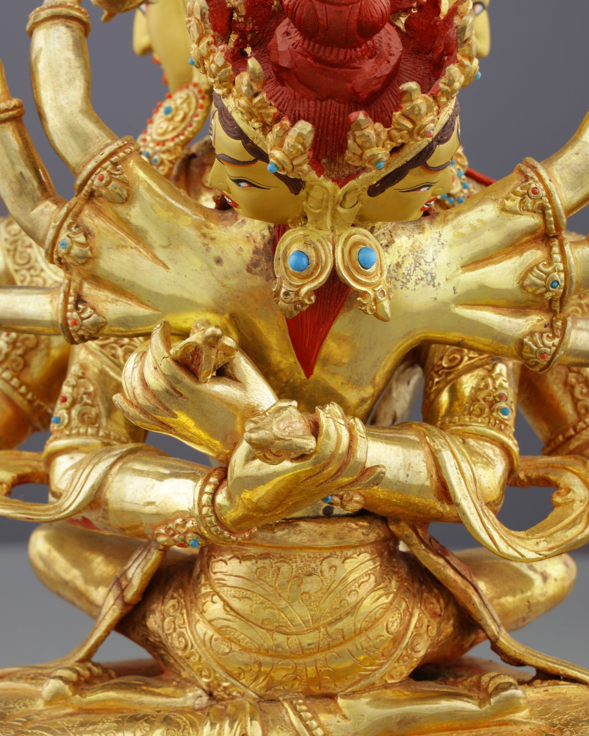 The deity's twelve arms symbolize mastery over the twelve links of dependent origination, each hand wielding implements representing different aspects of tantric realization. The central hands embrace his consort Sparshavajri in mystical union, symbolizing bliss-emptiness indivisibility. His three faces—golden, white, and red—represent the transformation of body, speech, and mind into enlightened states. The elaborate five-skull crown signifies conquest over the five poisons transformed into five wisdoms. The fierce yet serene expression balances wrathful and peaceful aspects, while precious jewel inlays accentuate his divine ornaments.
