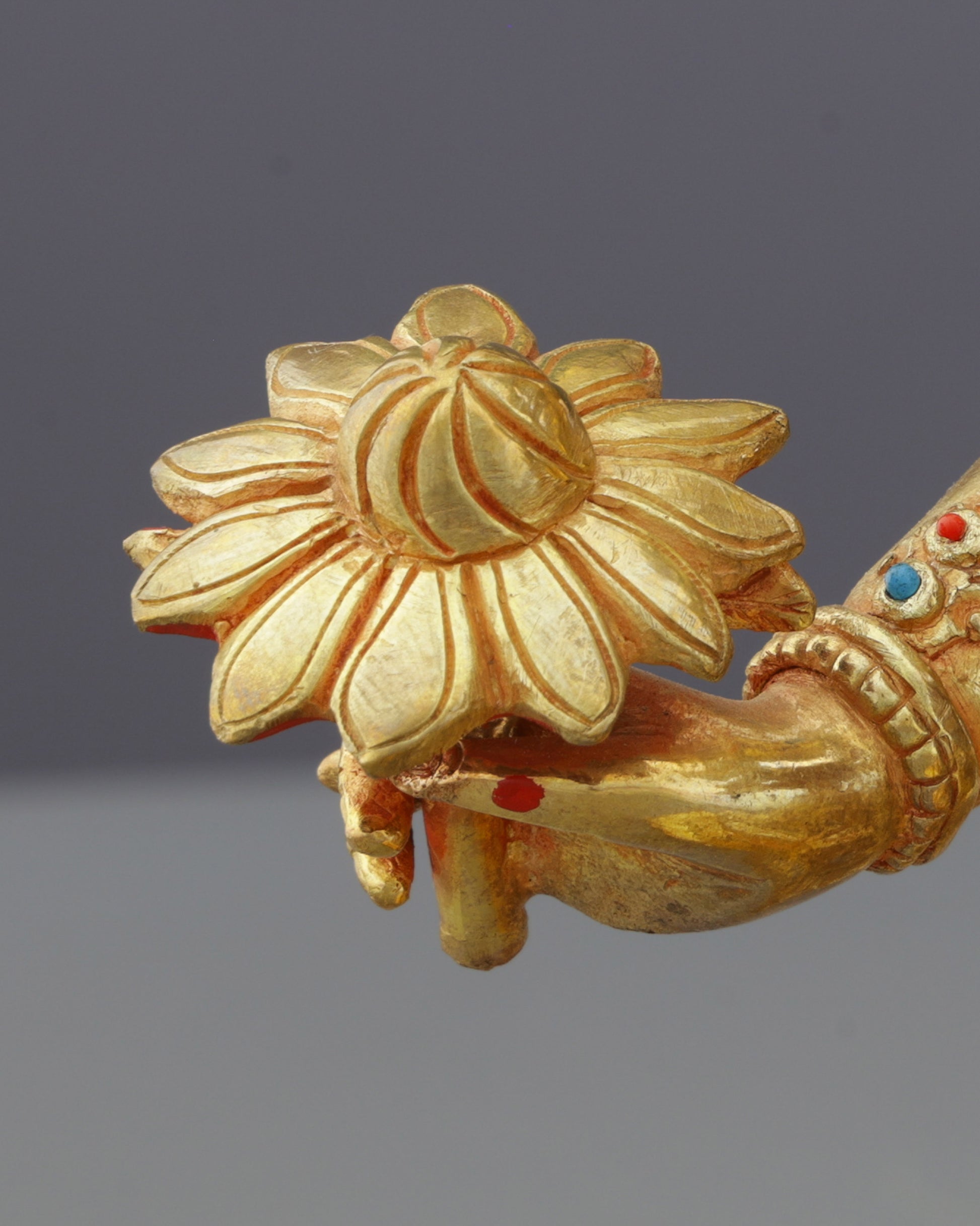 Materials: 24K gold gilded face, copper body, gold plated with acrylic paintings, turquoise and red coral inlays