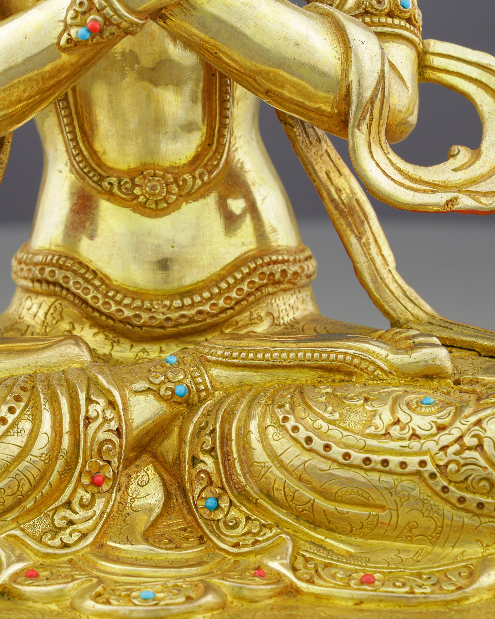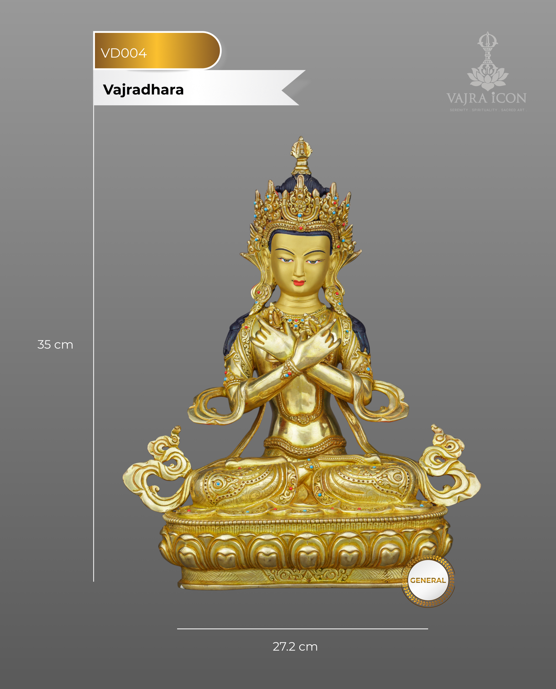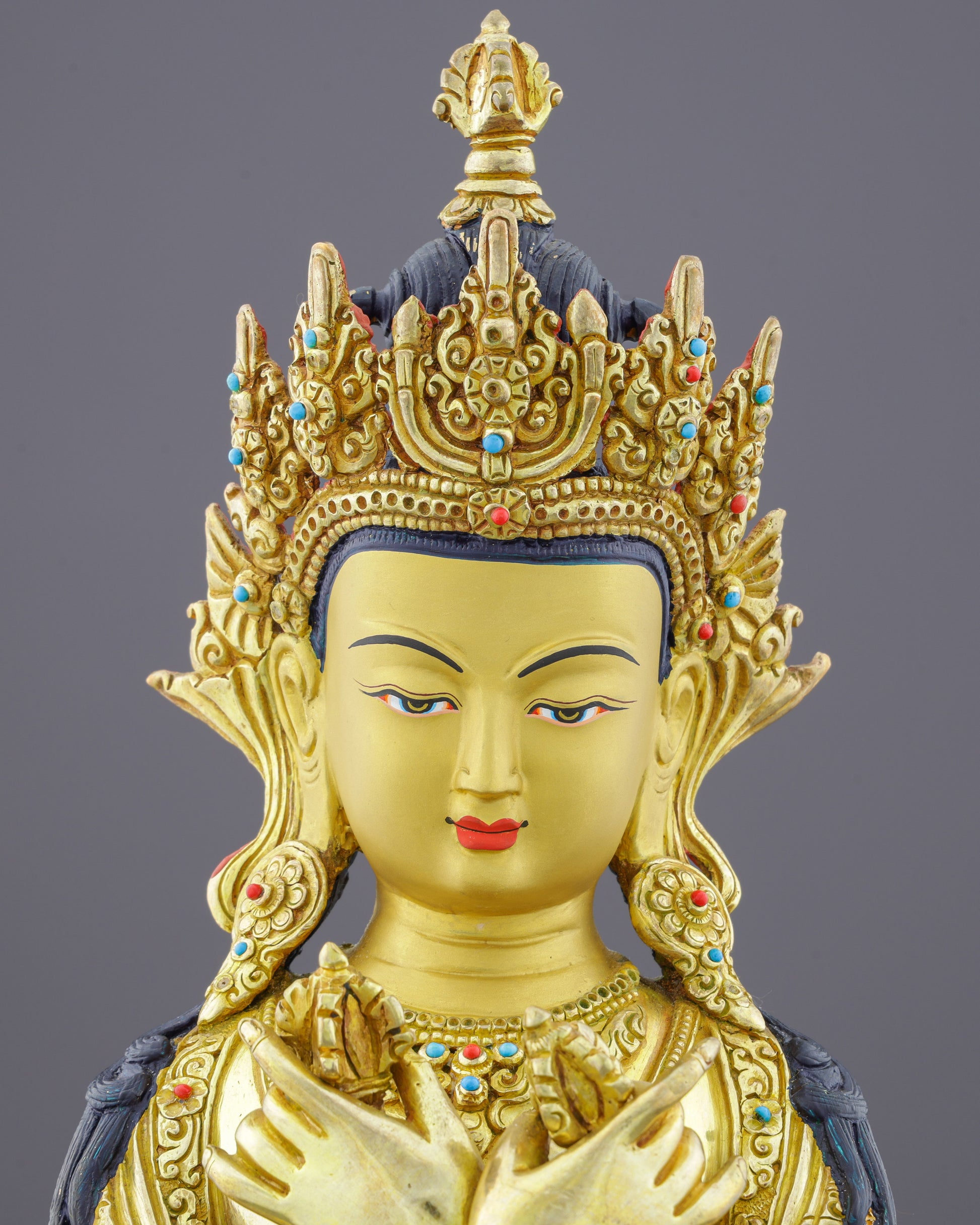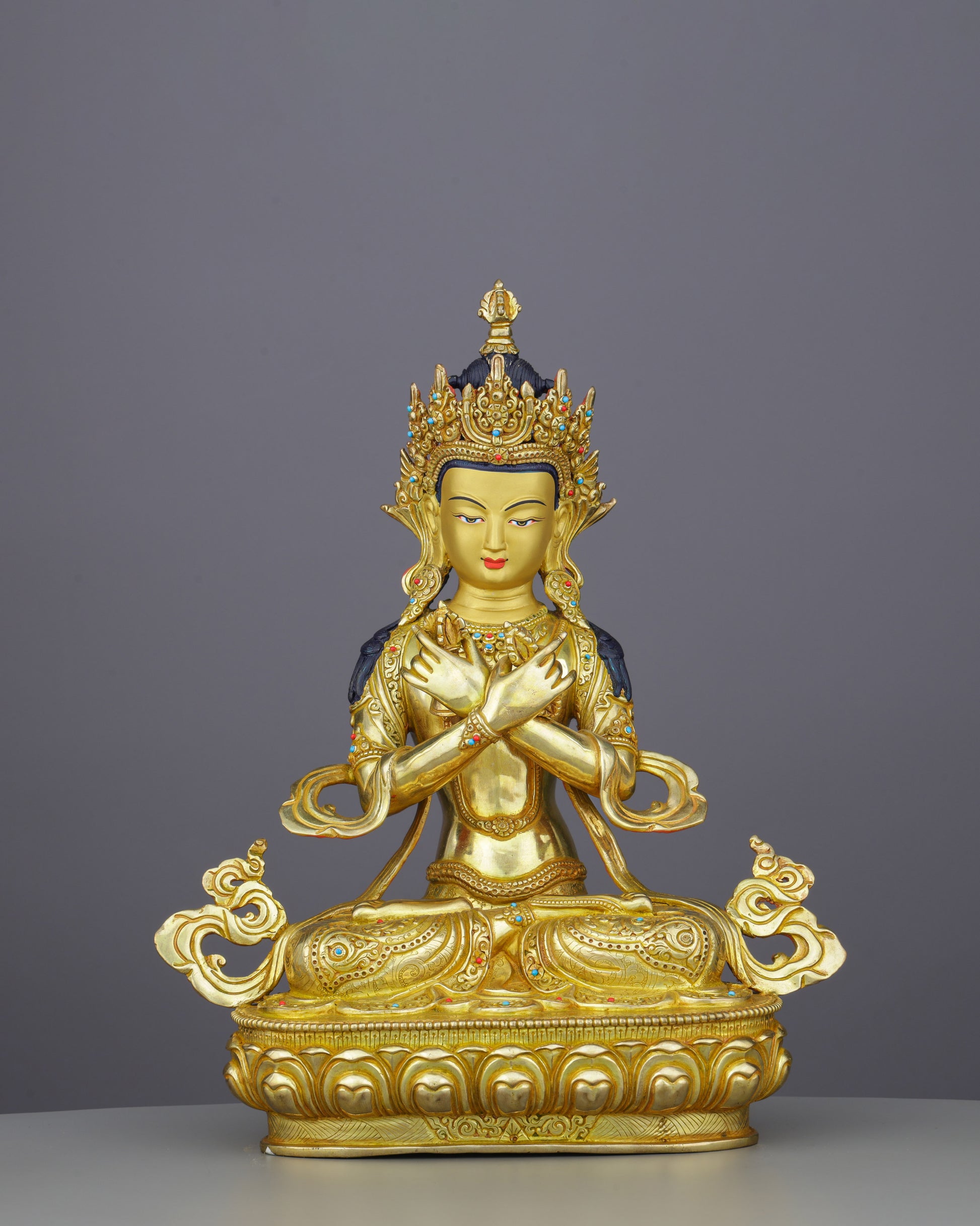 The deep blue body (represented here in gold) traditionally symbolizes the dharmakaya—the true body beyond form. The elaborate crown and jeweled ornaments represent his mastery of all Buddha qualities. The crossed vajra and bell signify the ultimate non-dual union that transcends all conceptual boundaries.