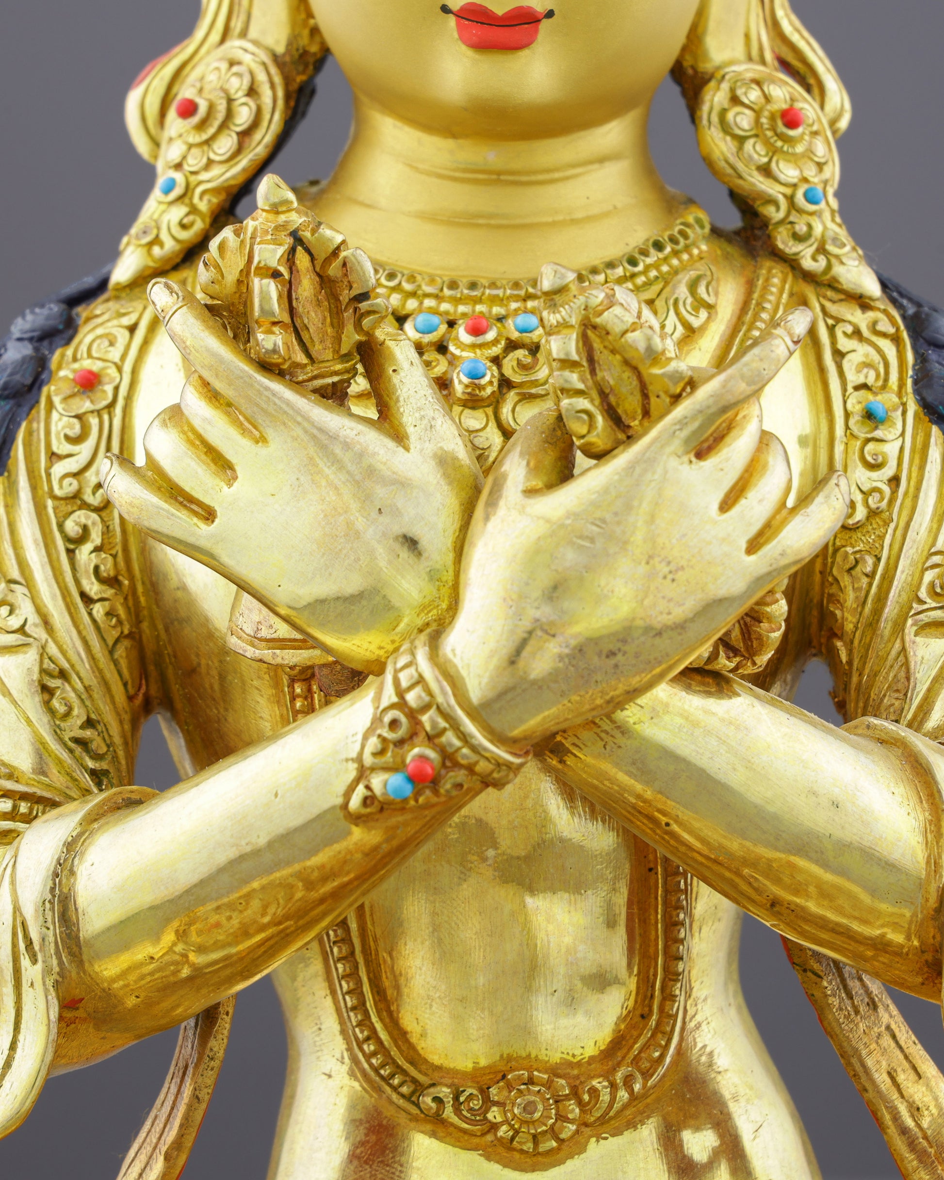 Vajradhara's half-closed eyes reflect perfect meditative absorption in the nature of reality. His distinctive crossed-arm gesture (vajrahumkara mudra) holds a vajra in the right hand symbolizing skillful means and method, while the left hand holds a bell representing wisdom and emptiness. This symbolic union demonstrates the inseparable nature of compassion and wisdom that characterizes enlightenment. His serene posture in full lotus position represents unshakeable meditative stability, while his adorned body reflects the sambhogakaya—the body of bliss and perfect enjoyment.