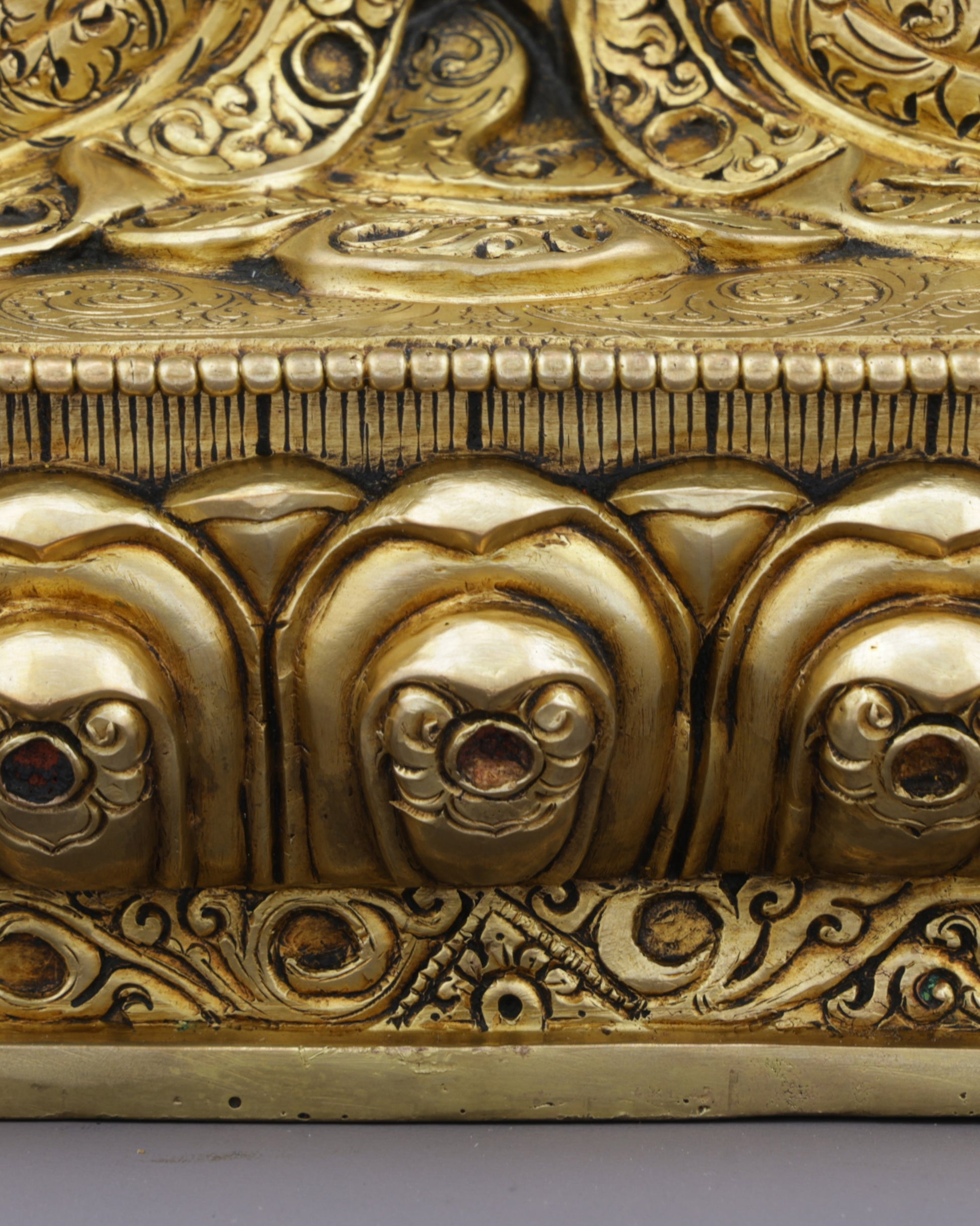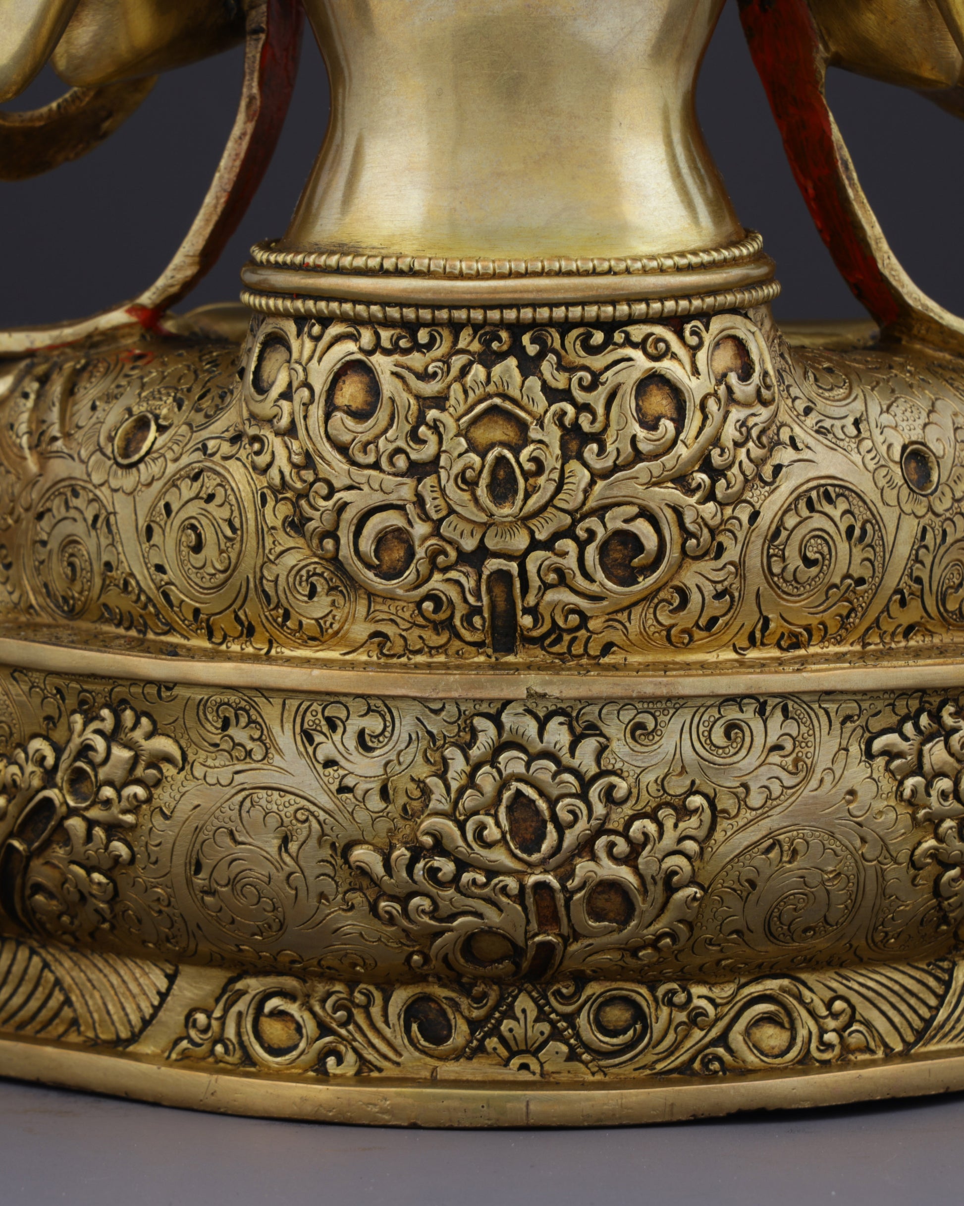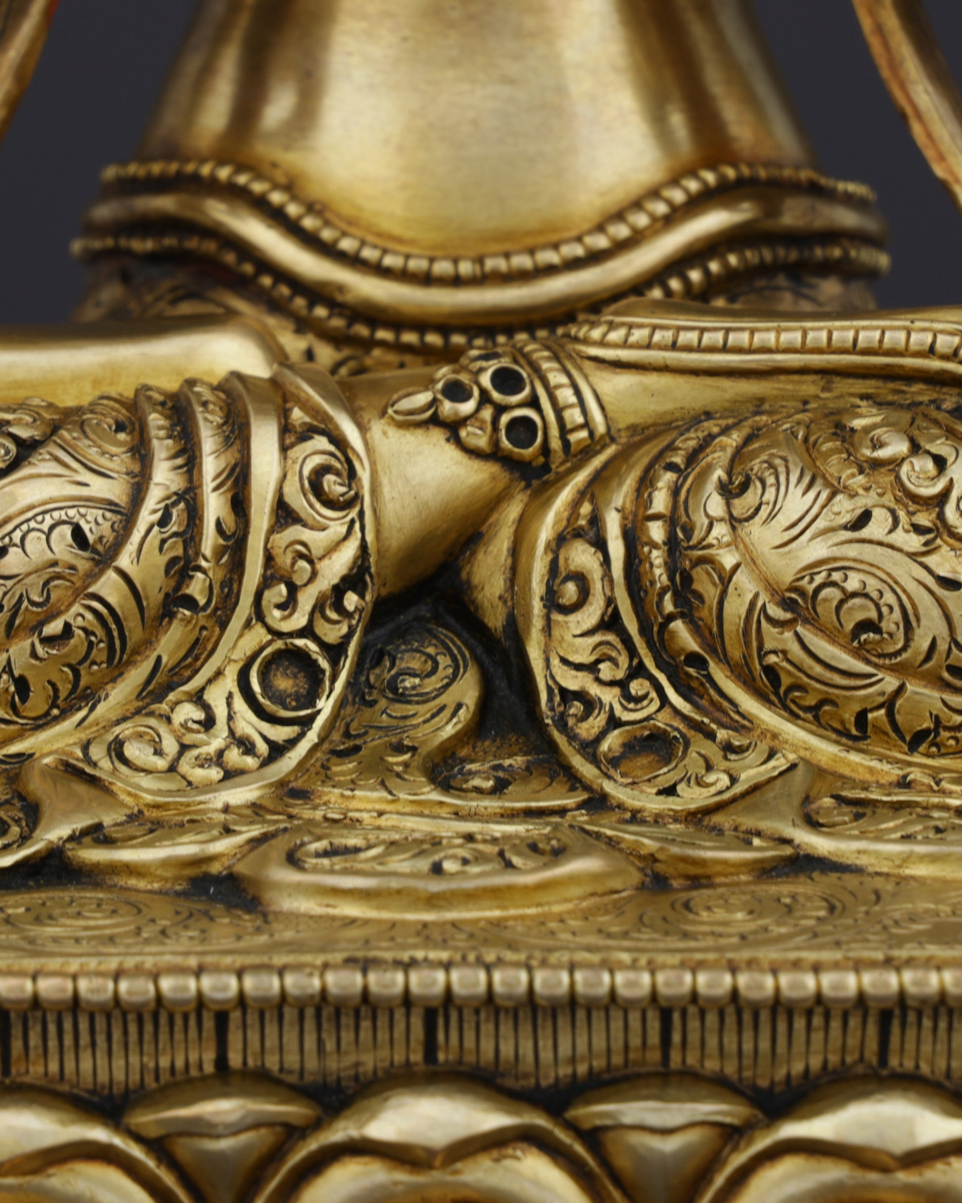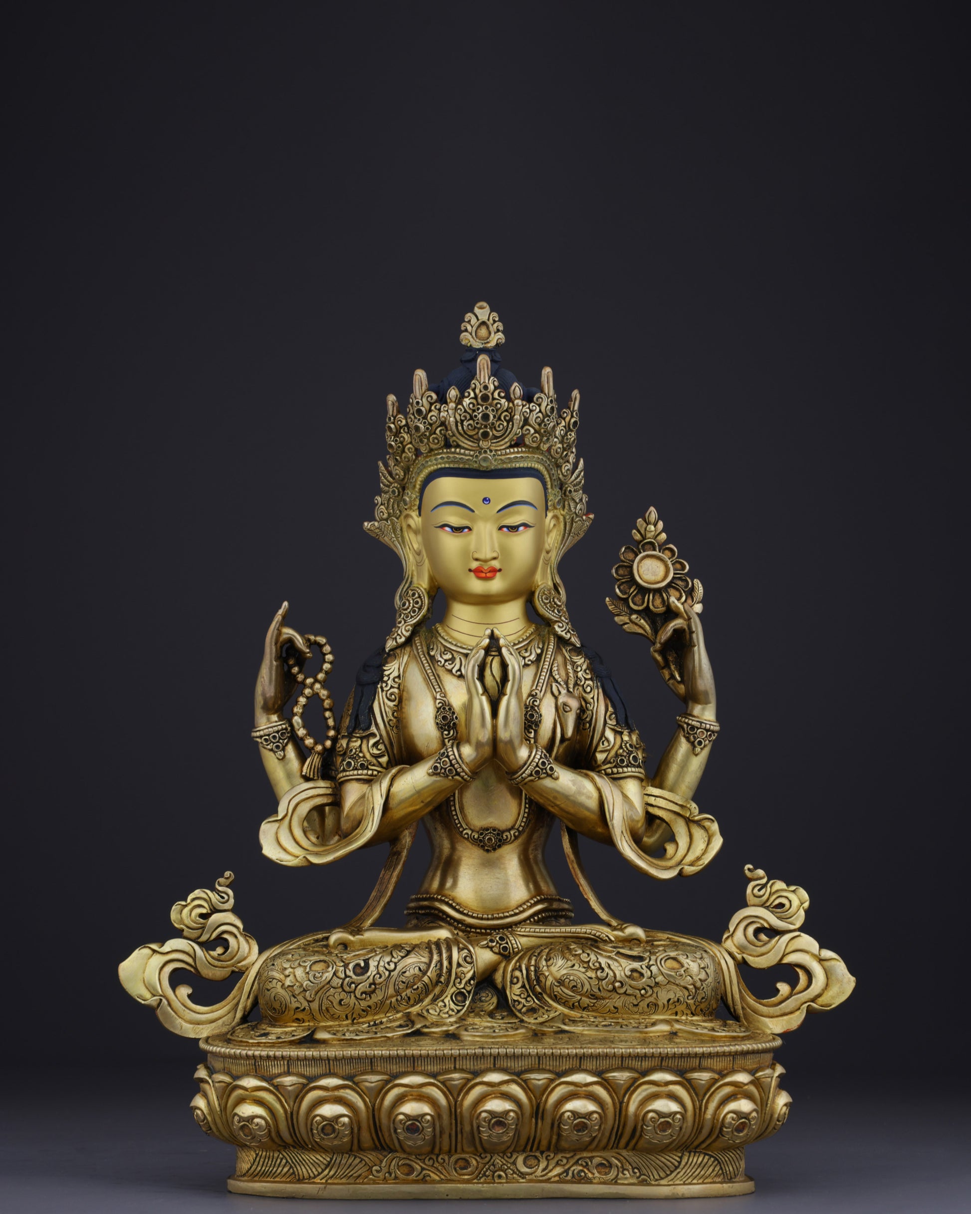 This exquisite statue captures Chengresi's serene majesty through masterful Nepalese artistry. His half-closed eyes radiate infinite compassion and mindful awareness, gazing upon all beings with loving-kindness. His four hands hold profound significance: two pressed together at his heart in prayer mudra, representing devotion, while the upper hands gracefully hold a crystal rosary for counting mantras and a blooming lotus symbolizing purity rising from suffering. Seated in perfect meditation posture upon an ornate lotus throne, his upright yet relaxed bearing embodies the balance between active compassion and peaceful wisdom.