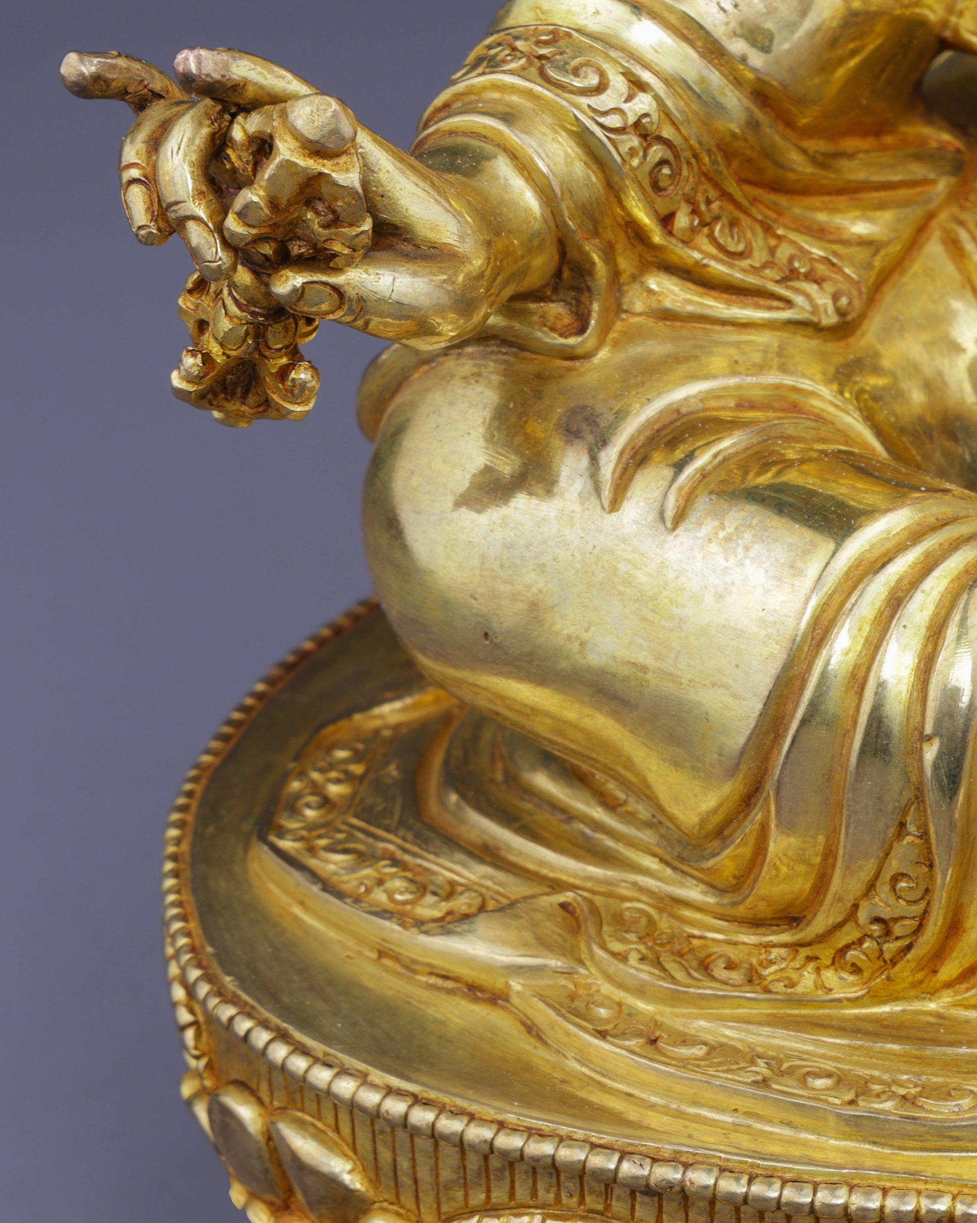 Hand Positions: His right hand holds the five-pronged vajra (thunderbolt), symbolizing indestructible reality and skillful means. The left hand cradles a skull cup containing the vase of immortality, representing the transformation of death into wisdom. Both hands demonstrate his power over life, death, and rebirth.
