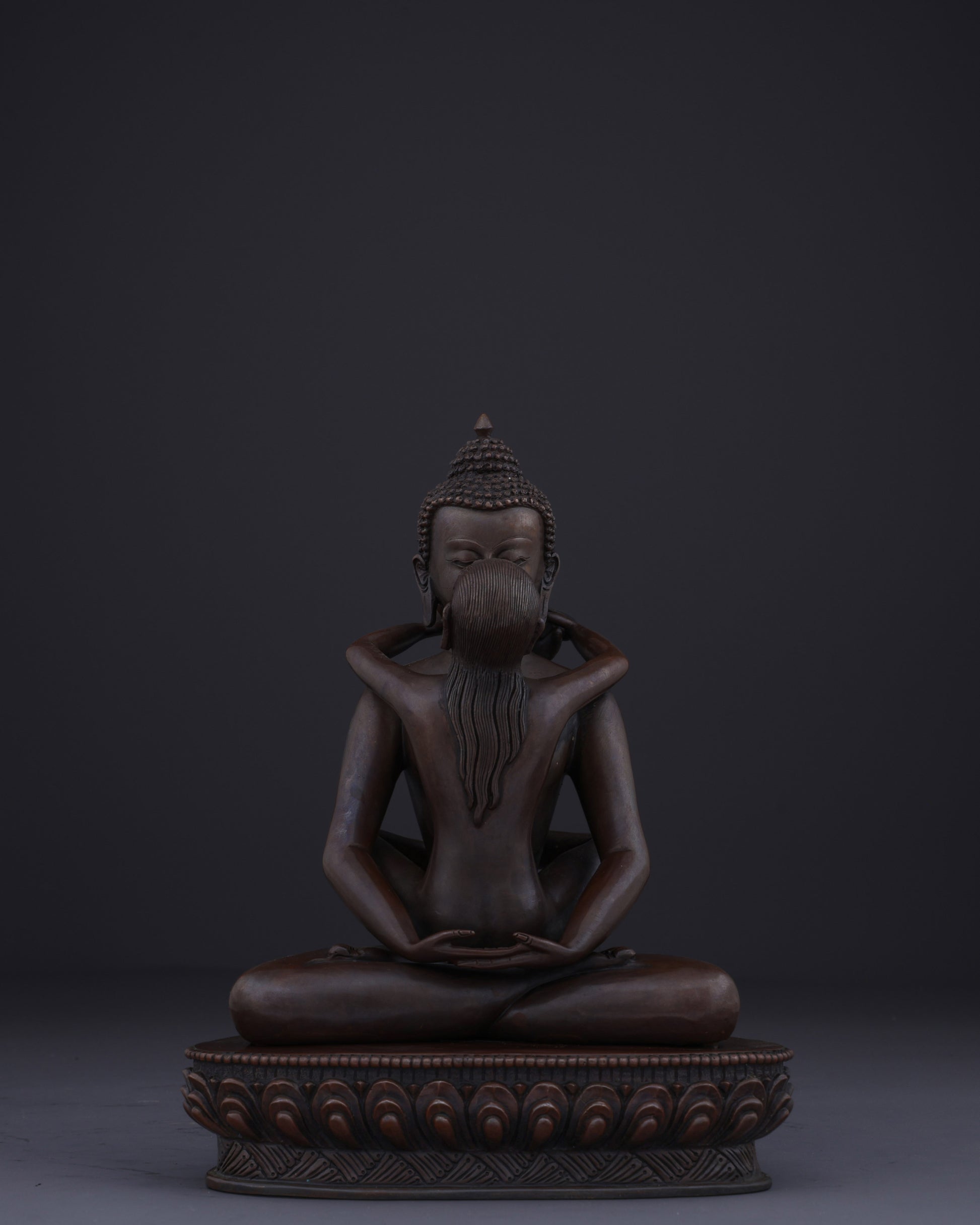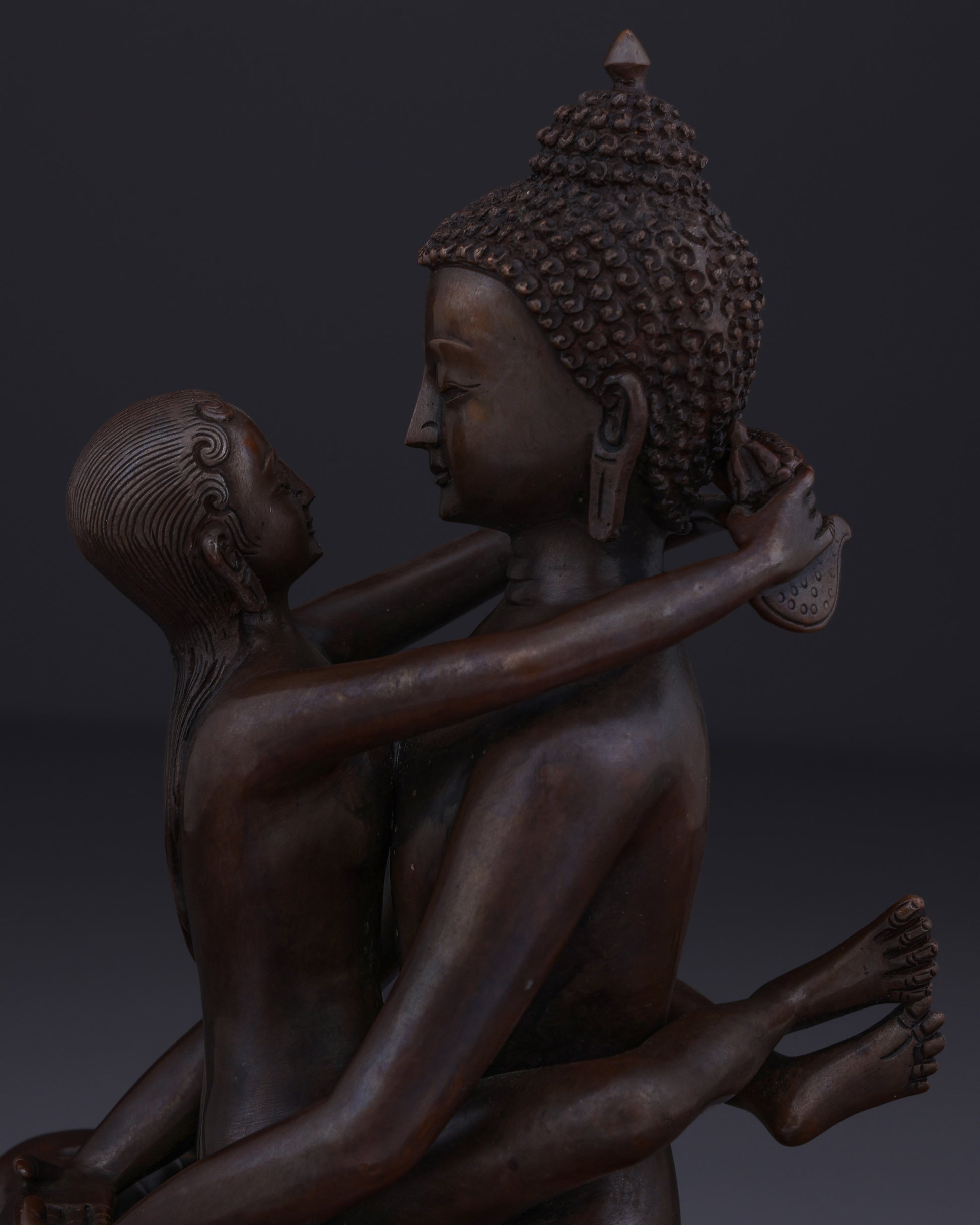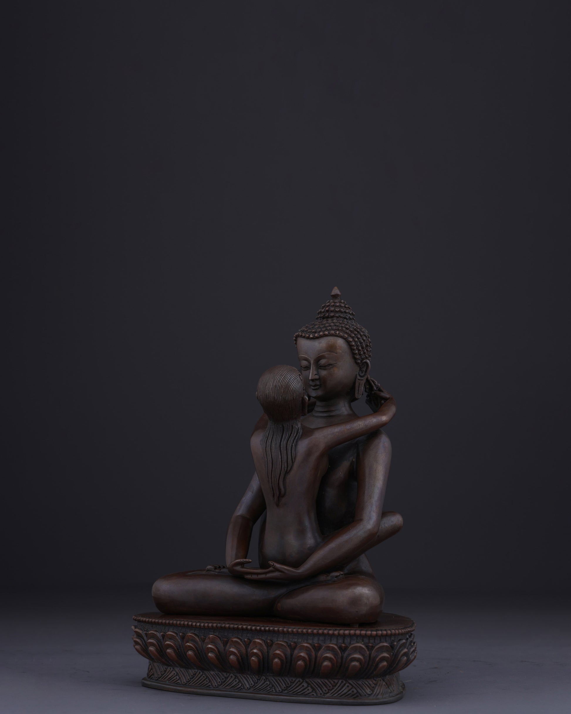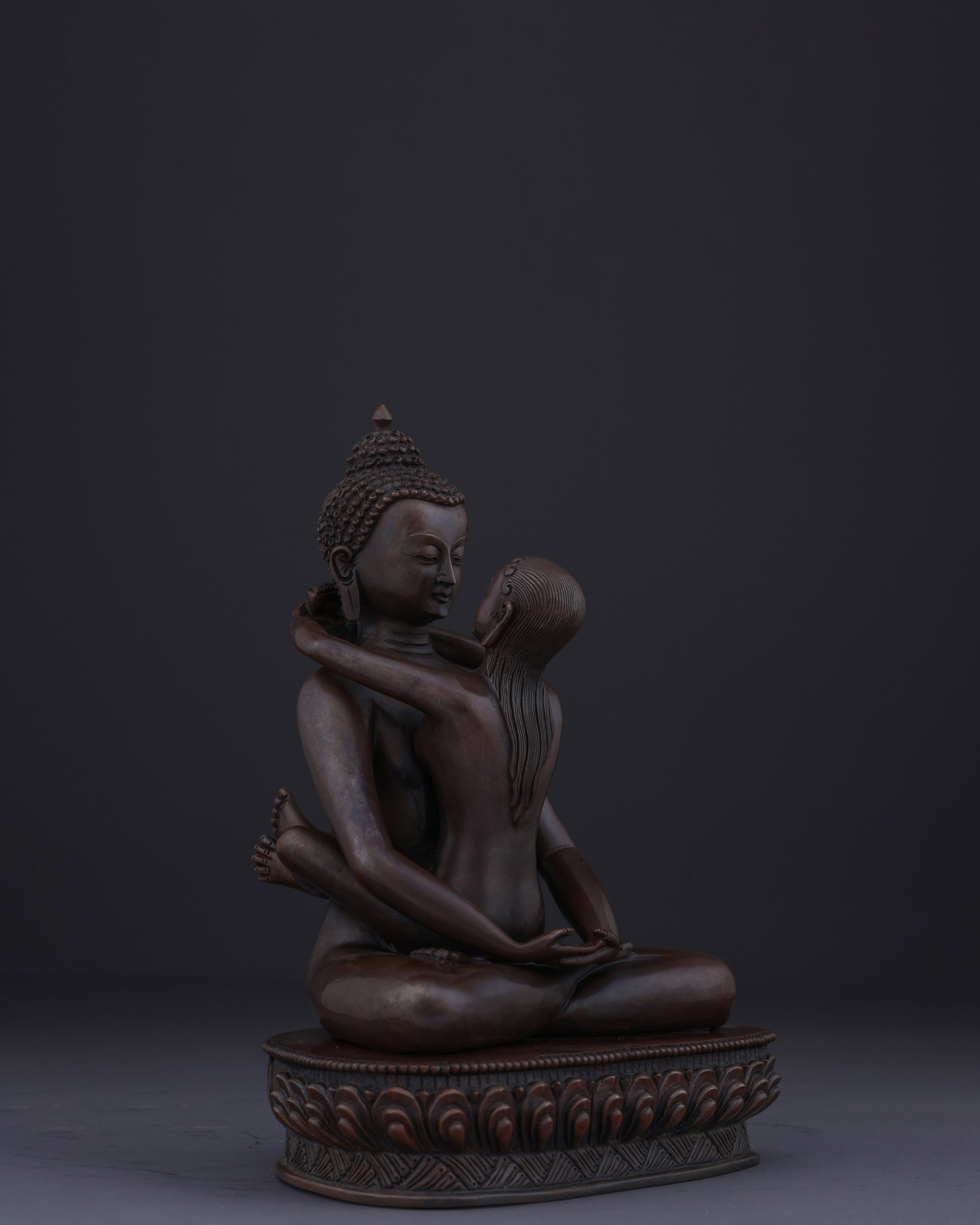 This union statue represents the ultimate tantric teaching of non-duality. The oxidized copper finish symbolizes the timeless, unconditioned nature of primordial awareness. Their naked forms signify freedom from all conceptual coverings and artifice, revealing the pure essence of enlightened consciousness. The lotus base represents the purity of their realization, untainted by the mud of samsaric existence.