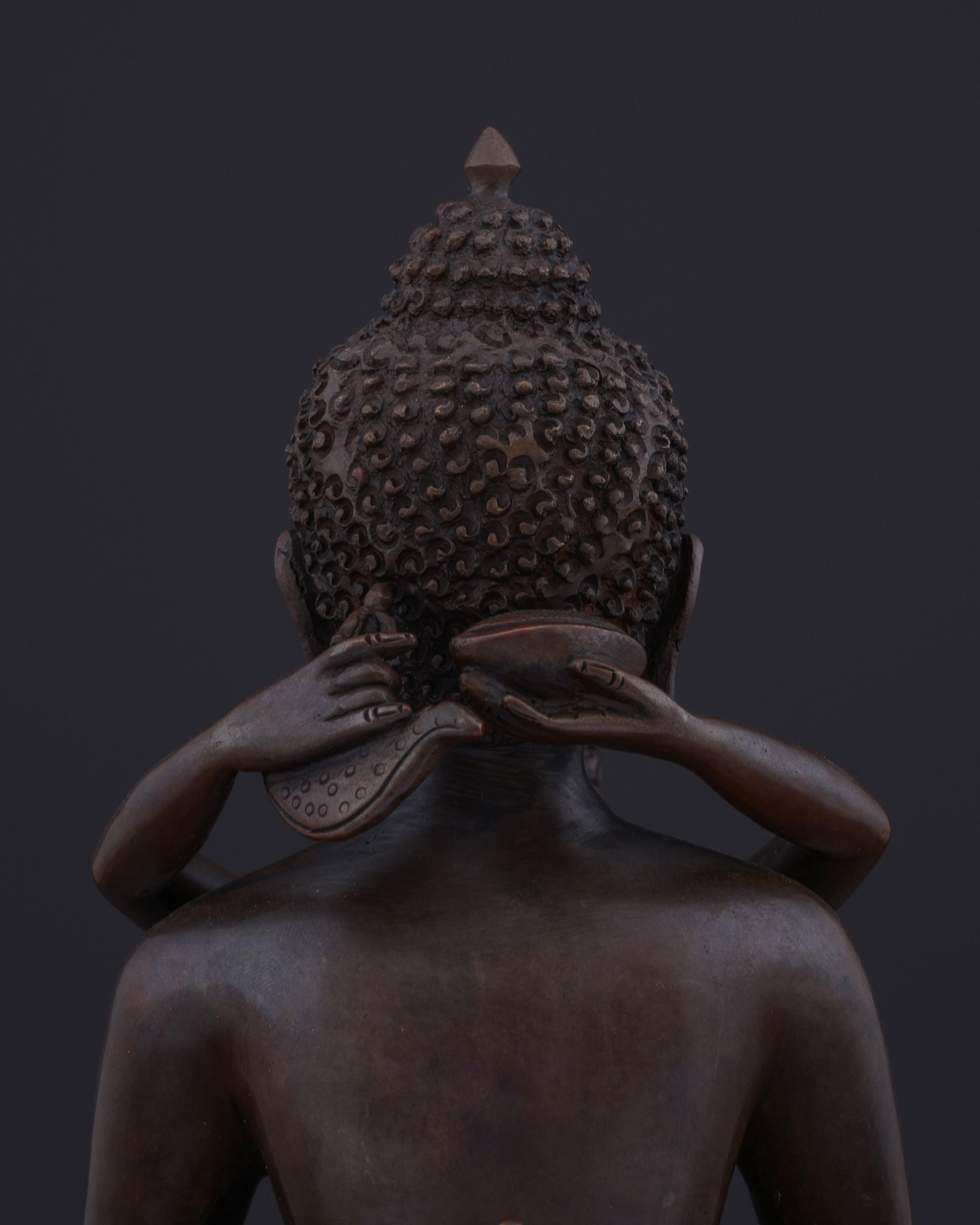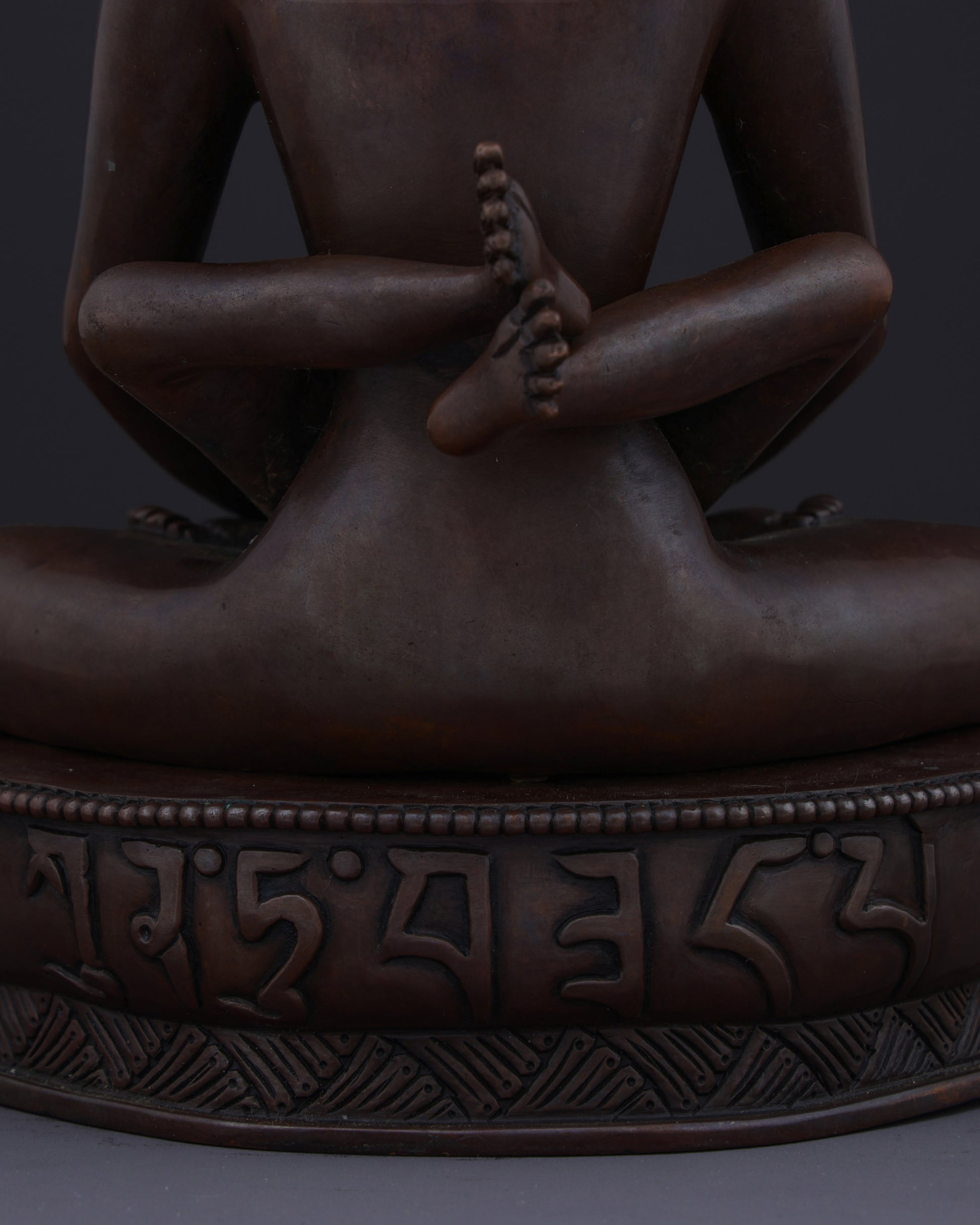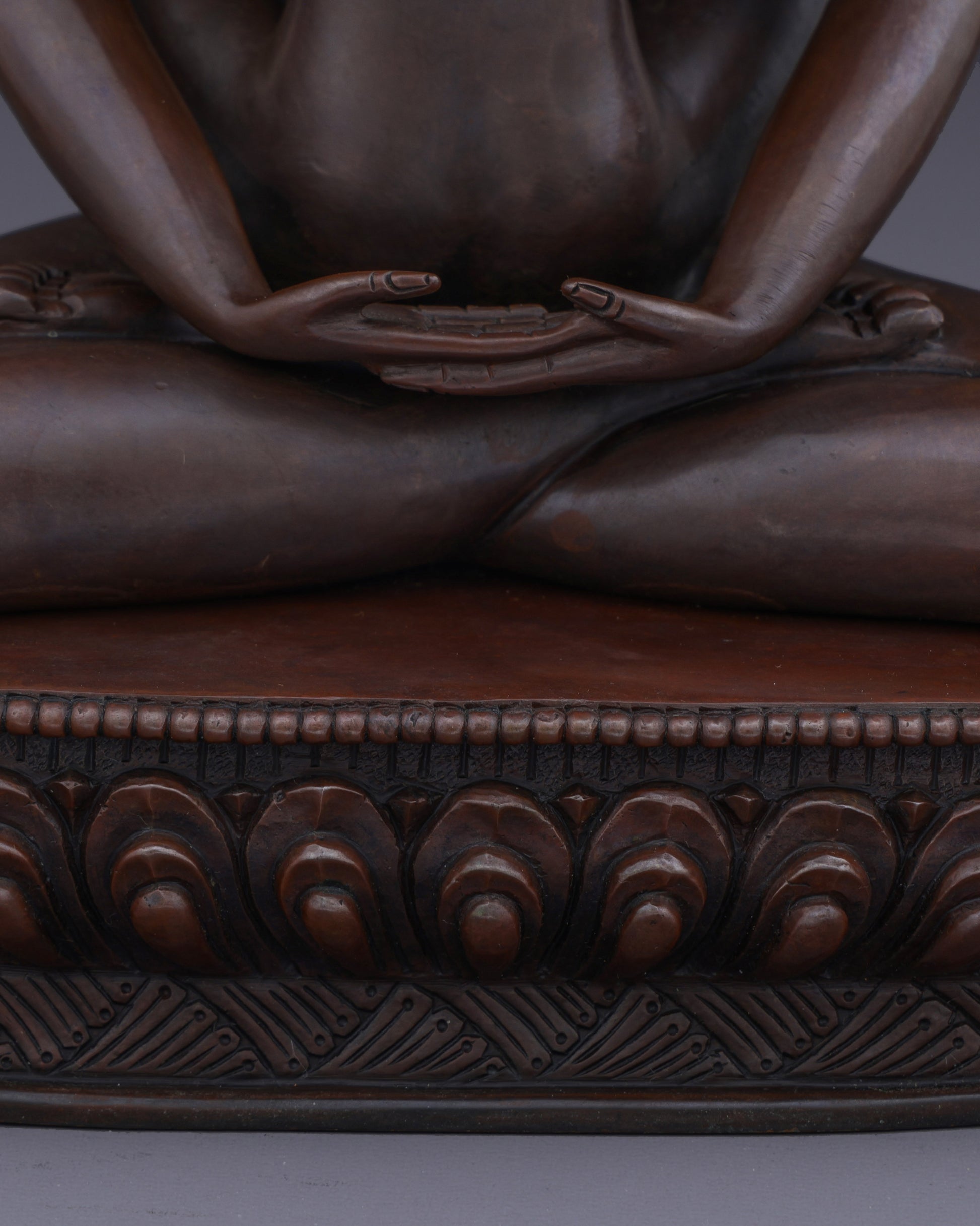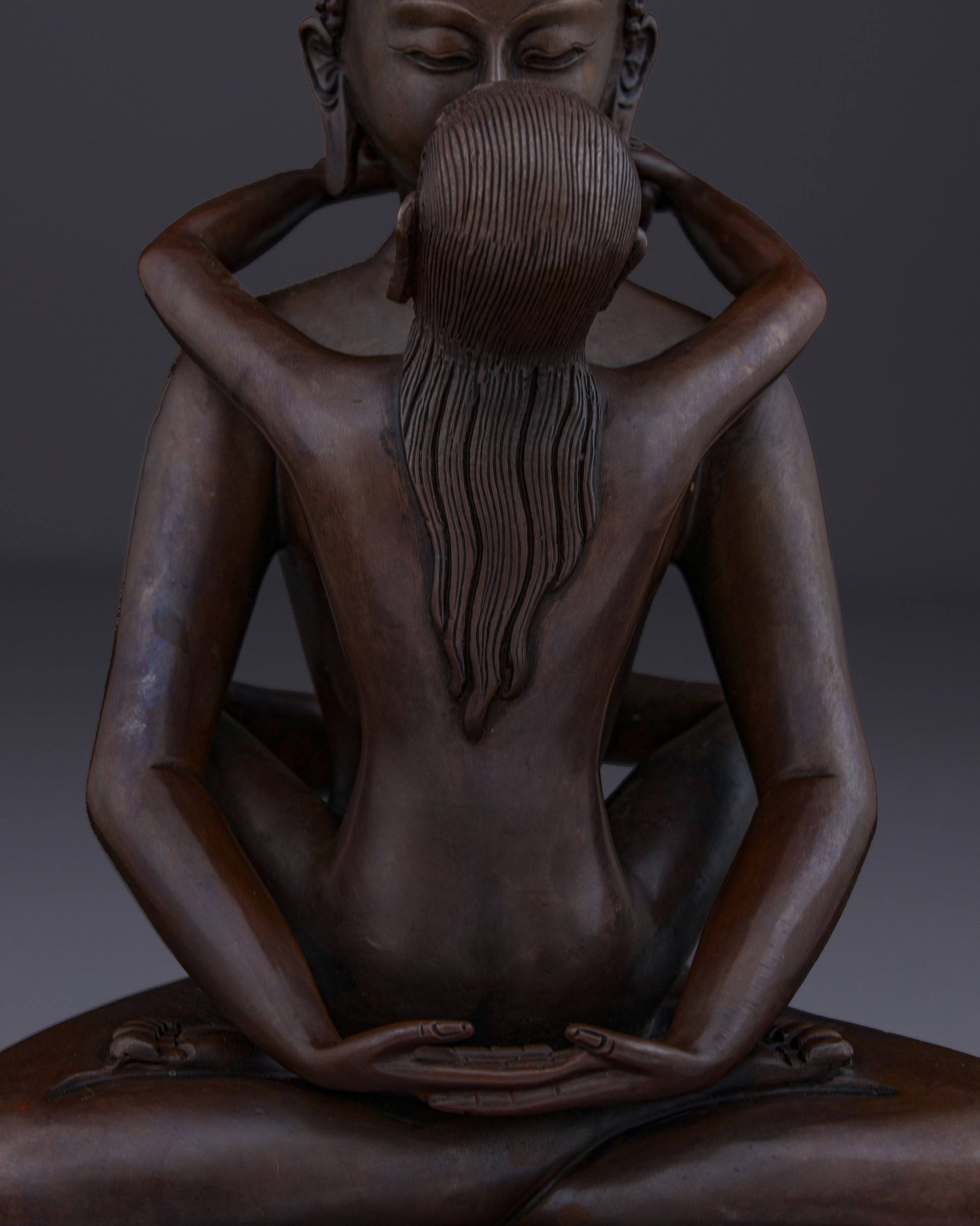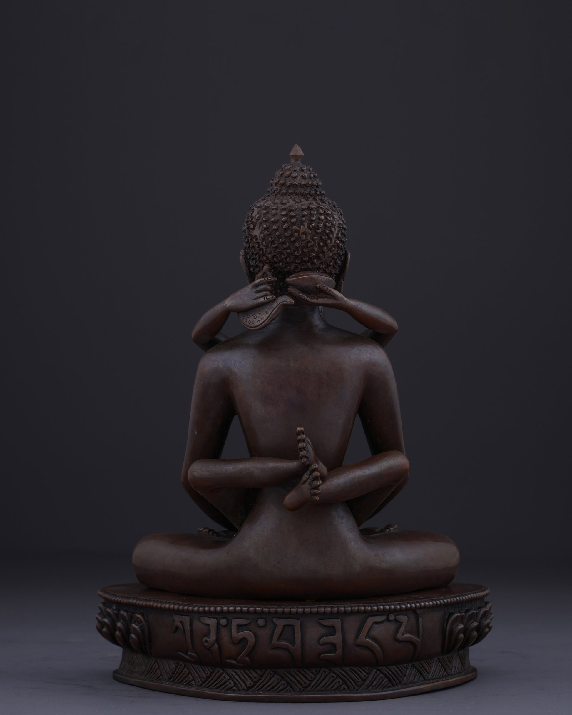 This union statue represents the ultimate tantric teaching of non-duality. The oxidized copper finish symbolizes the timeless, unconditioned nature of primordial awareness. Their naked forms signify freedom from all conceptual coverings and artifice, revealing the pure essence of enlightened consciousness. The lotus base represents the purity of their realization, untainted by the mud of samsaric existence.