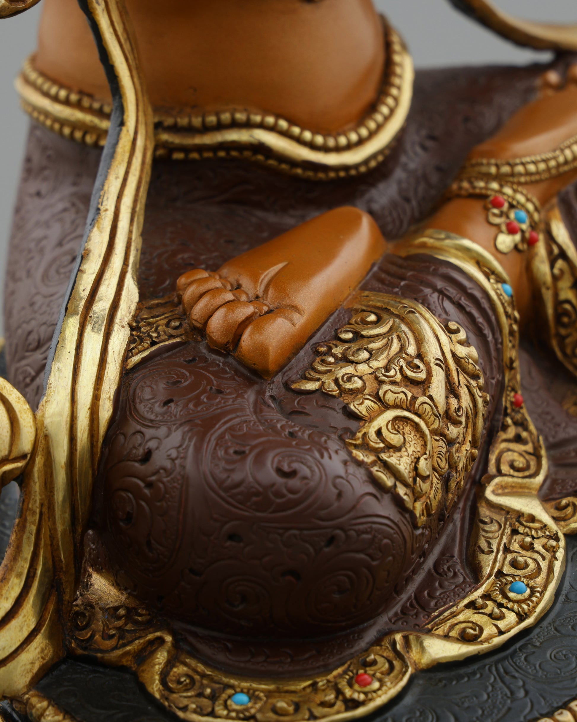 This exceptional Manjushri statue showcases the renowned craftsmanship of Kathmandu Valley artisans. The robust copper construction provides lasting durability, while the radiant gold plating creates an ethereal glow that transforms any space. The warm orange-brown acrylic finish gives the deity a lifelike, meditative presence. Precious turquoise and coral inlays embellish the crown and ornaments, reflecting traditional Himalayan artistry. At 33.5 centimeters, this statue offers a commanding presence while remaining perfectly proportioned for personal shrines, meditation rooms, or study spaces. The intricate detailing—from the delicate facial features to the precisely rendered sword and scripture—demonstrates hours of devoted handwork by master craftsmen preserving centuries-old techniques.