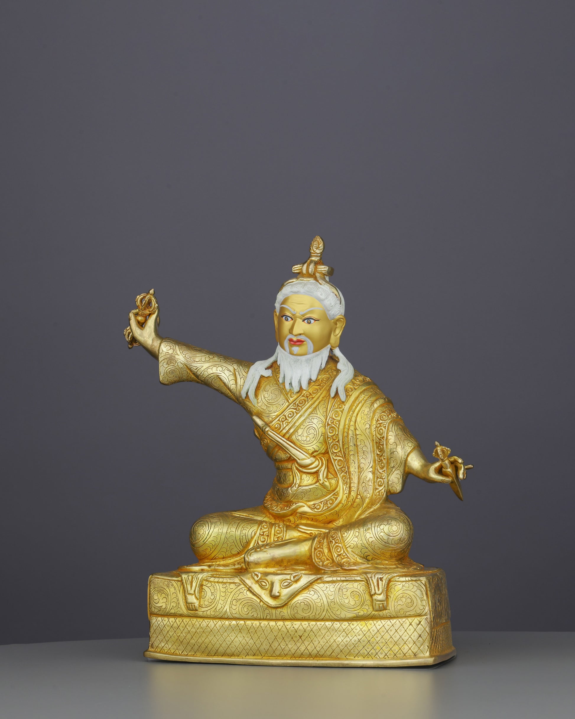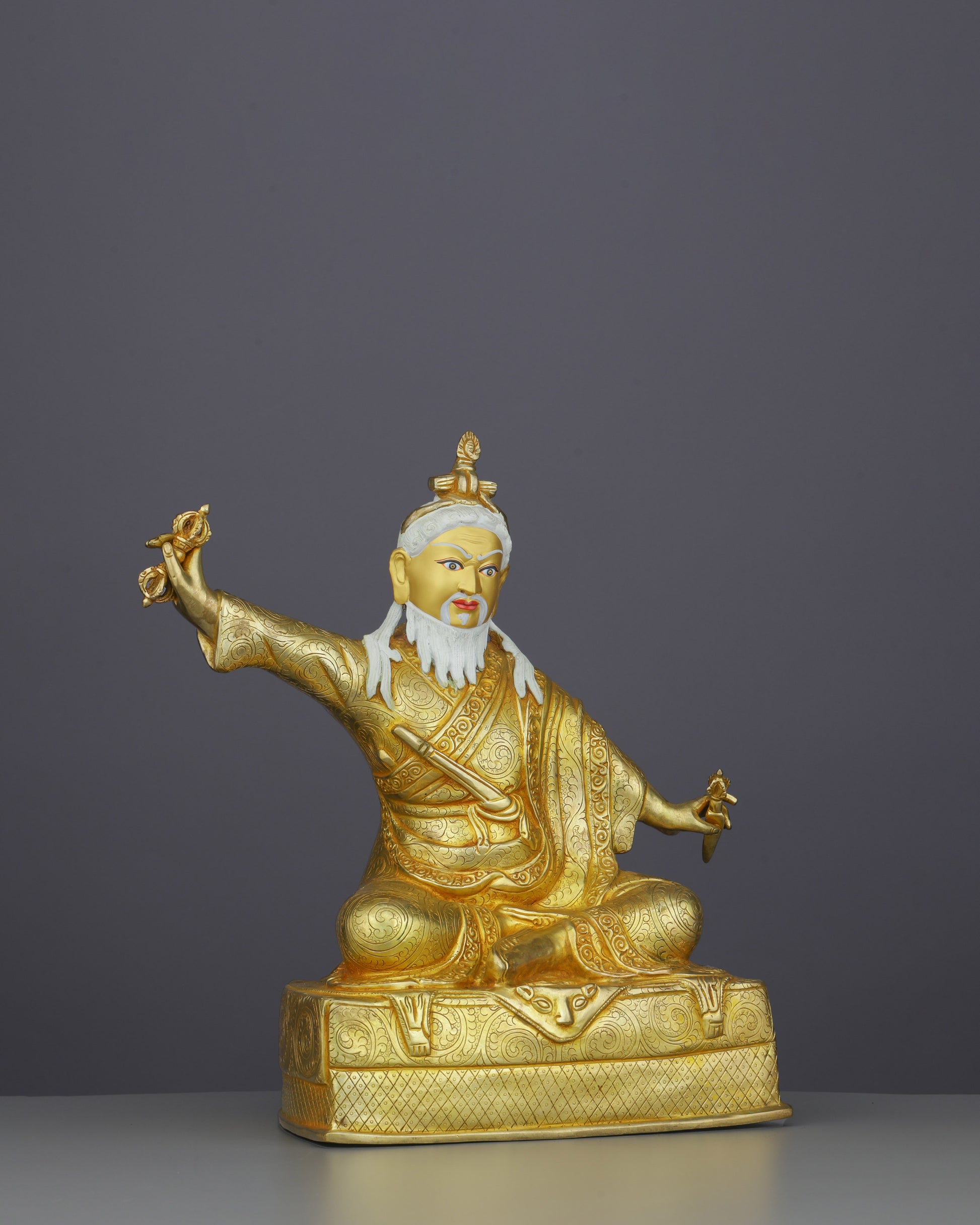 Dudjom Lingpa sits in royal ease posture, embodying confidence and spiritual mastery. His right hand holds the vajra aloft in a dynamic gesture of wrathful compassion, dispelling obstacles and negativity. His left hand grasps the phurba (ritual dagger), symbolizing the destruction of ego and ignorance. The piercing gaze with painted blue eyes radiates wisdom and fierce compassion, while his flowing white beard represents advanced realization. The distinctive topknot crowned with a wisdom flame signifies his enlightened awareness.