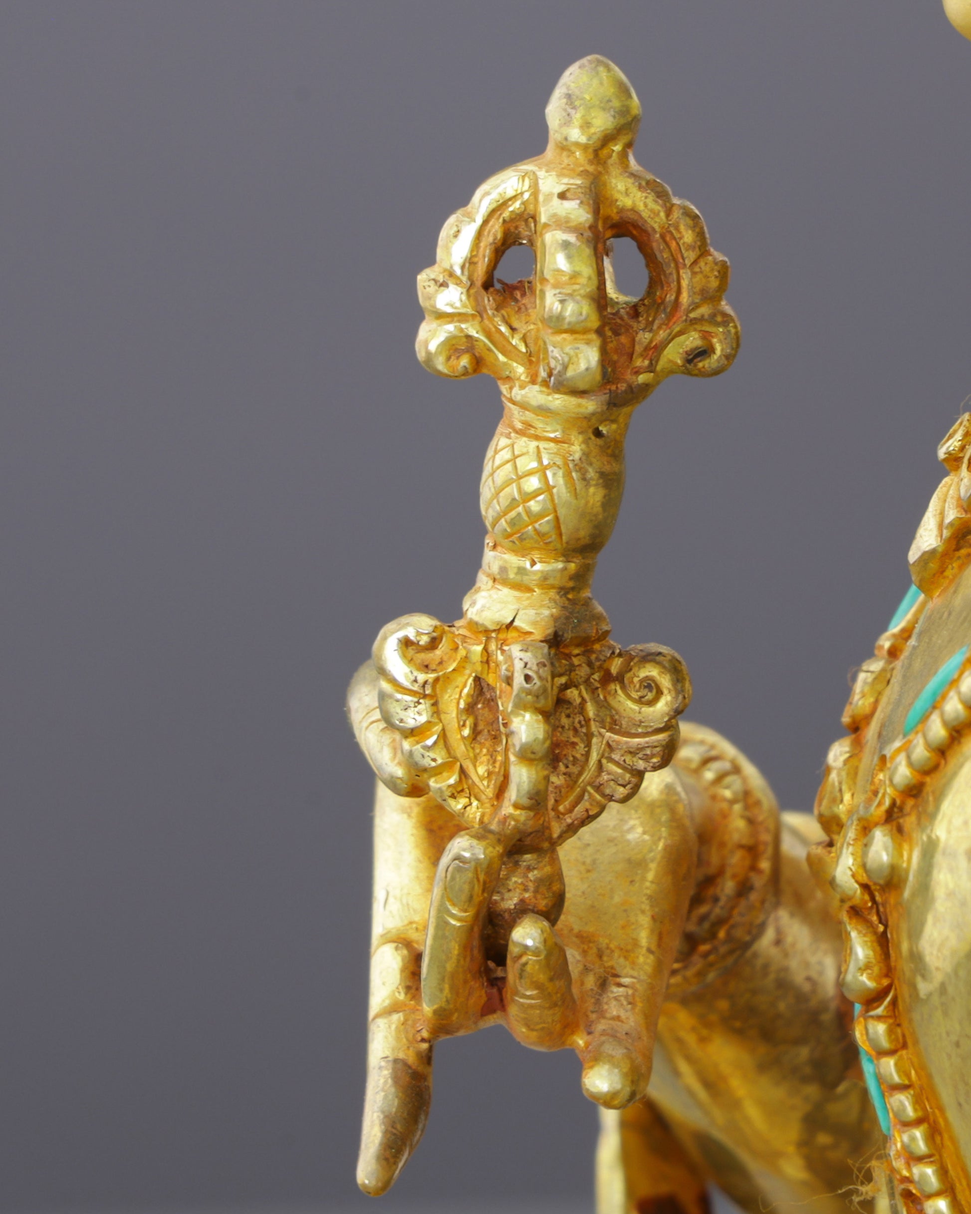 Materials: 24K gold gilded, copper body, gold and acrylic paintings, handcarved turquoise and red coral gemstones