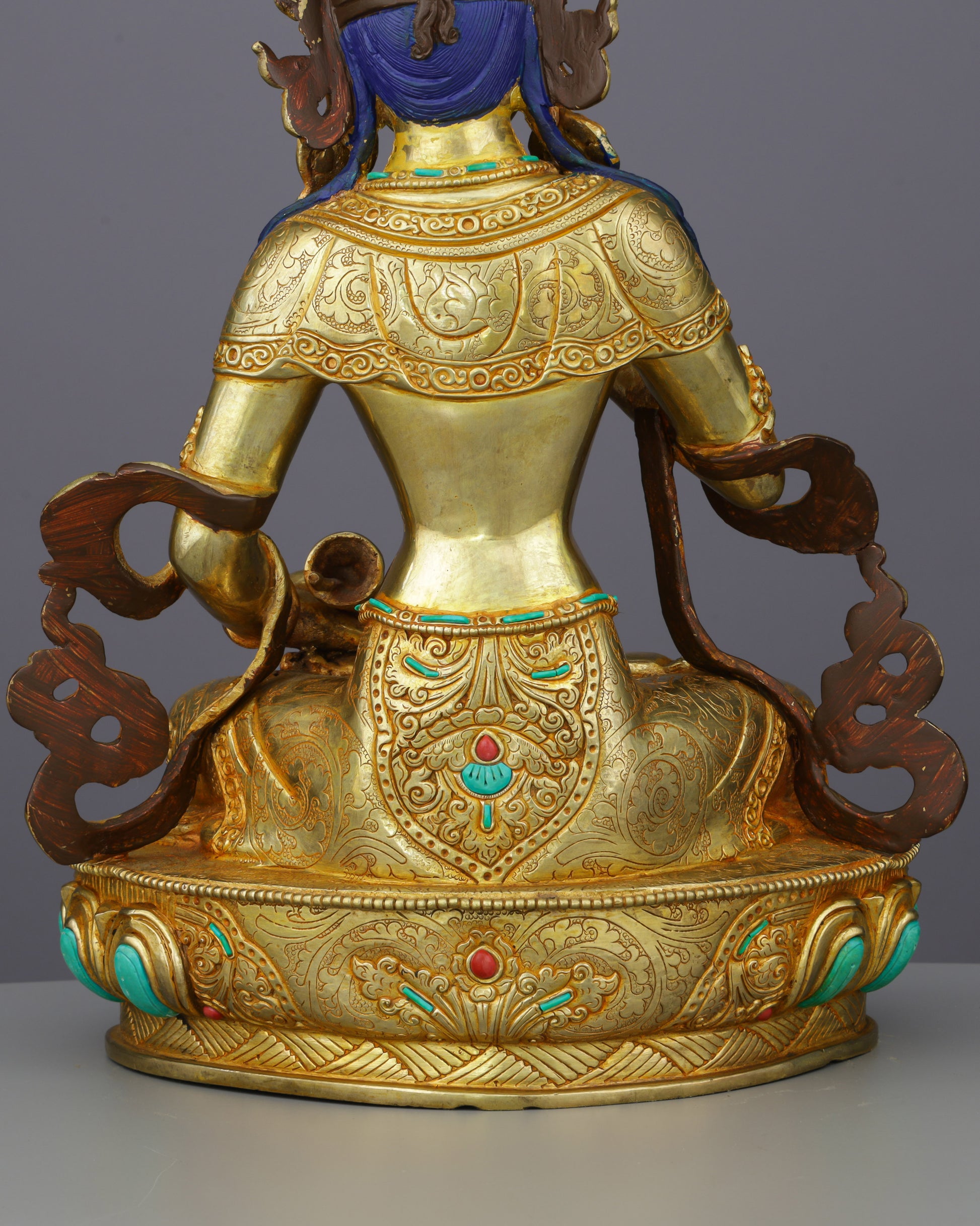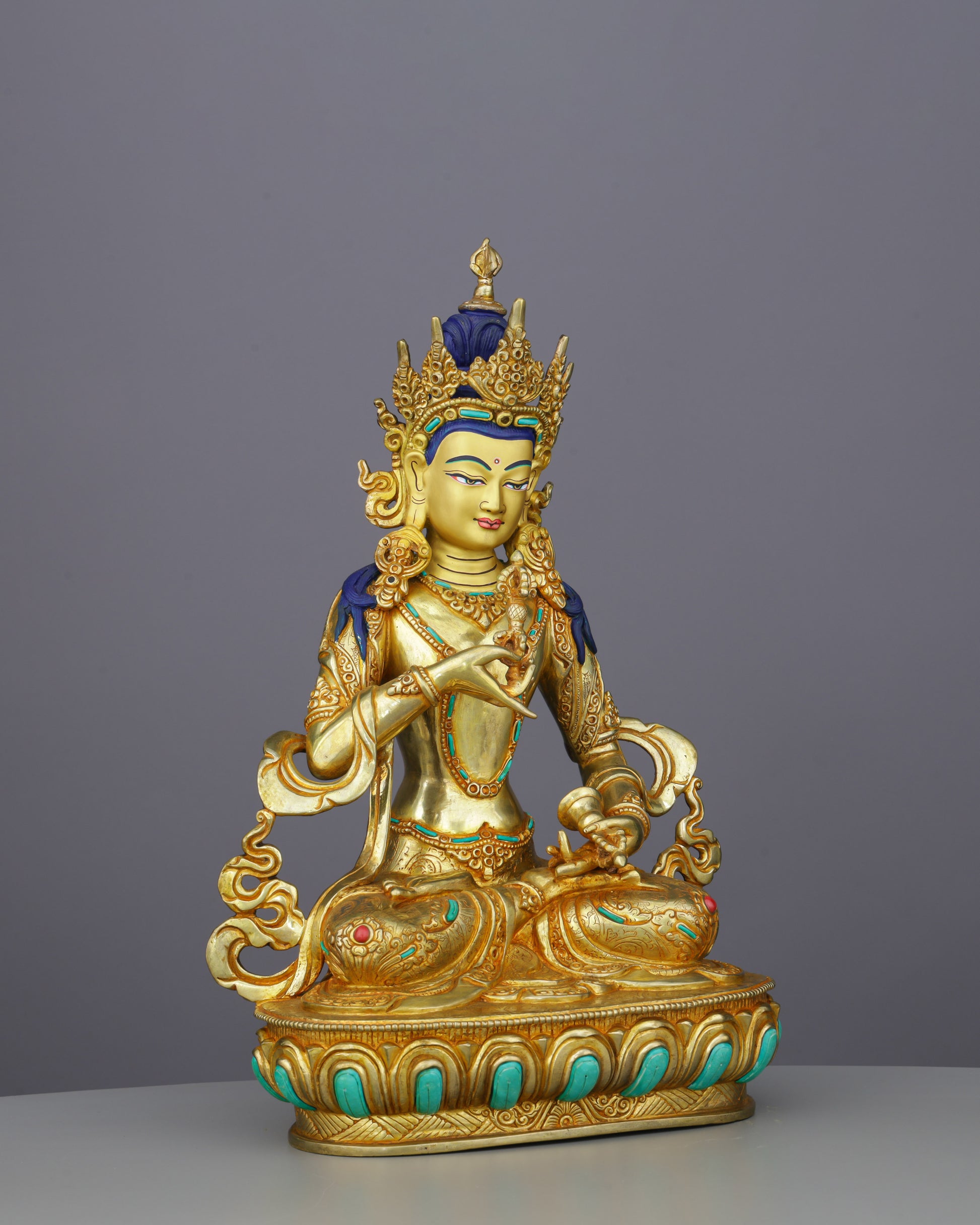 This exceptional Vajrasattva statue showcases premium Nepalese craftsmanship with brilliant 24K gold gilding that radiates pristine luminosity. The substantial copper body ensures authentic durability and traditional construction quality. Standing at an impressive 33 cm and weighing 2.92 kg, this commanding piece offers a powerful presence while maintaining elegant proportions for personal altars. The handcarved turquoise and coral gemstones enhance its sacred beauty, while meticulous gold and acrylic detailing brings every ornamental feature to vivid, dimensional life.